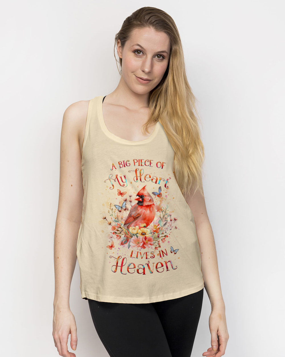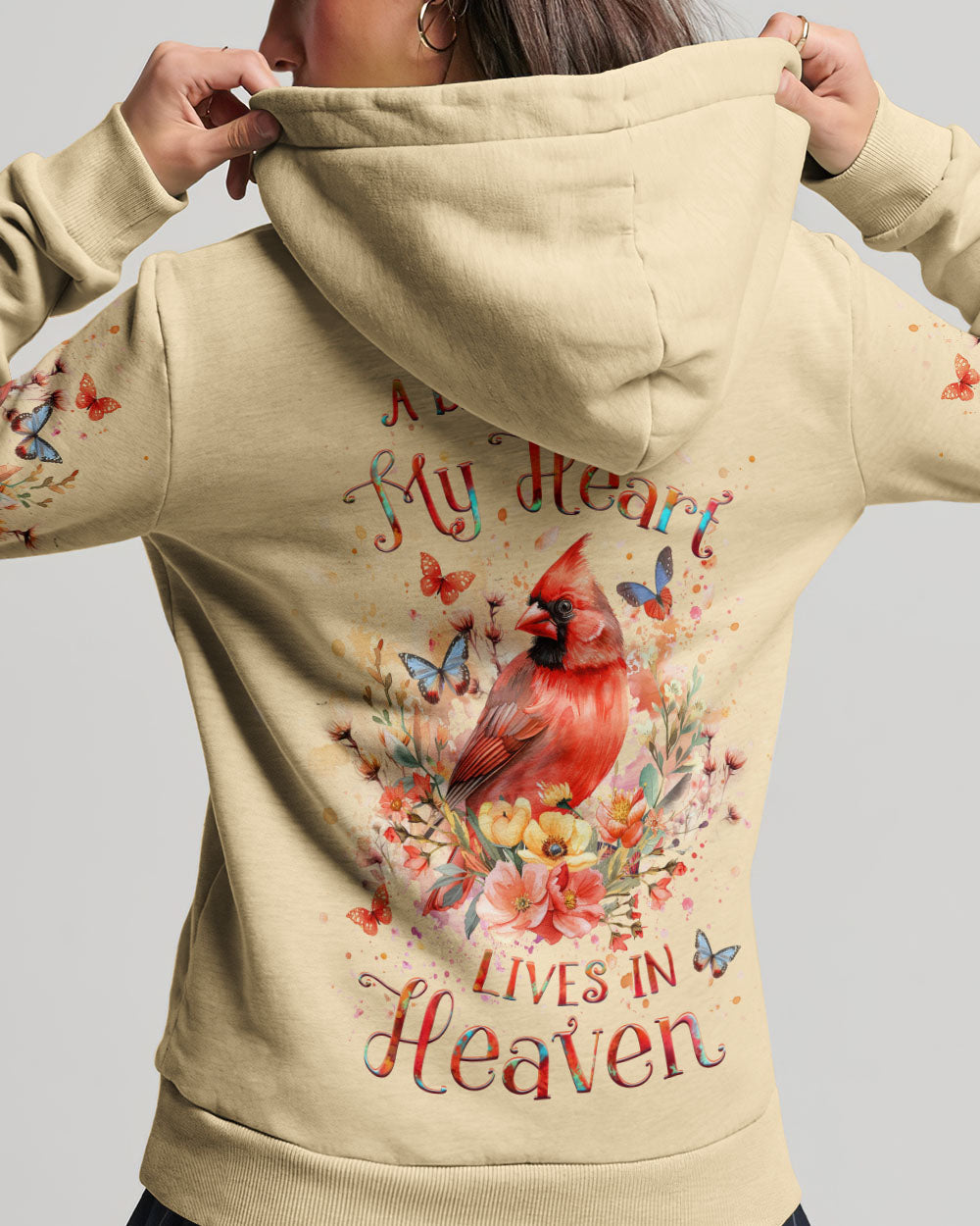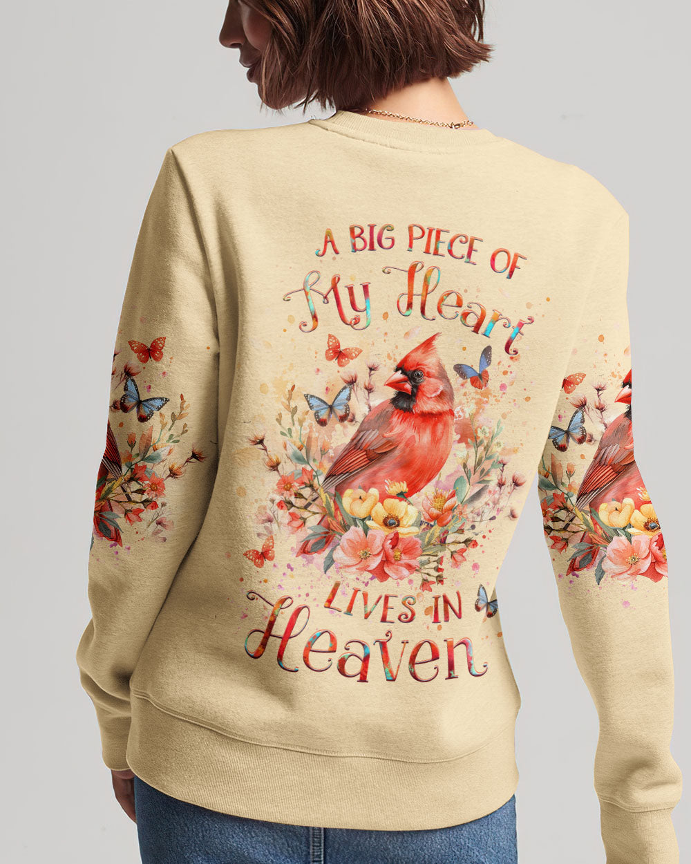 Find solace and strength in our Faith Christ Design shirt. A watercolor cardinal, blooming flowers, and gentle butterflies represent the eternal connection with our loved ones in heaven. The heartfelt quote, "A big piece of my heart lives in heaven," serves as a comforting reminder as you journey through life with faith and grace.