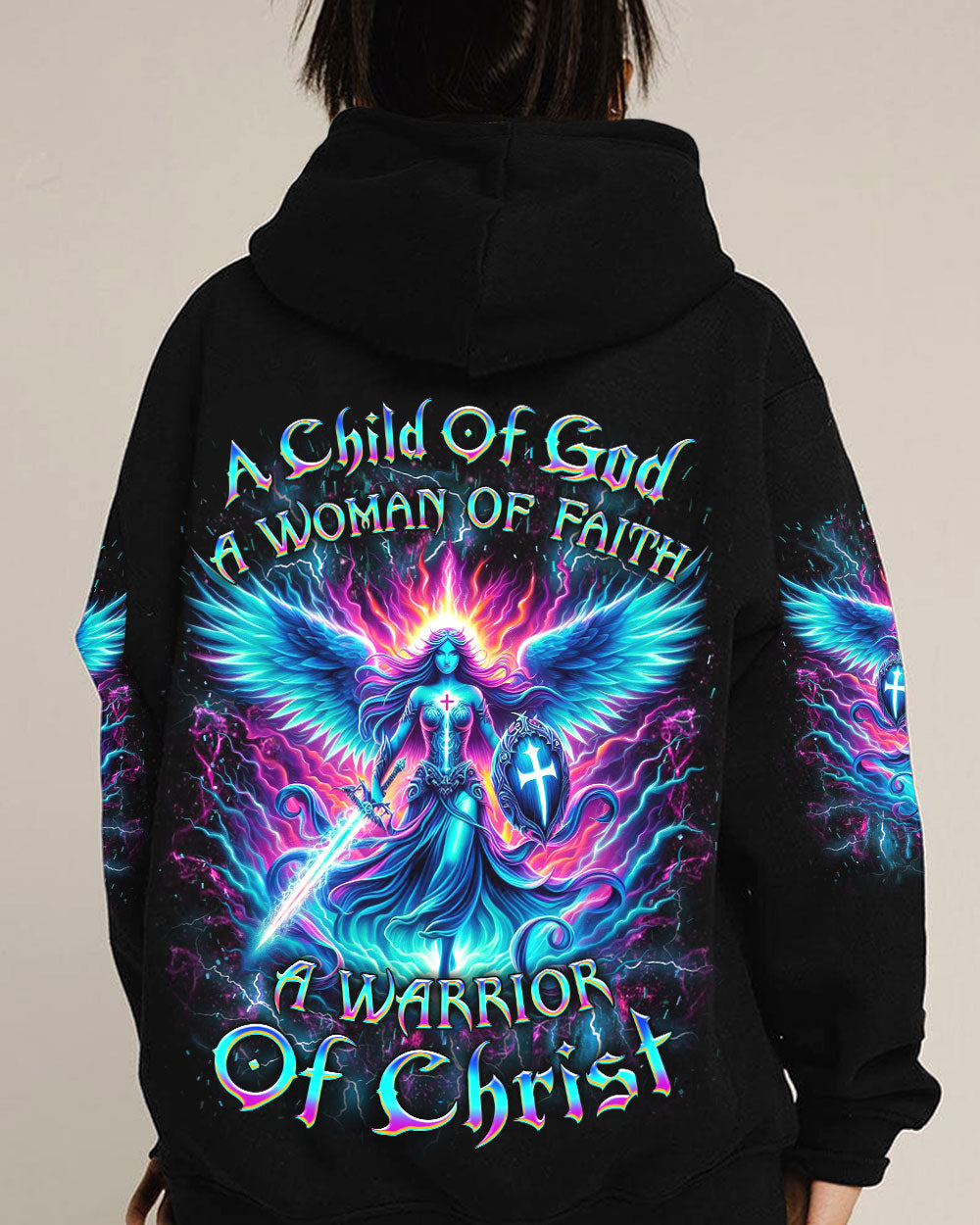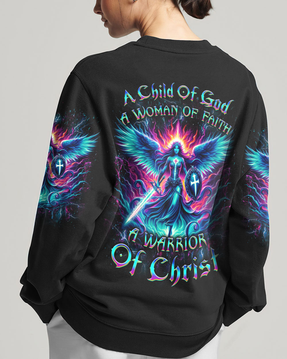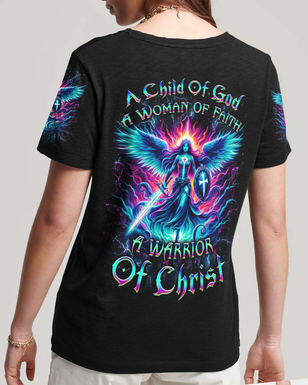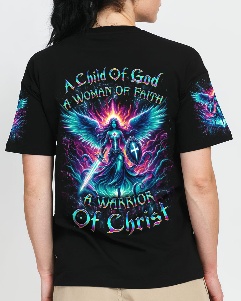 Embrace your spiritual journey with boldness and determination with our captivating "A Child of God, A Woman of Faith" all over print shirt. Featuring a luminous depiction of God's warrior, adorned with majestic wings and wielding a sword, this design emanates strength and faith. Let it inspire you to become a warrior of light and grace.