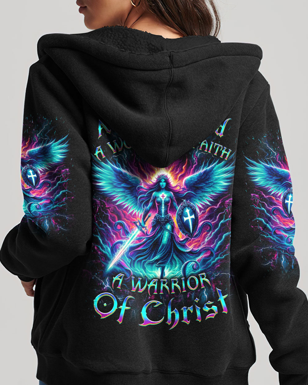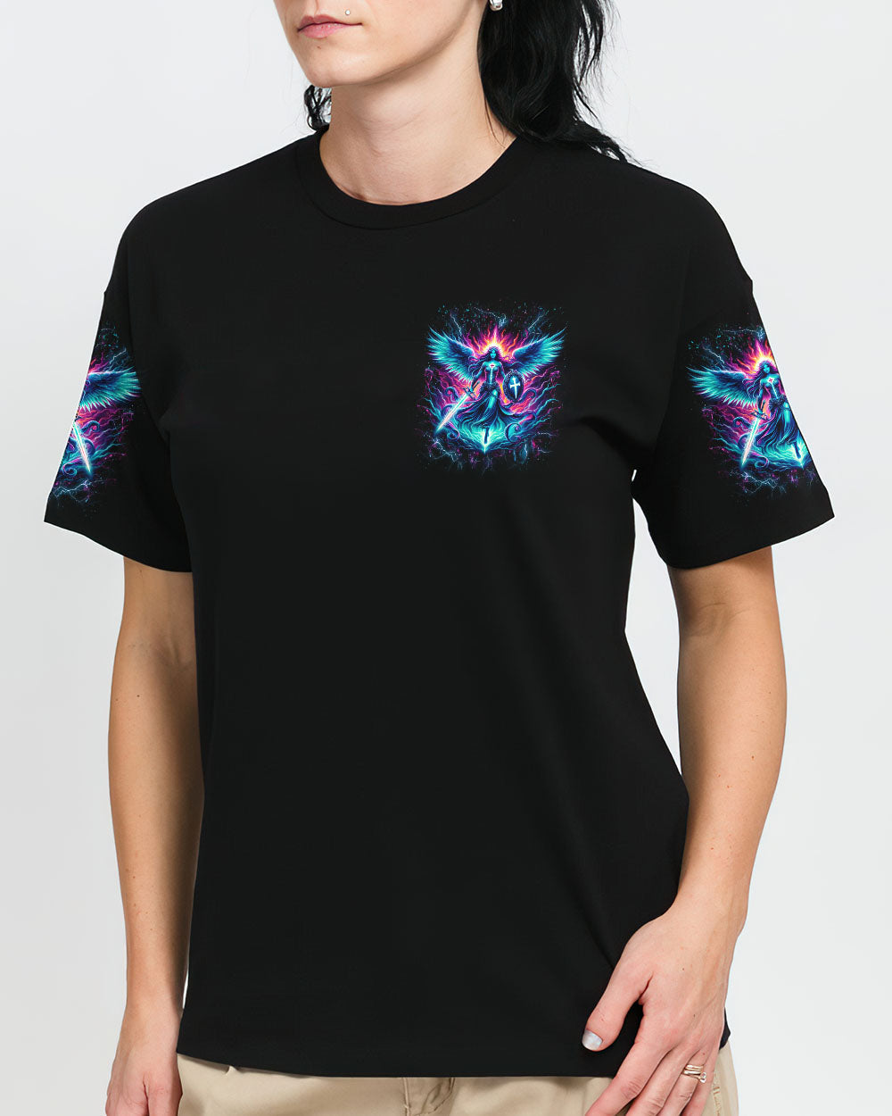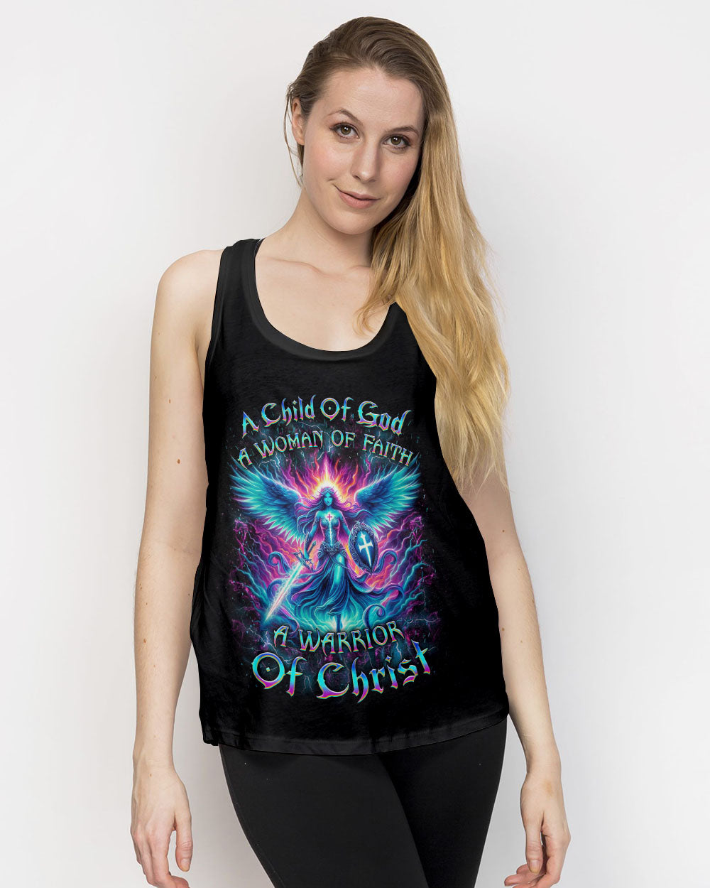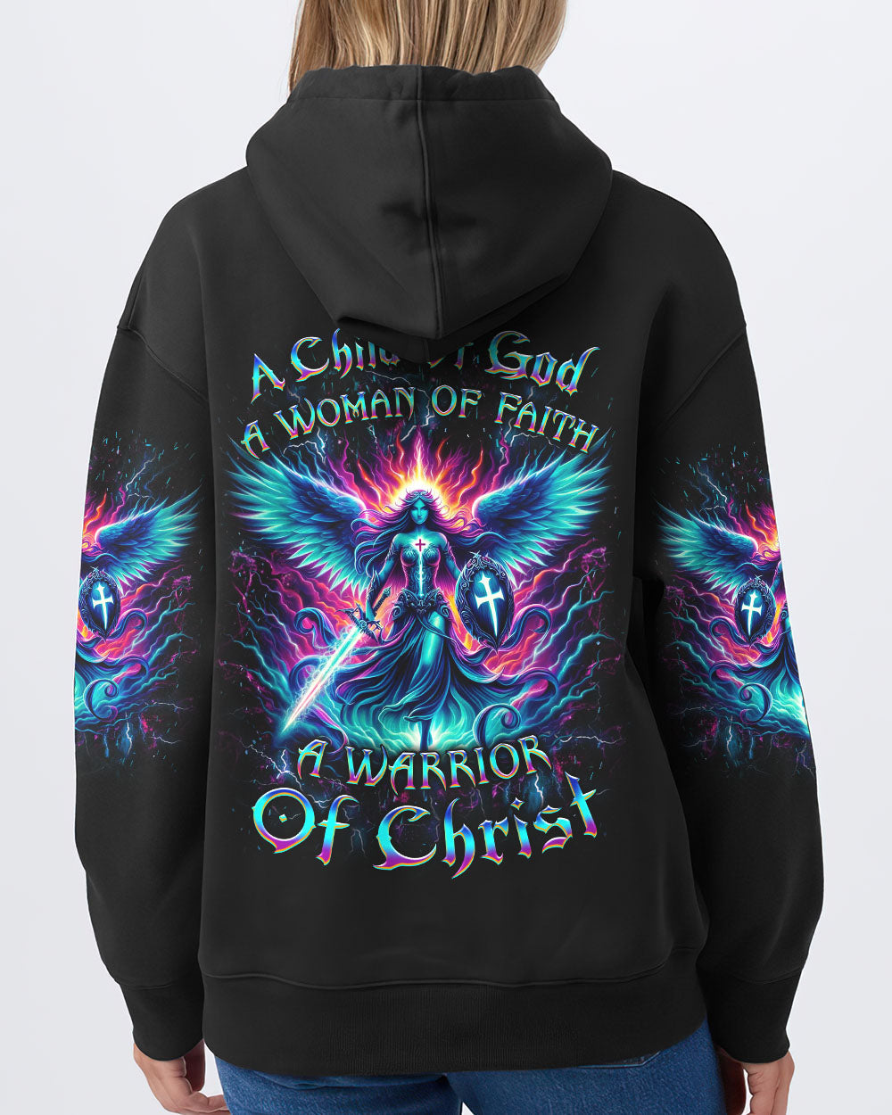 Embrace your spiritual journey with boldness and determination with our captivating "A Child of God, A Woman of Faith" all over print shirt. Featuring a luminous depiction of God's warrior, adorned with majestic wings and wielding a sword, this design emanates strength and faith. Let it inspire you to become a warrior of light and grace.