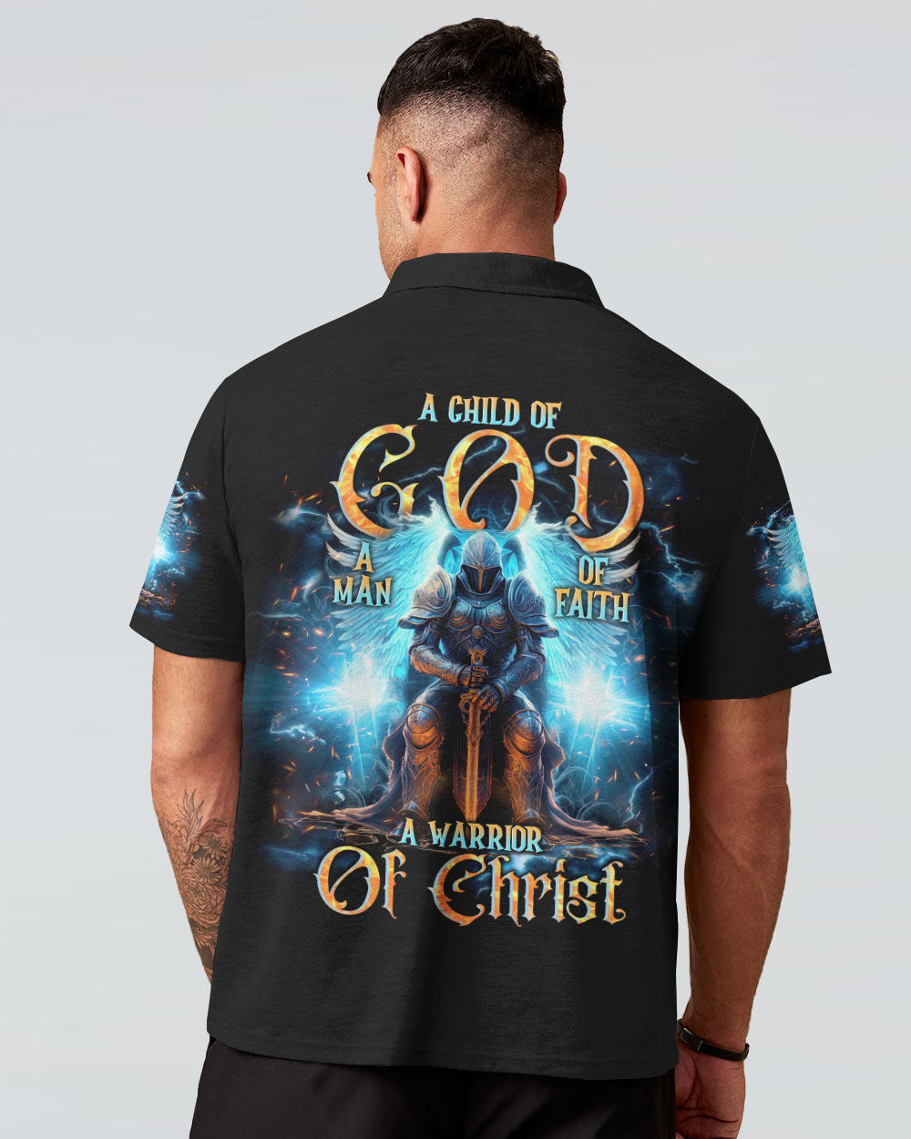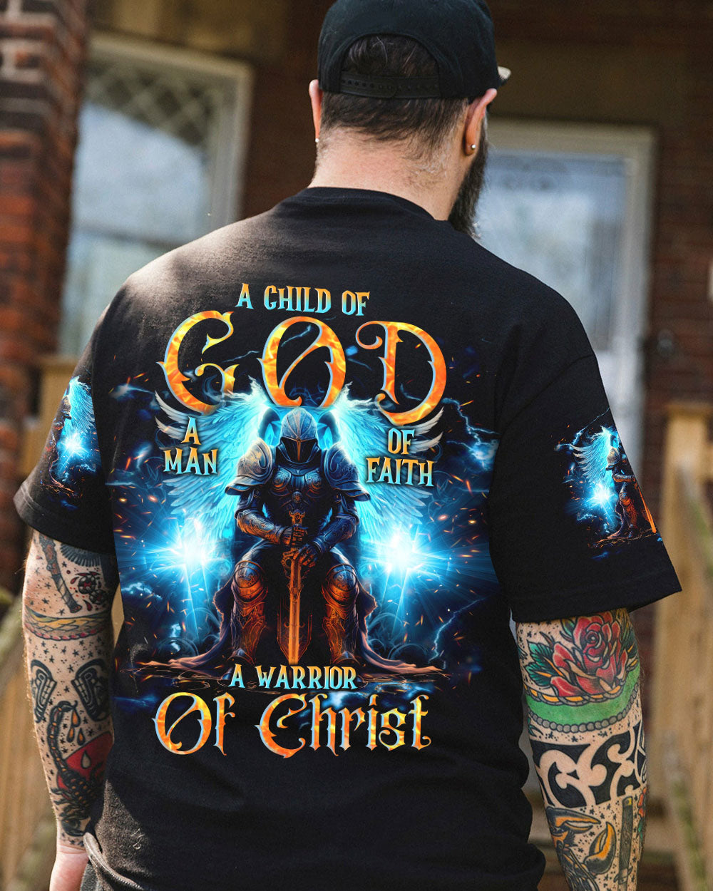 This all over print men's shirt features a bold design celebrating a life of faith. With its heroic quote of "A child of God, a man of faith, a Warrior of Christ," it's the perfect way to declare the courage and conviction of spiritual warfare. Show your unwavering commitment and embrace the power of Jesus.