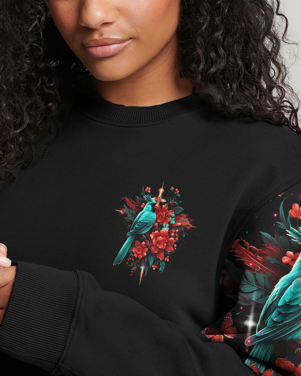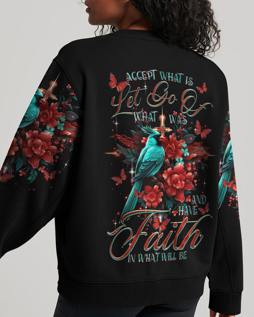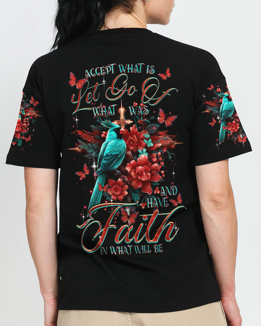 "Find inspiration in our Cardinal Women's All Over Print Shirt. Embrace the message of acceptance and renewal with a stunning cross design and the symbolic red cardinal bird. Let go of the past, have faith in the future - and trust in a divine plan. Available now - embrace the journey."