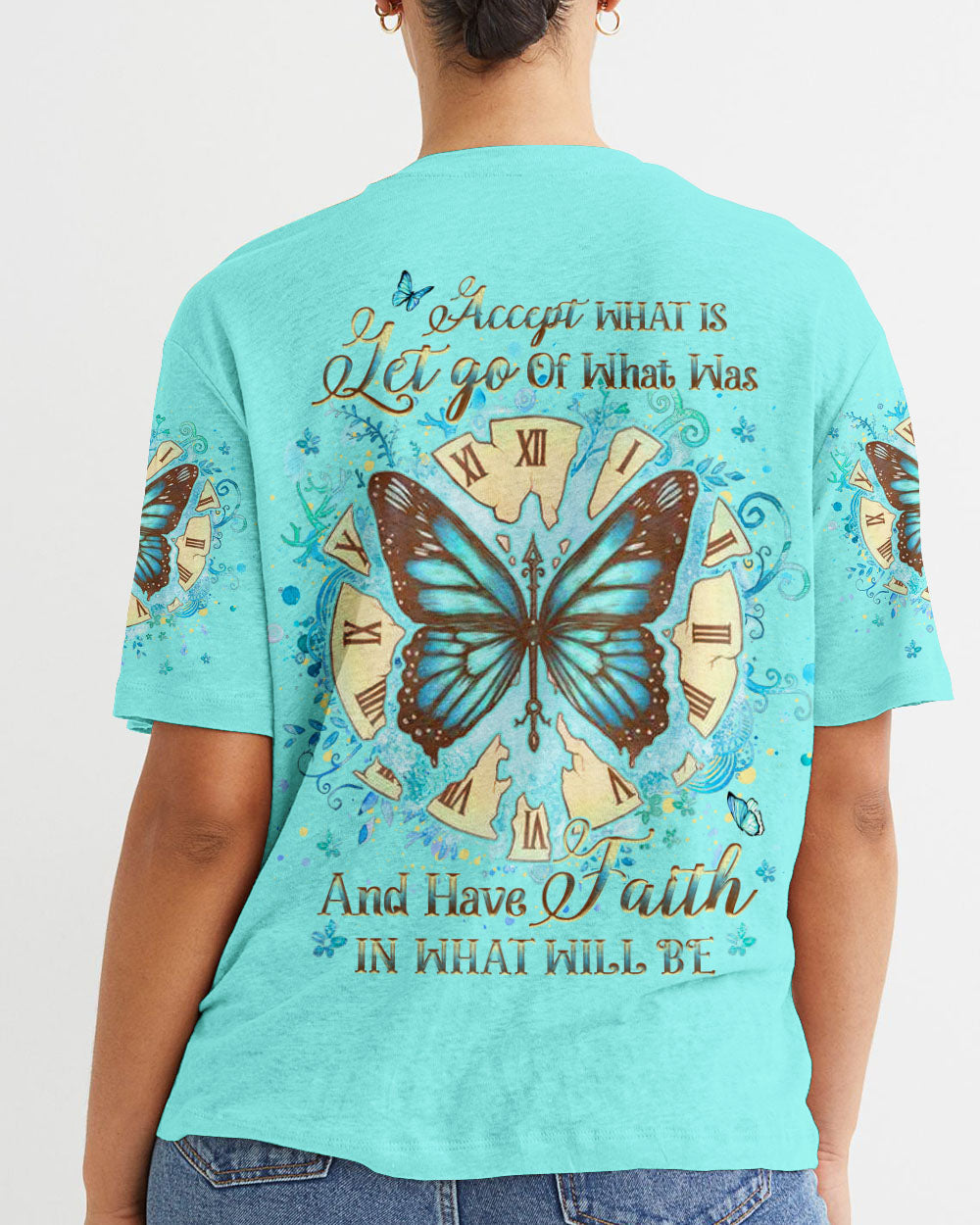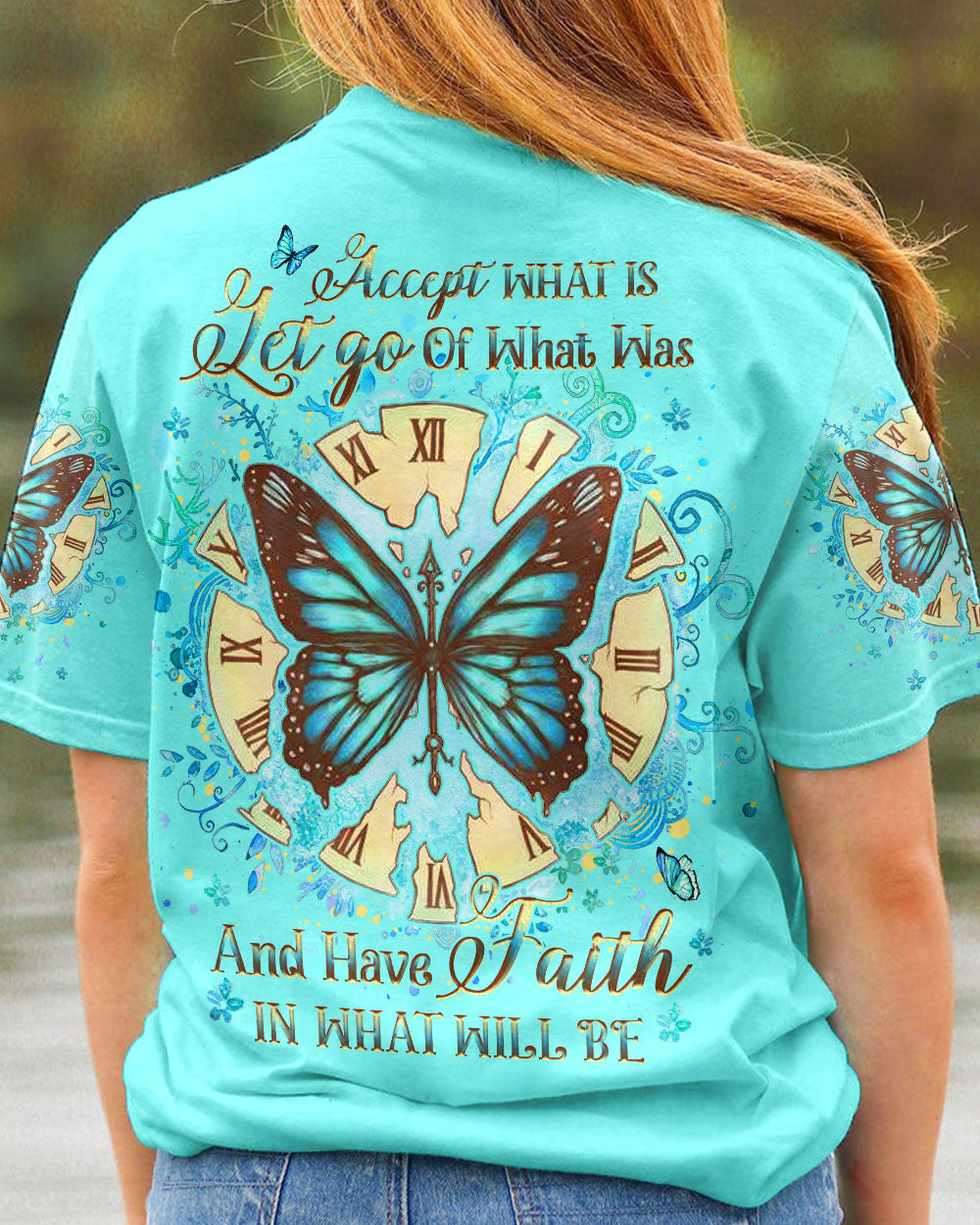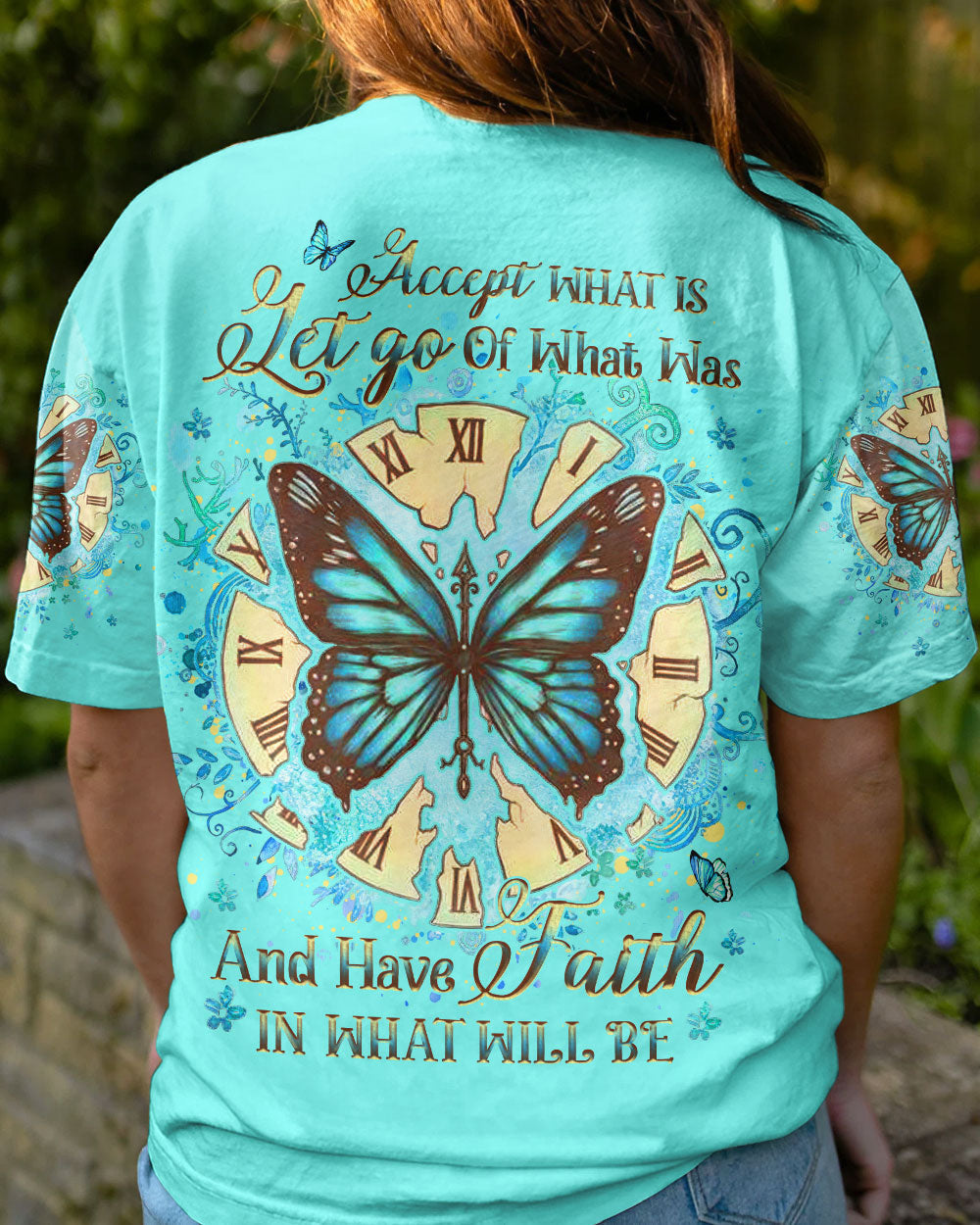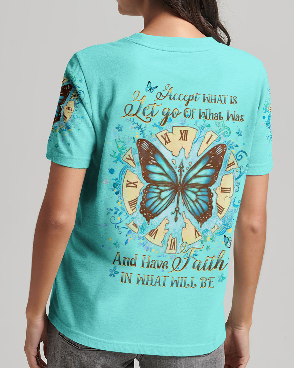 Our Accept What Is Let Go Of What Was Women's All Over Print Shirt is the perfect combination of inspirational design and comfort. Featuring an uplifting quote, empowering butterfly wings, and a reminder to have faith in both the present and the future, this shirt is both an inviting source of comfort and a powerful reminder of transformation and resilience. Perfect for those on a life-changing journey.