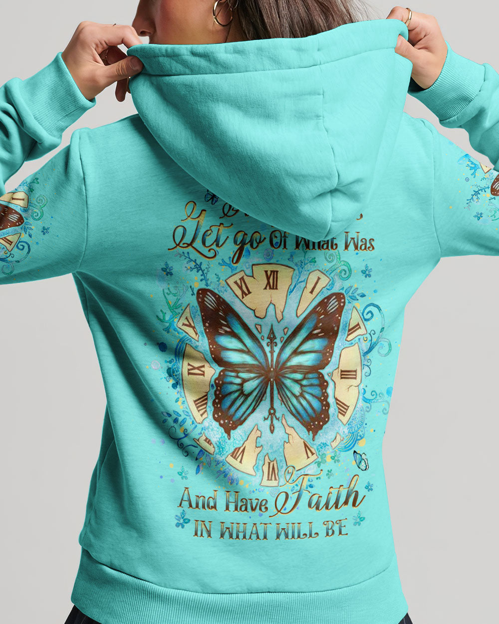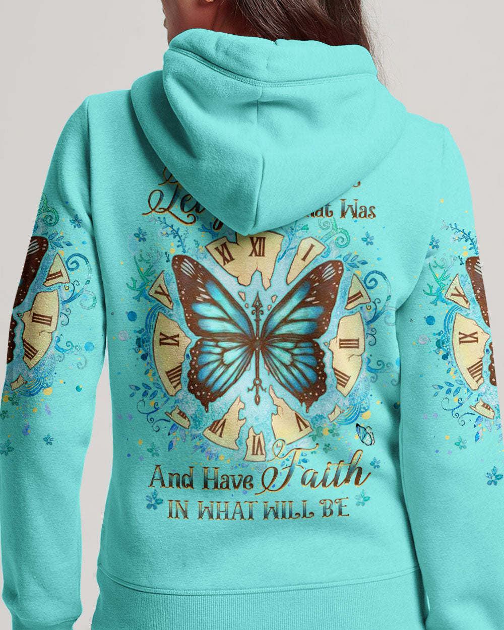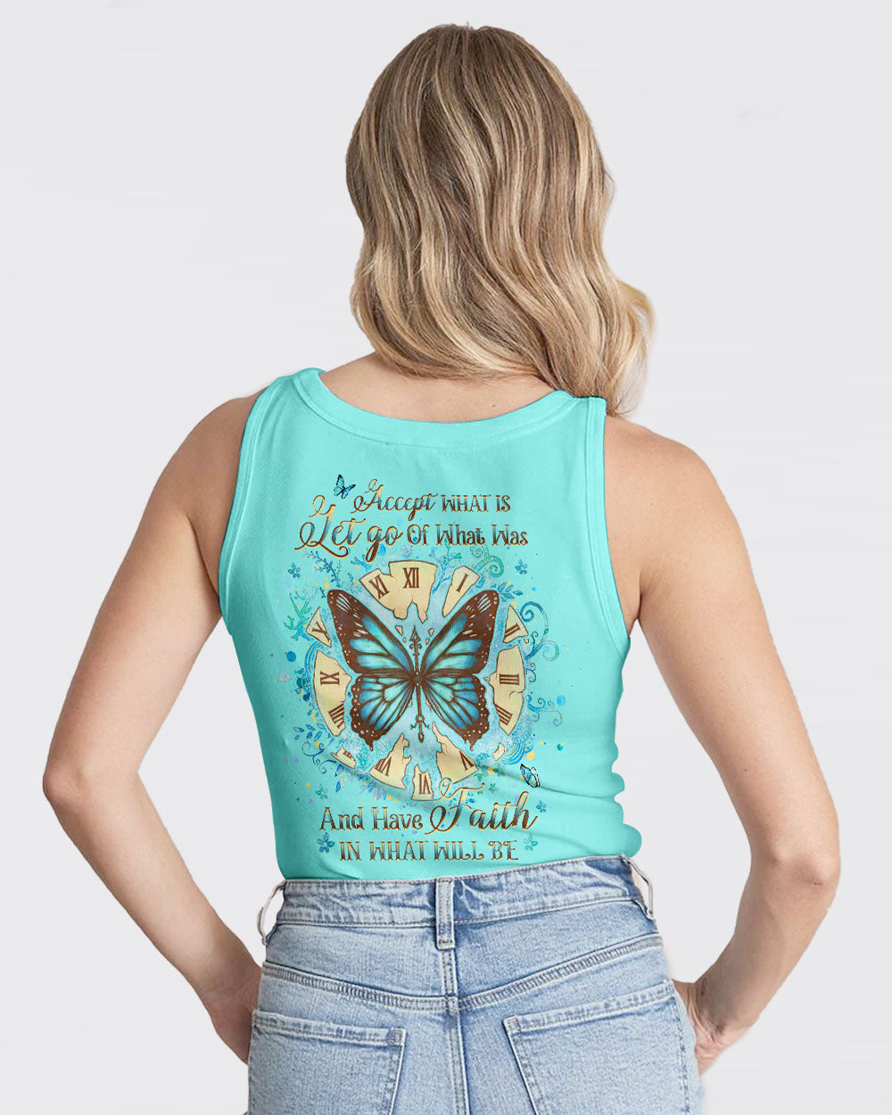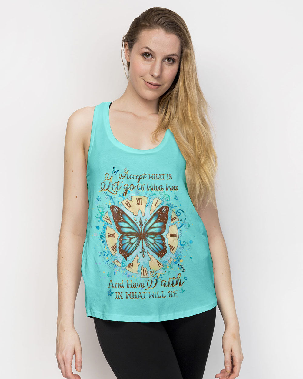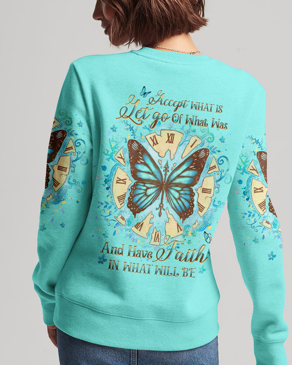Our Accept What Is Let Go Of What Was Women's All Over Print Shirt is the perfect combination of inspirational design and comfort. Featuring an uplifting quote, empowering butterfly wings, and a reminder to have faith in both the present and the future, this shirt is both an inviting source of comfort and a powerful reminder of transformation and resilience. Perfect for those on a life-changing journey.