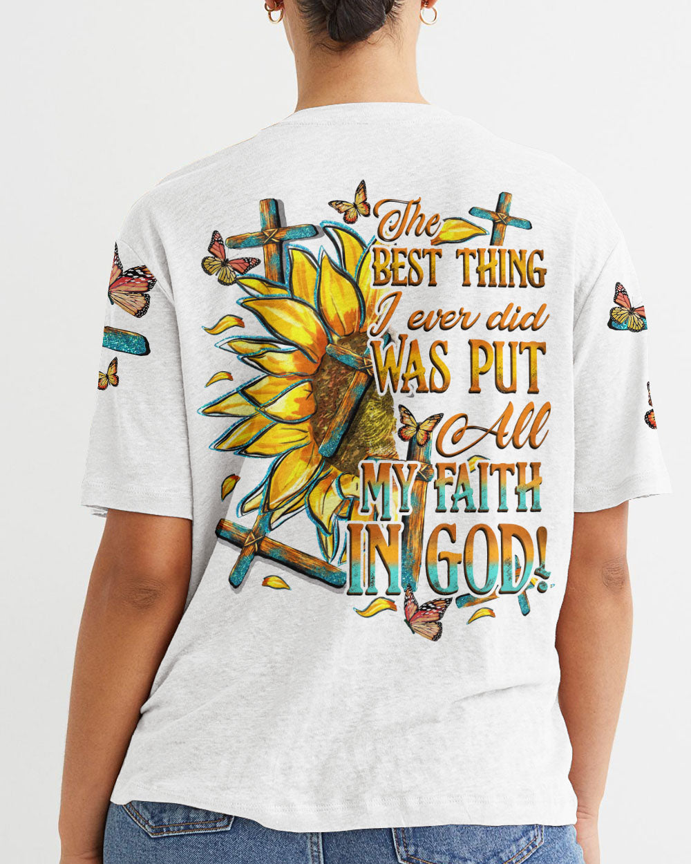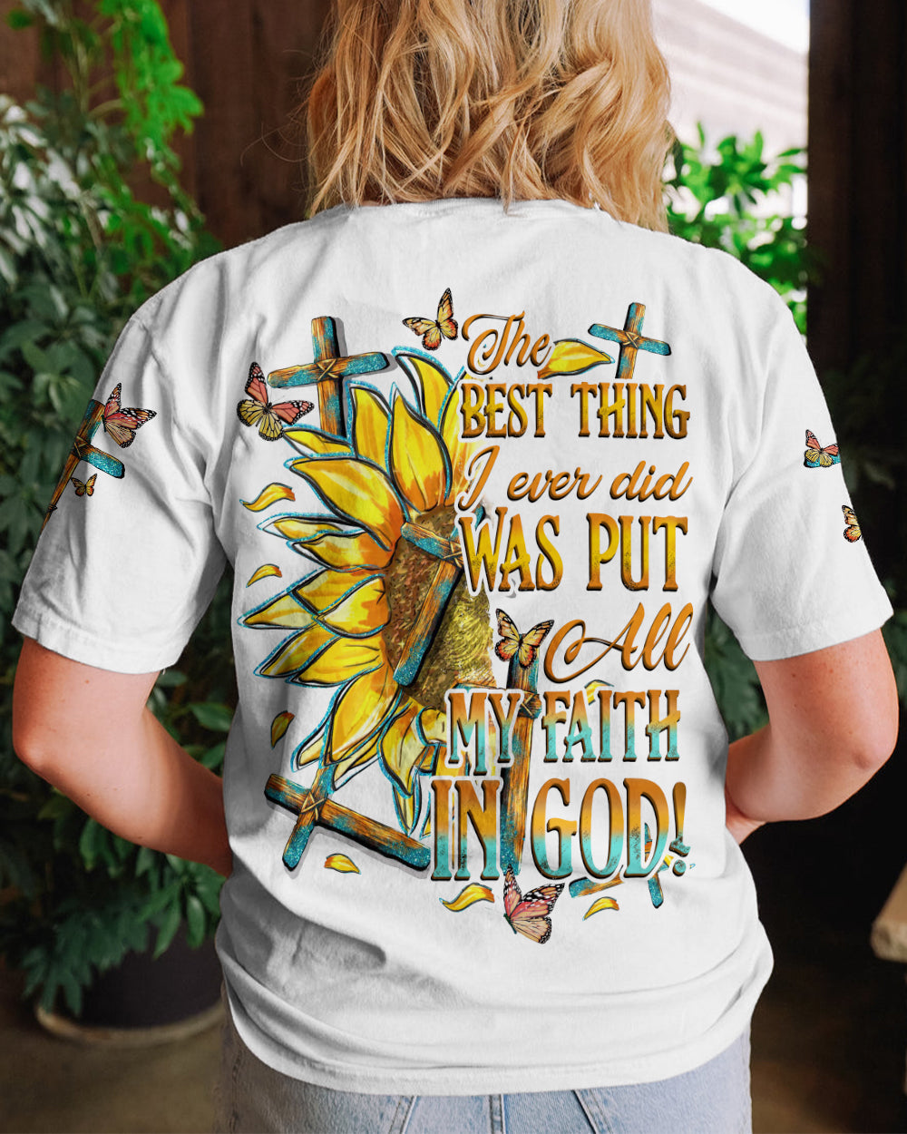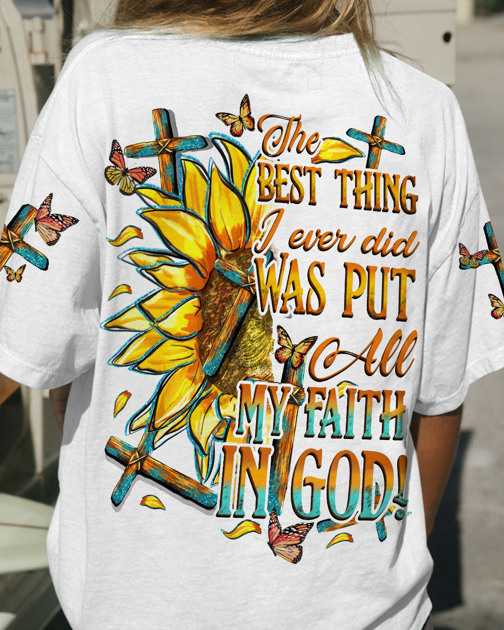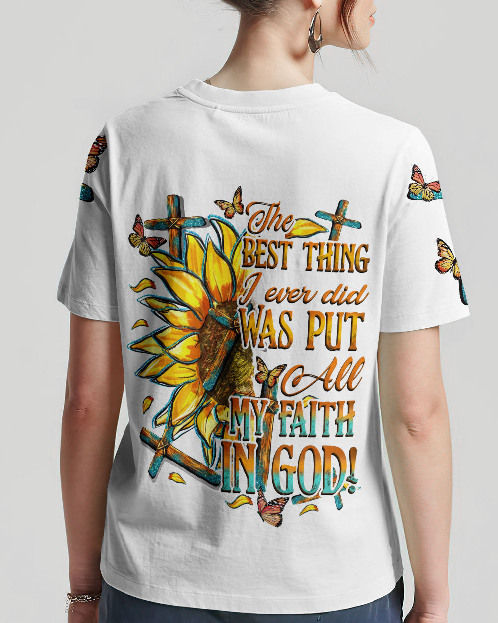 Discover an inspiring look to celebrate your faith with the All My Faith in God Women's All Over Print Shirt. Featuring a captivating blend of crosses, vibrant sunflowers, graceful butterflies, and the empowering quote "The Best Thing I Ever Did Was Put All My Faith in God!", this shirt will become a symbol of your unwavering belief and a reminder to embrace the power of complete trust in God. Show off the beauty of your faith with this remarkable piece that speaks directly to your soul.