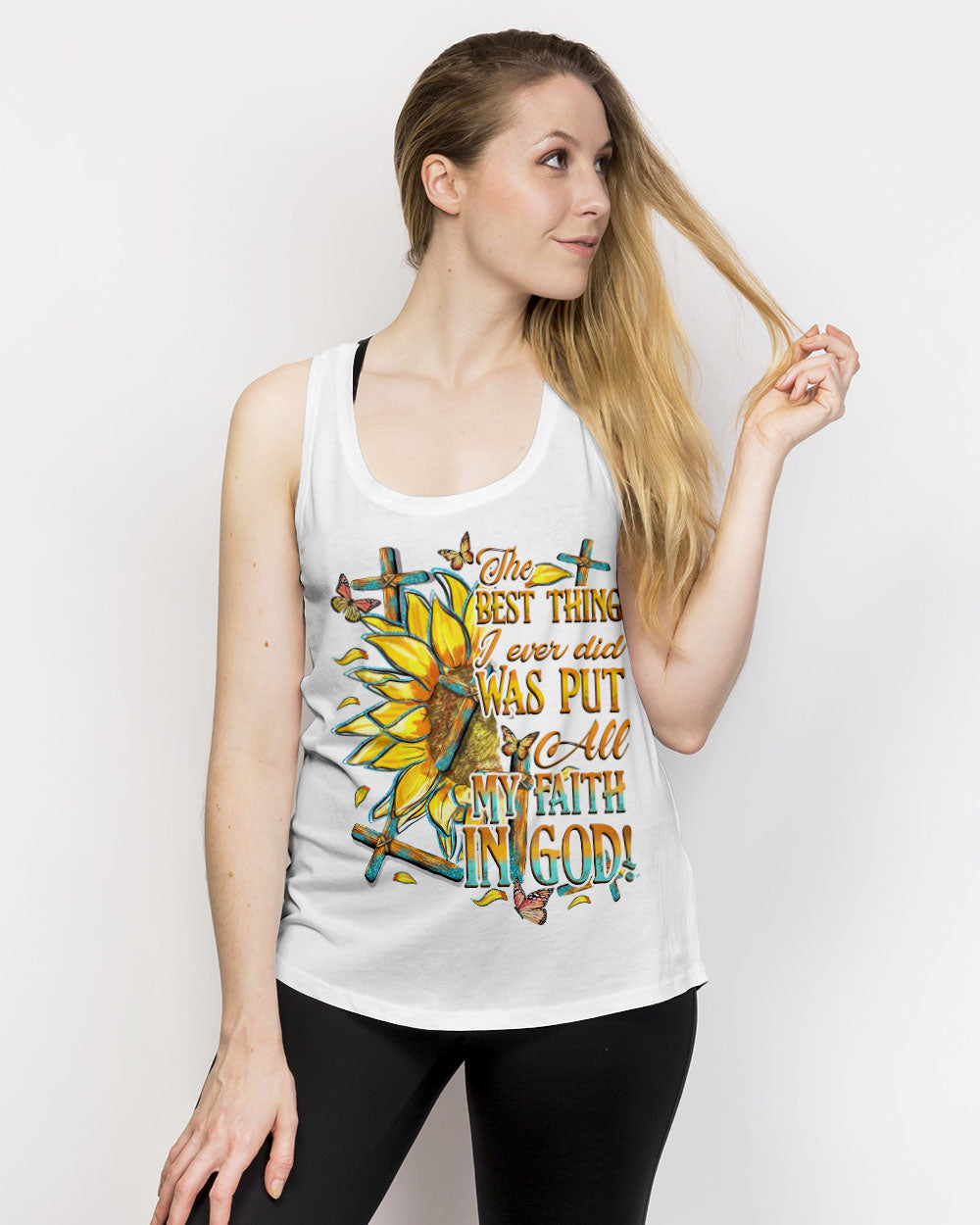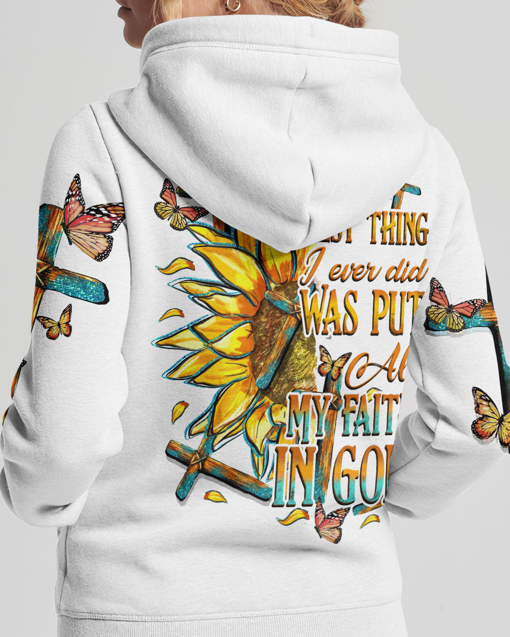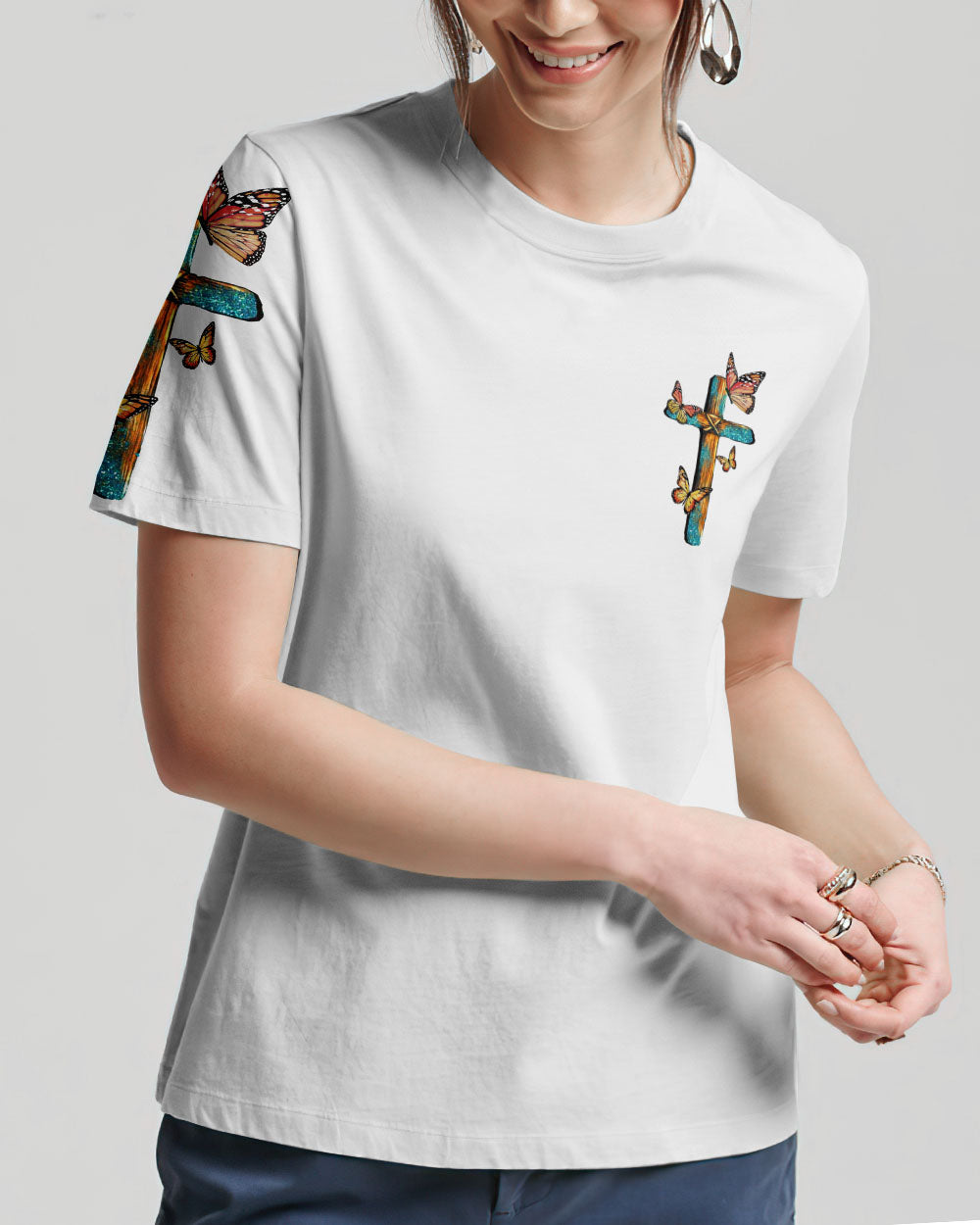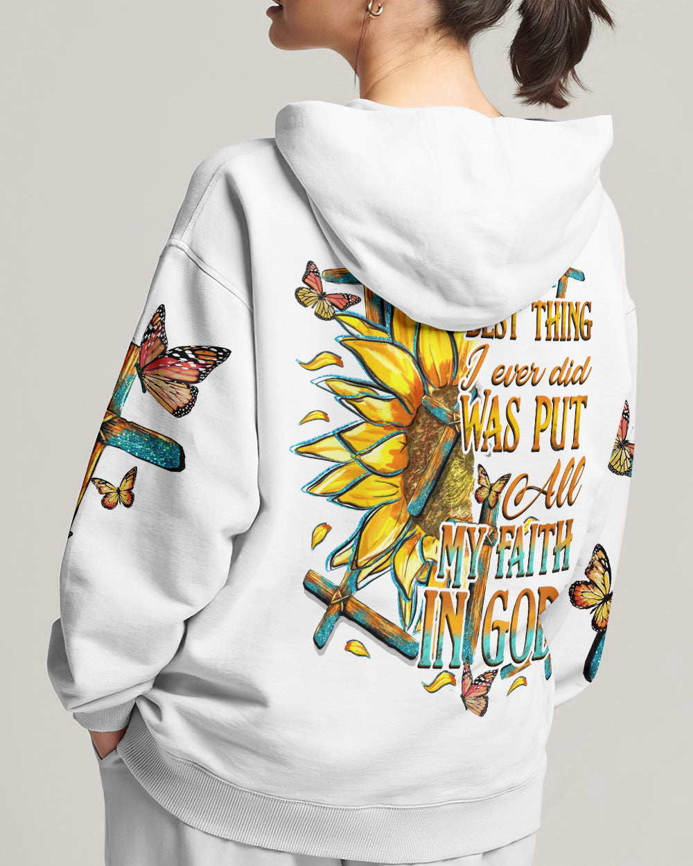 Discover an inspiring look to celebrate your faith with the All My Faith in God Women's All Over Print Shirt. Featuring a captivating blend of crosses, vibrant sunflowers, graceful butterflies, and the empowering quote "The Best Thing I Ever Did Was Put All My Faith in God!", this shirt will become a symbol of your unwavering belief and a reminder to embrace the power of complete trust in God. Show off the beauty of your faith with this remarkable piece that speaks directly to your soul.
