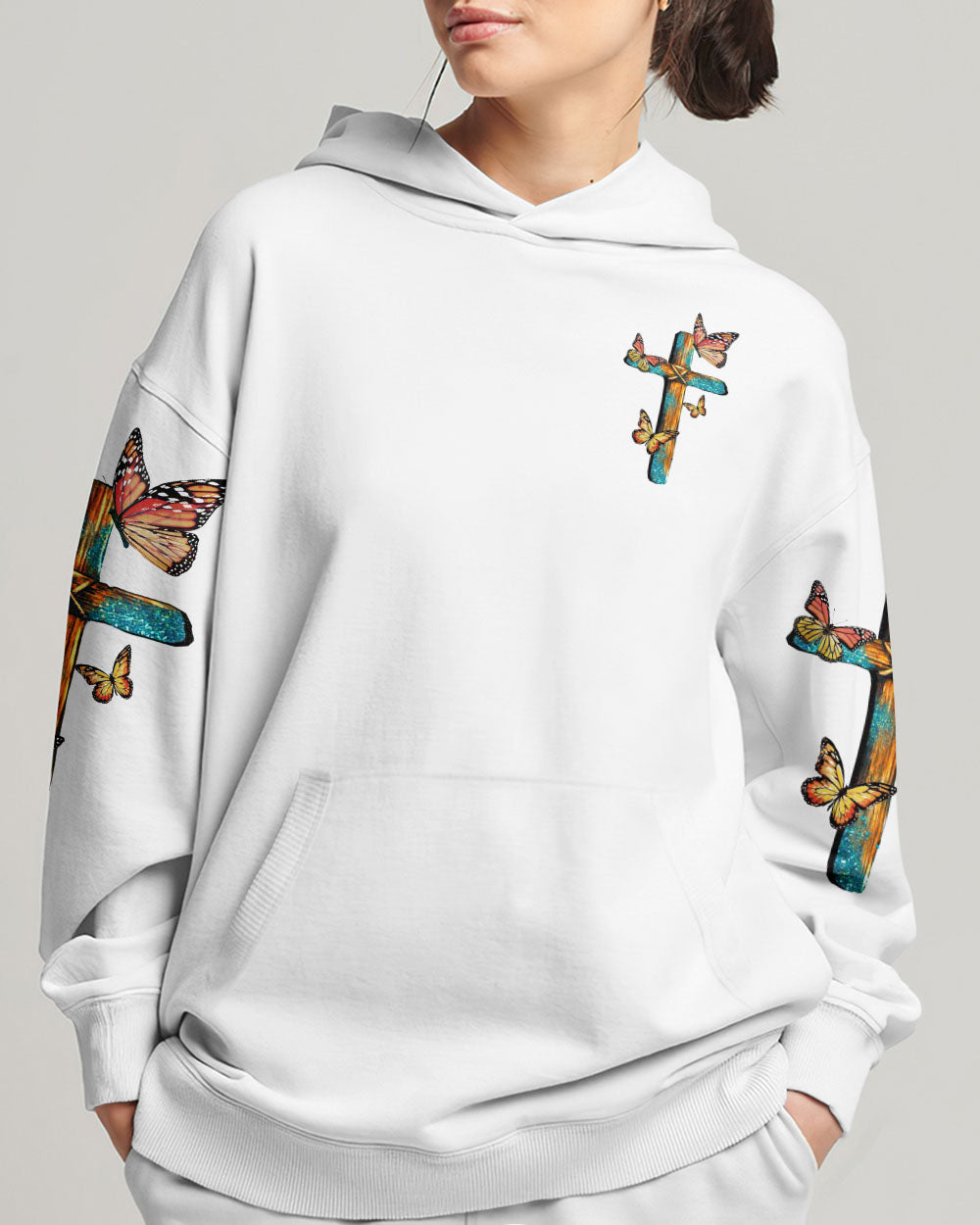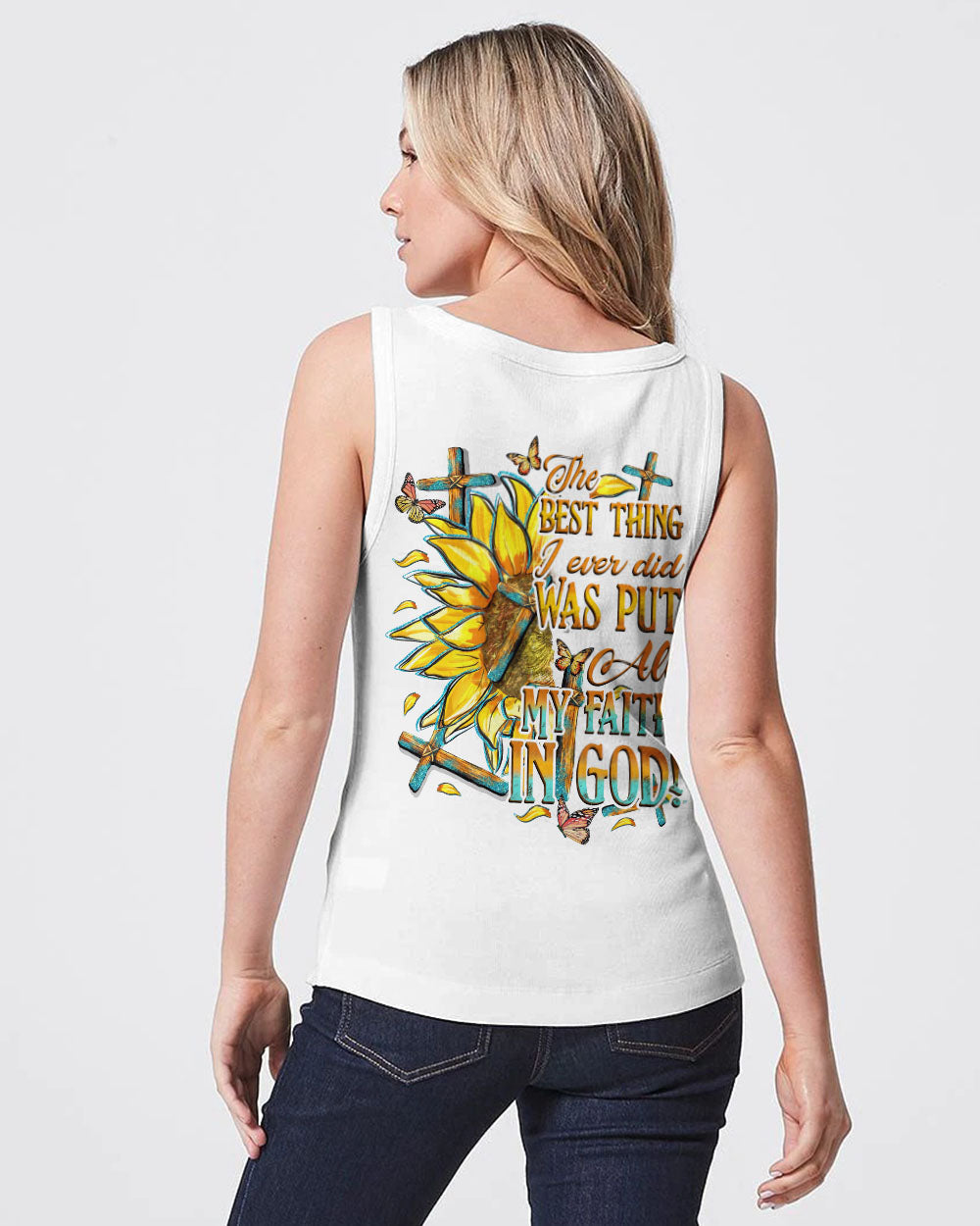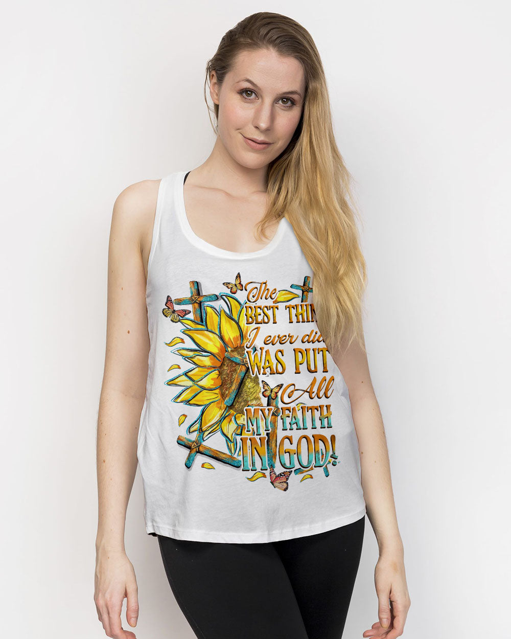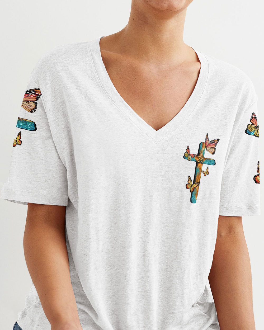Discover an inspiring look to celebrate your faith with the All My Faith in God Women's All Over Print Shirt. Featuring a captivating blend of crosses, vibrant sunflowers, graceful butterflies, and the empowering quote "The Best Thing I Ever Did Was Put All My Faith in God!", this shirt will become a symbol of your unwavering belief and a reminder to embrace the power of complete trust in God. Show off the beauty of your faith with this remarkable piece that speaks directly to your soul.