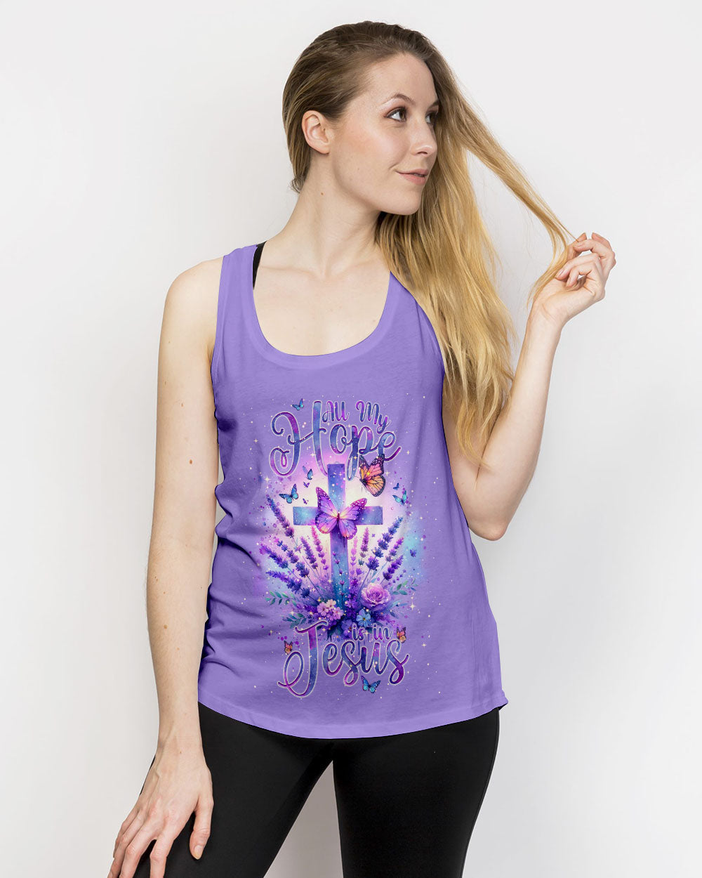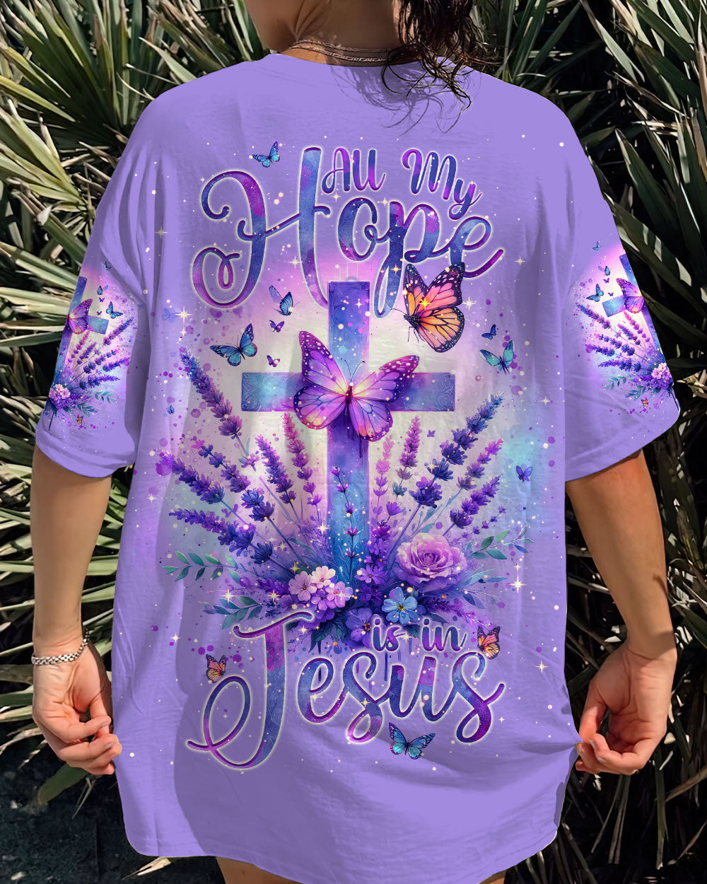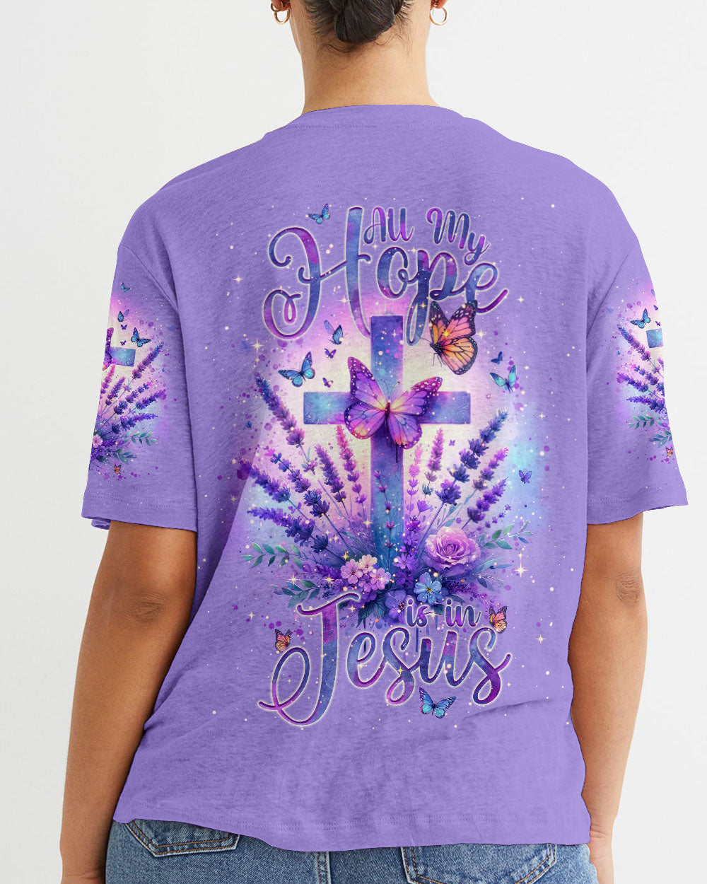 Experience serenity and strengthen your faith with our All My Hope Is In Jesus Lavender Women's All Over Print Shirt. The intertwined cross and lavender design embodies a deep belief in Jesus and the saying, "All my hope is in Jesus," promises unwavering hope, strength, and comfort during uncertain times.