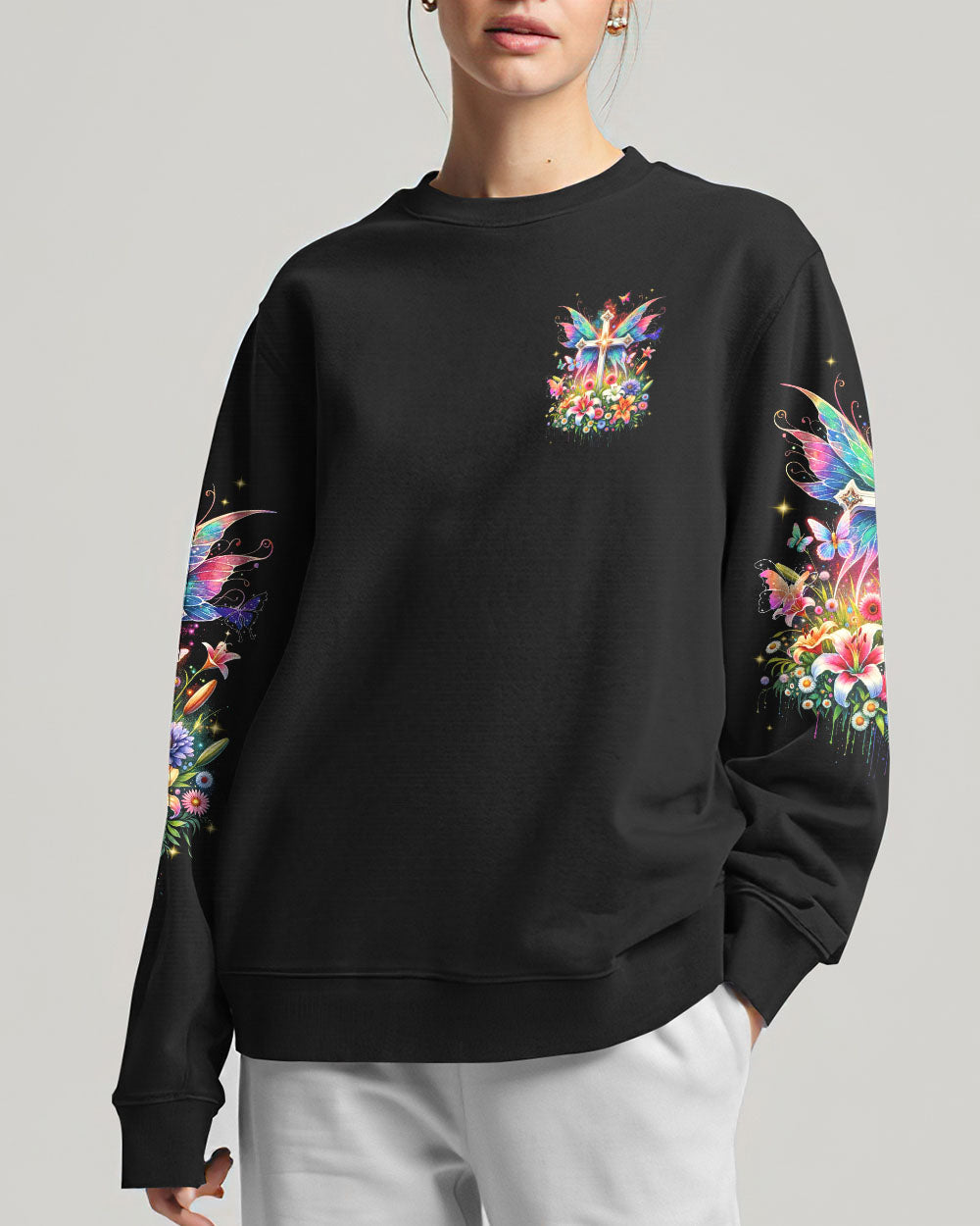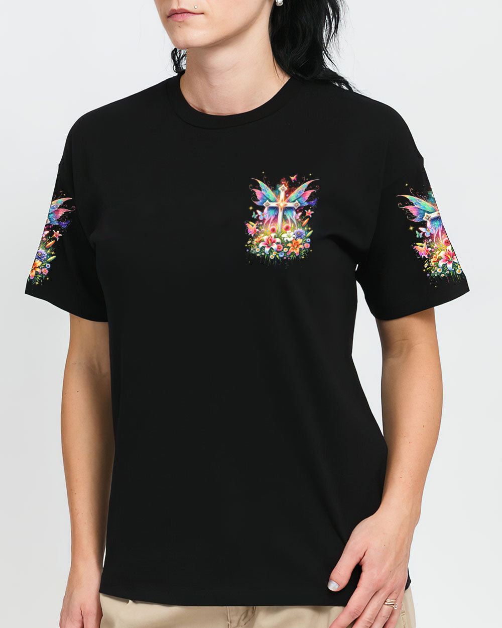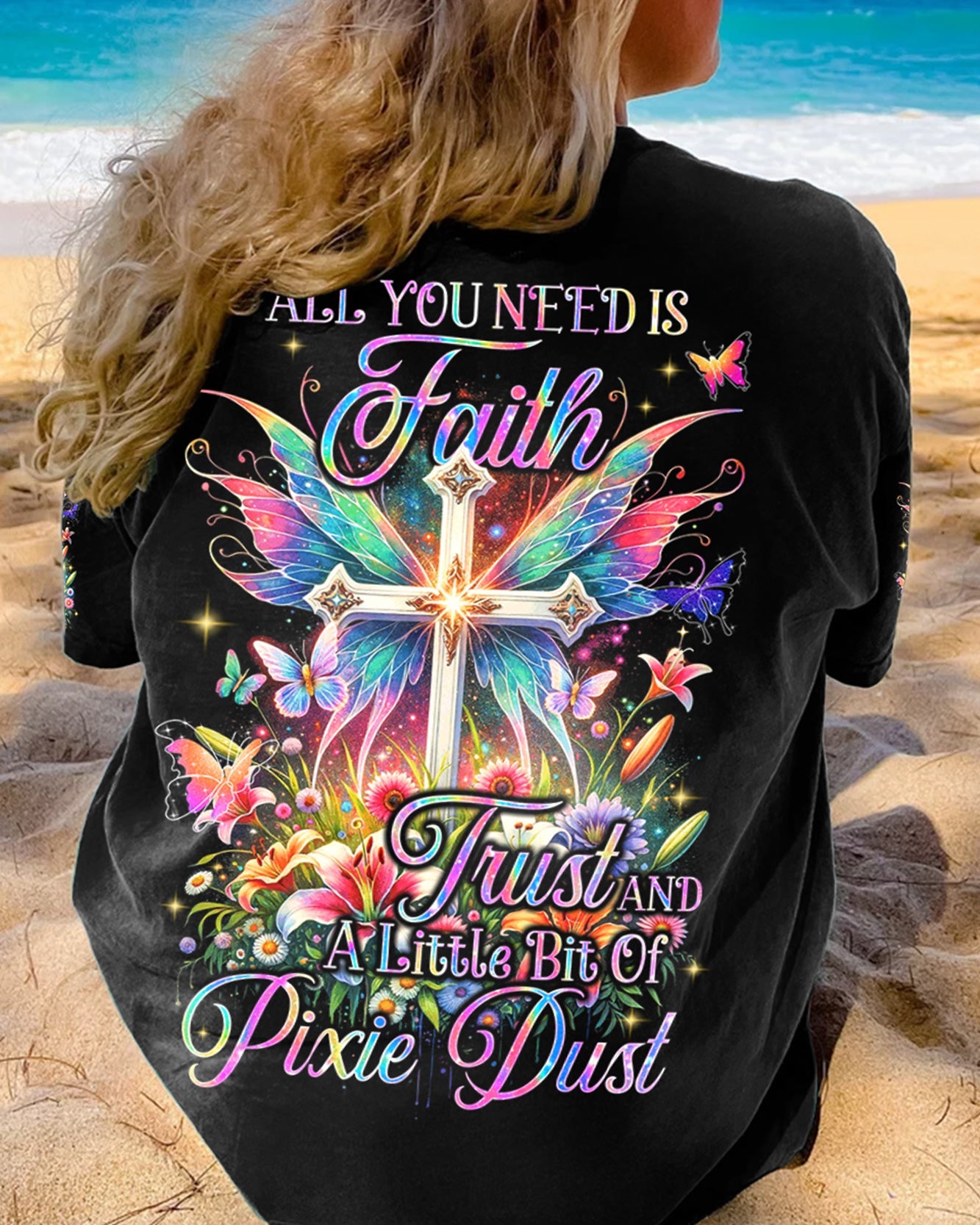Enter a realm of enchantment where Christian faith intertwines seamlessly with magic through our captivating design. The cross and ethereal fairy wings forge a profound link between the divine and the whimsical, while blossoming flowers and butterflies signify spiritual growth and transformation. Infused with a sprinkle of fairy dust, our design radiates wonder and inspiration. Accompanied by the poignant quote, "All You Need Is Faith, trust, and a little bit of pixie dust," it serves as a reminder that faith can surmount obstacles and bring forth the extraordinary. Embark on a journey with this remarkable design today and let your faith take flight!