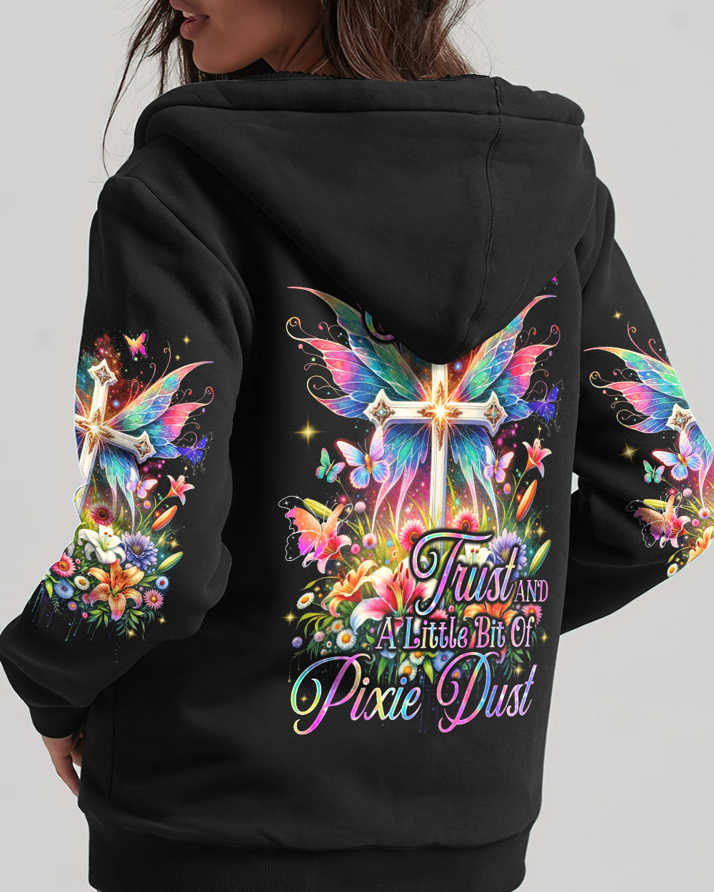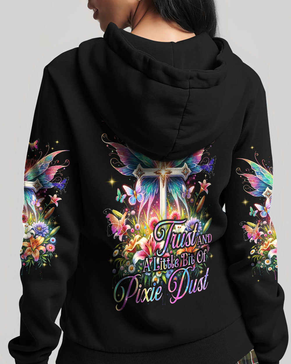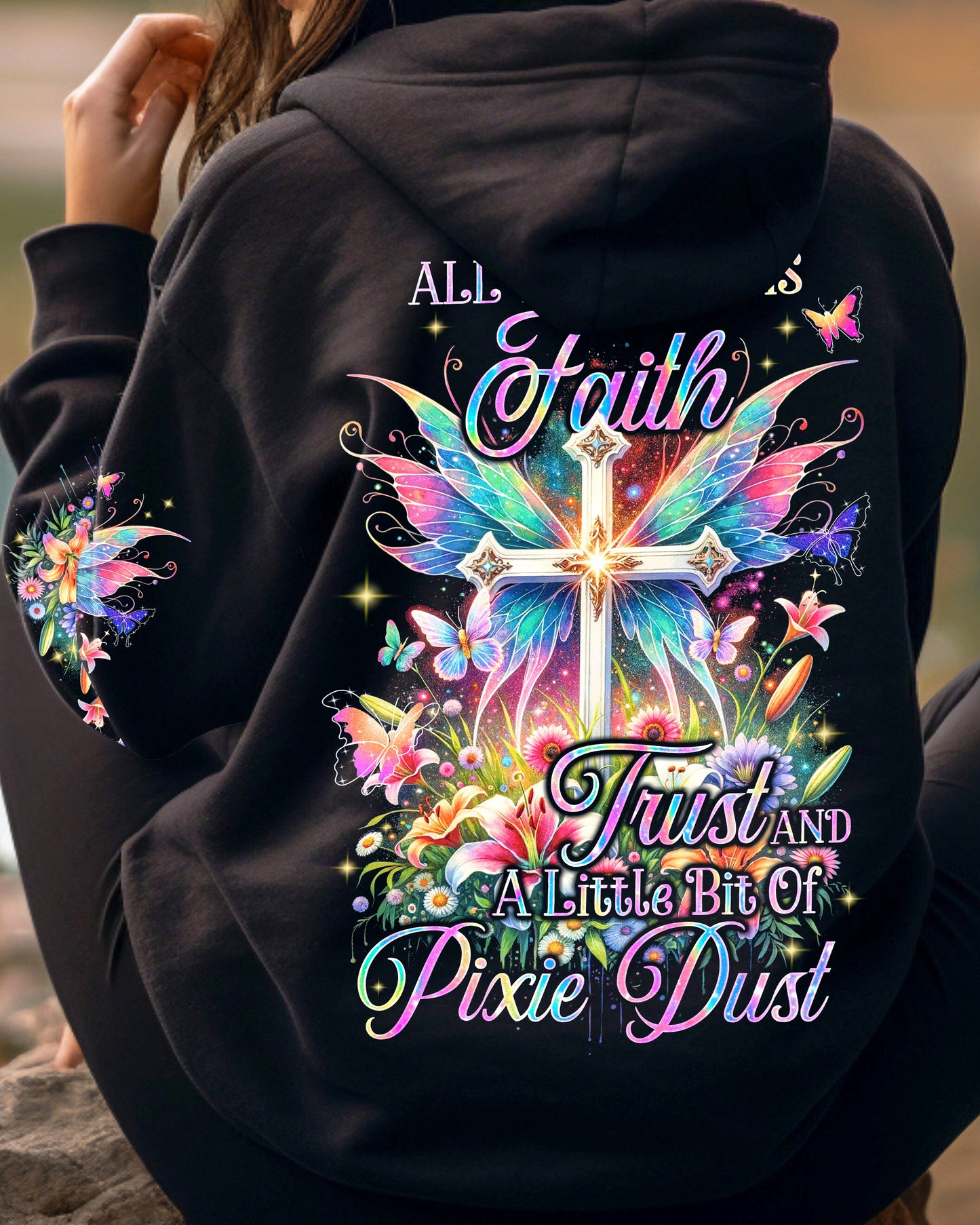 Enter a realm of enchantment where Christian faith intertwines seamlessly with magic through our captivating design. The cross and ethereal fairy wings forge a profound link between the divine and the whimsical, while blossoming flowers and butterflies signify spiritual growth and transformation. Infused with a sprinkle of fairy dust, our design radiates wonder and inspiration. Accompanied by the poignant quote, "All You Need Is Faith, trust, and a little bit of pixie dust," it serves as a reminder that faith can surmount obstacles and bring forth the extraordinary. Embark on a journey with this remarkable design today and let your faith take flight!