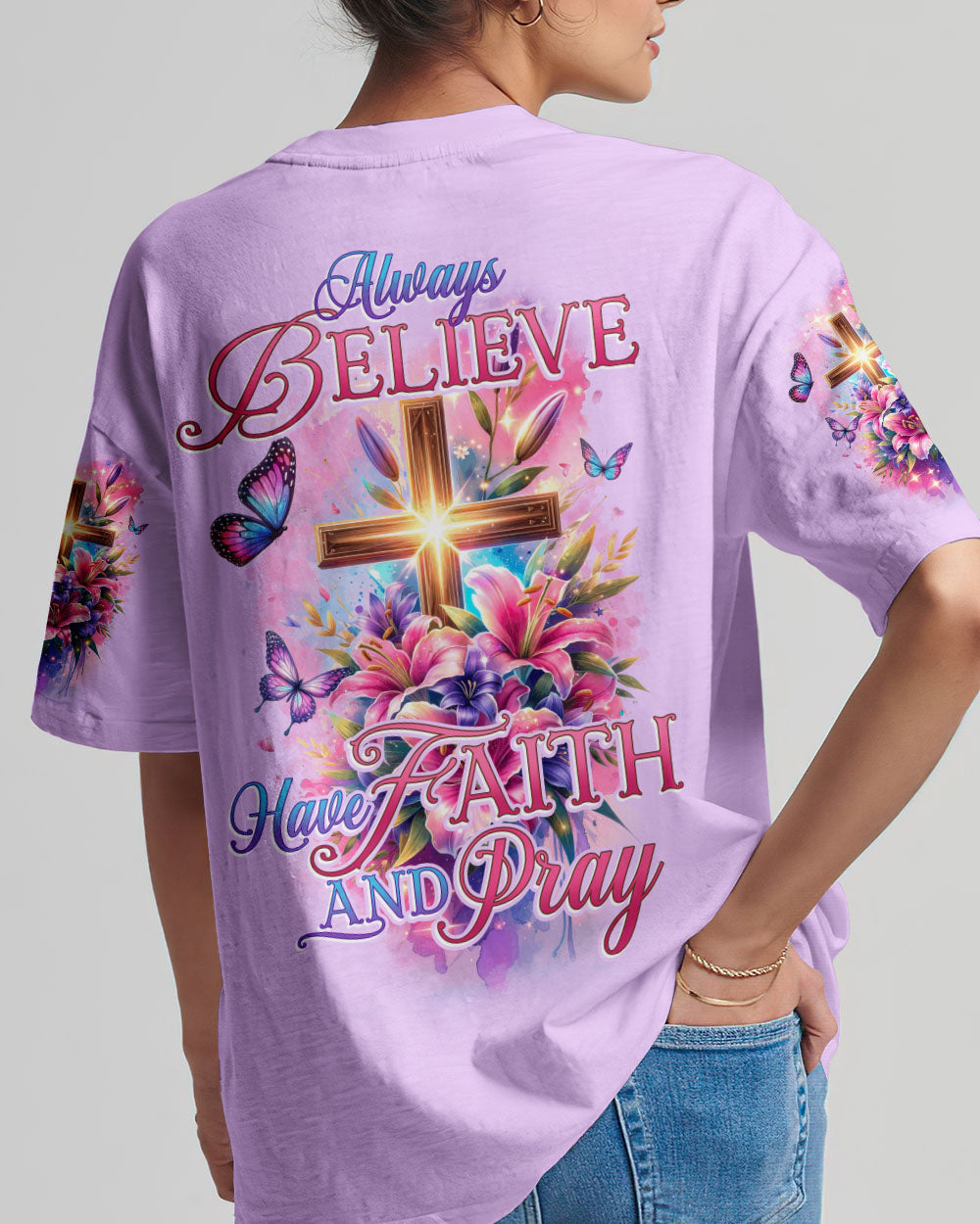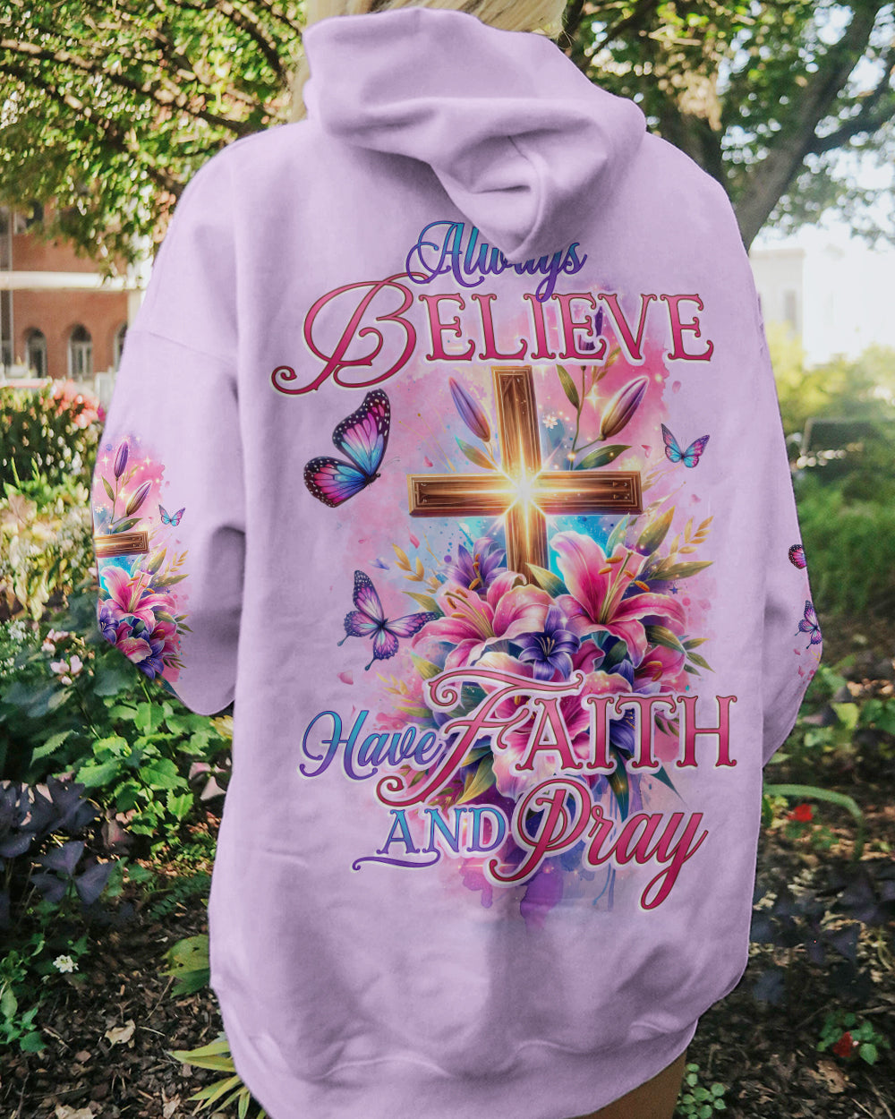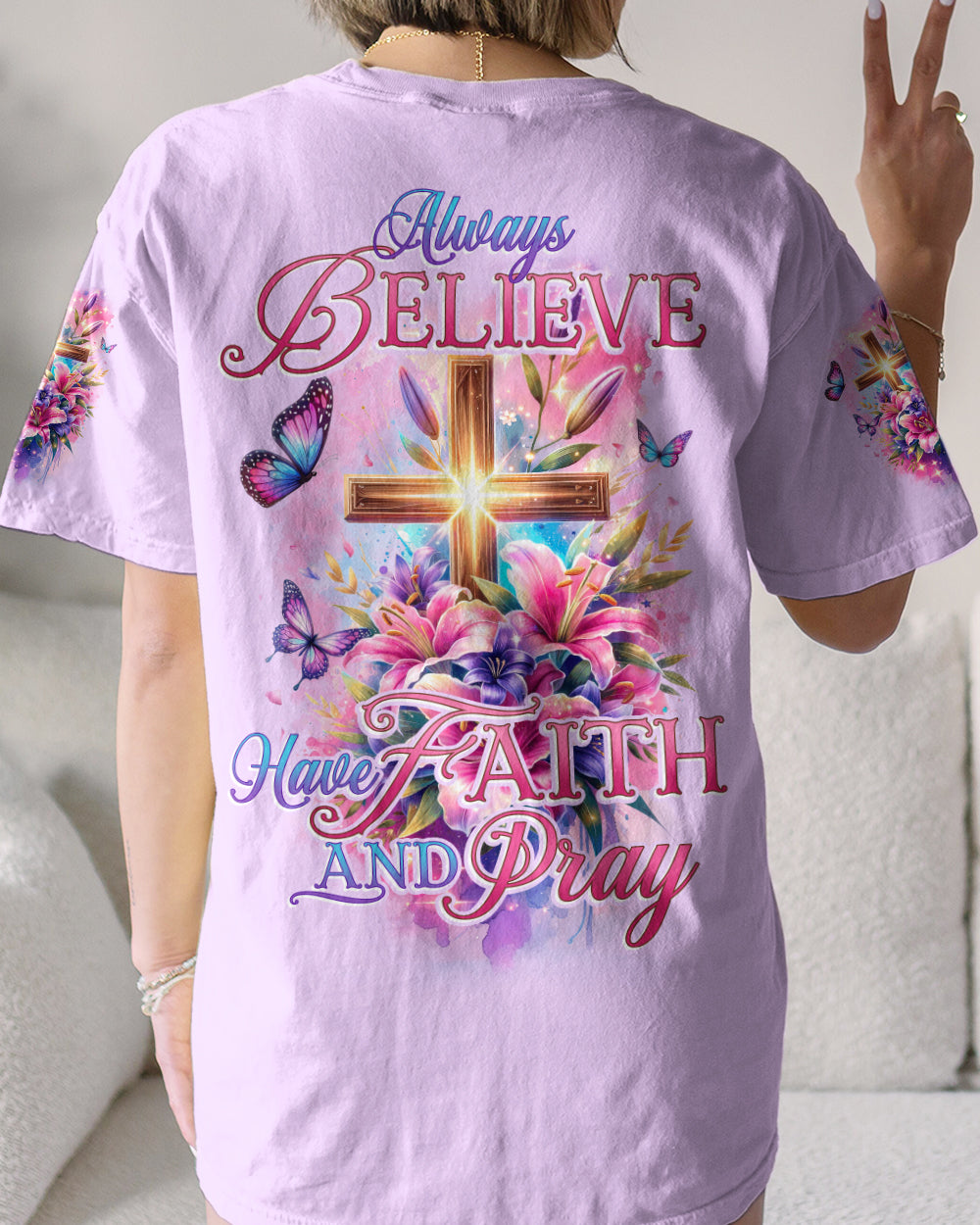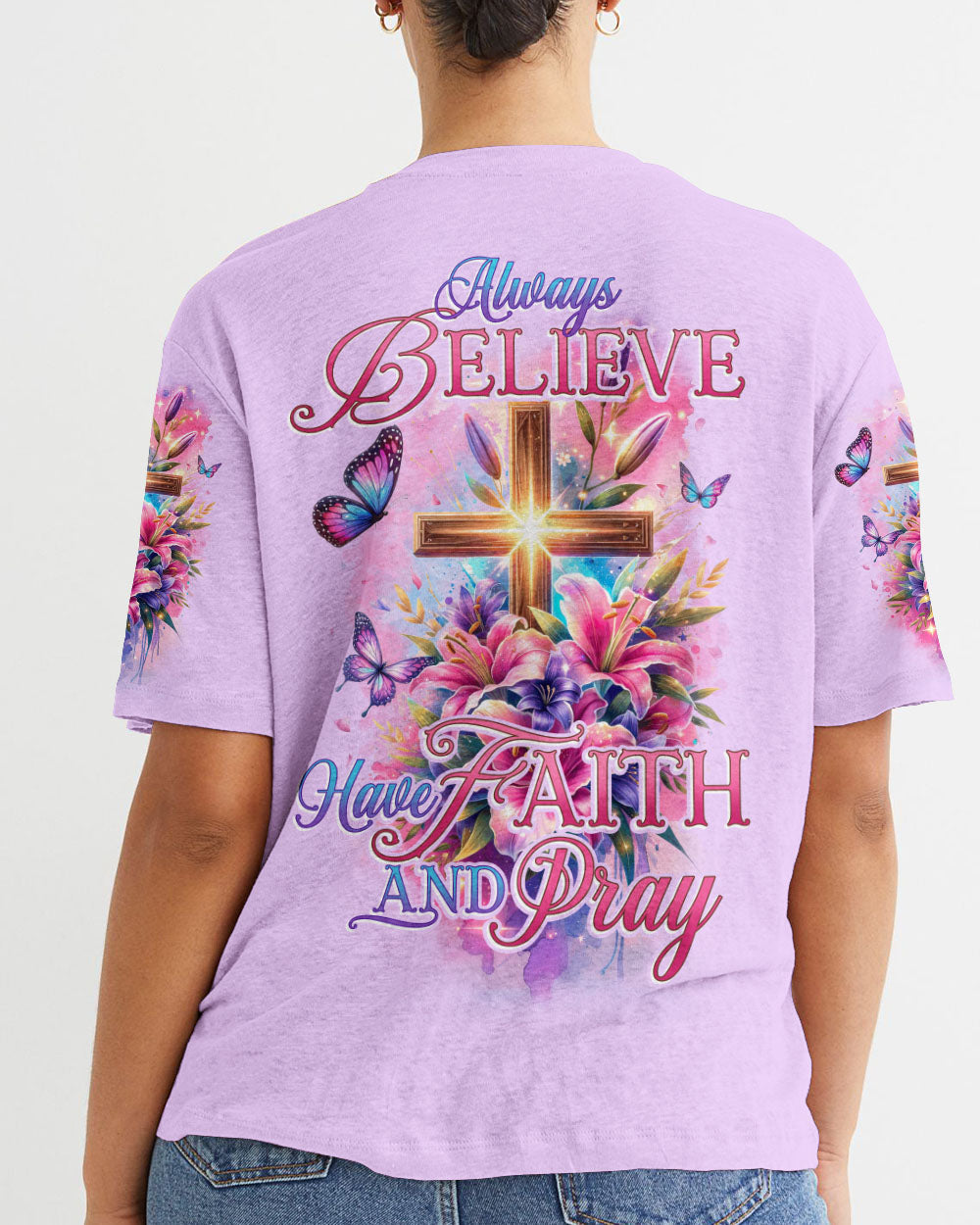 Discover our harmonious Christian design, seamlessly blending crosses, lilies, butterflies, and the uplifting quote 'Always Believe, Have Faith, and Pray.' This artwork celebrates core Christian principles, inspiring trust in belief and prayer's transformative power. Dive into this inspiring journey now.