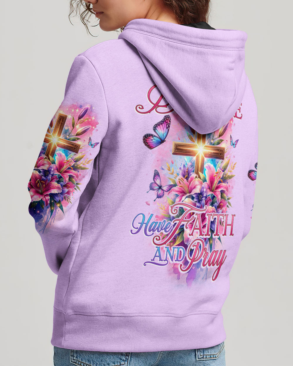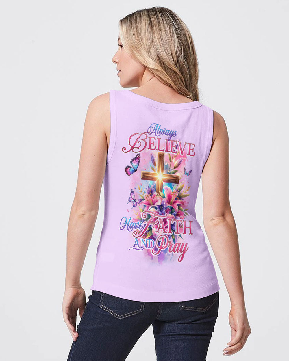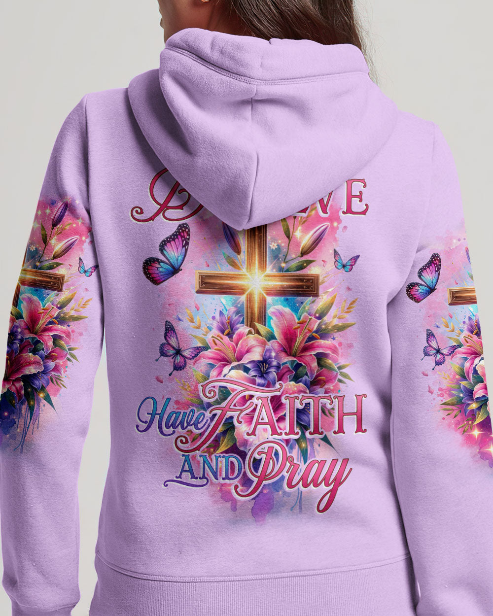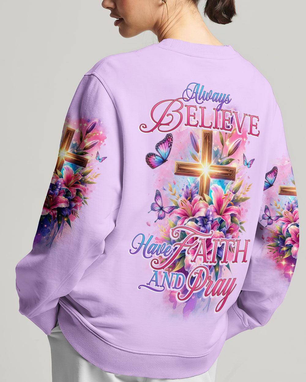 Discover our harmonious Christian design, seamlessly blending crosses, lilies, butterflies, and the uplifting quote 'Always Believe, Have Faith, and Pray.' This artwork celebrates core Christian principles, inspiring trust in belief and prayer's transformative power. Dive into this inspiring journey now.