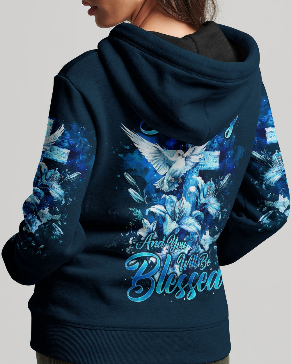 Immerse yourself in divine beauty with our striking shirt. A reverent composition of Christian symbols - standing crosses, blooming lilies, soaring doves, and elegant flowers - envelopes the profound quote 'Be a blessing, and you will be blessed.' Embrace this visual prayer, a testament to faith and grace. Order now.