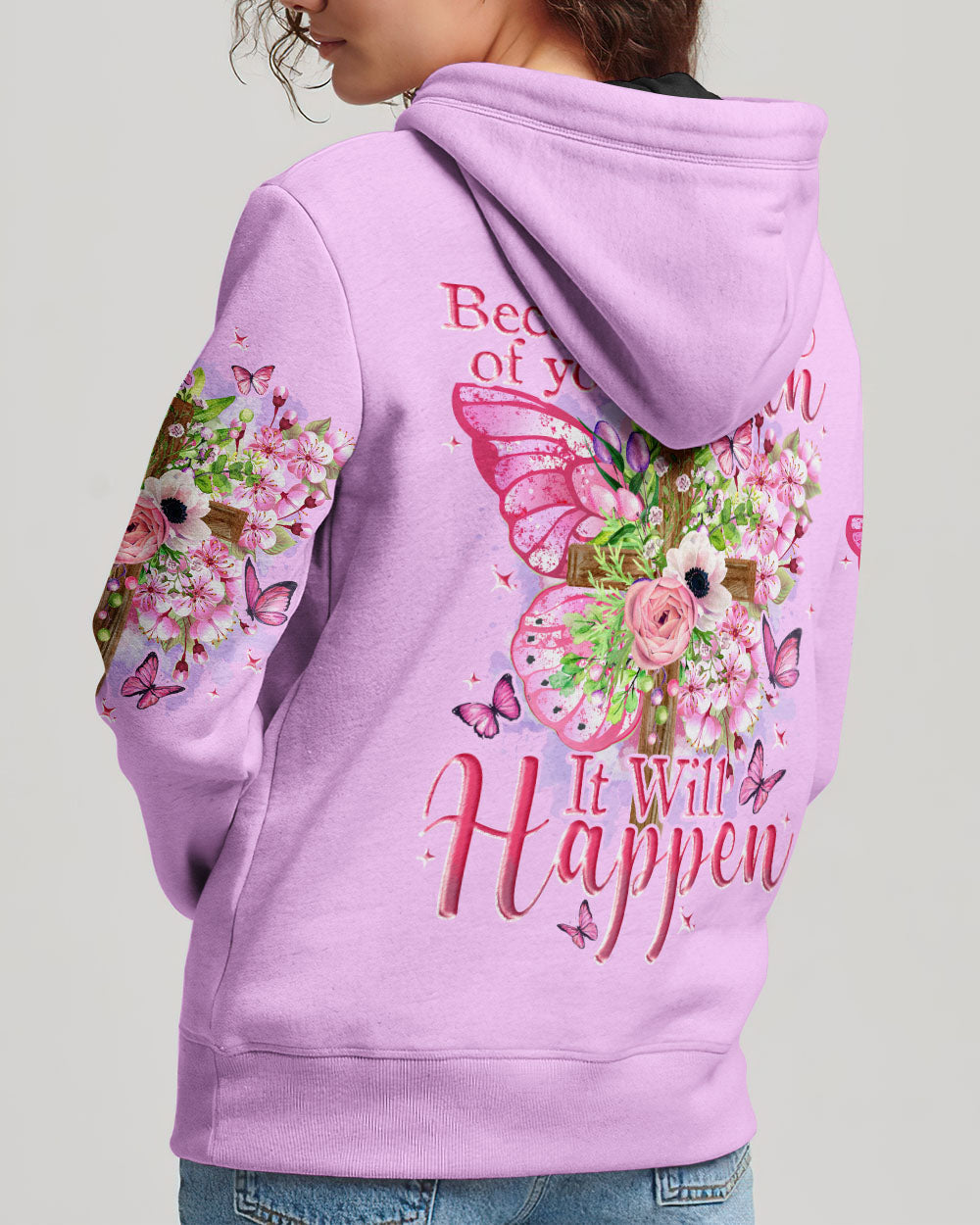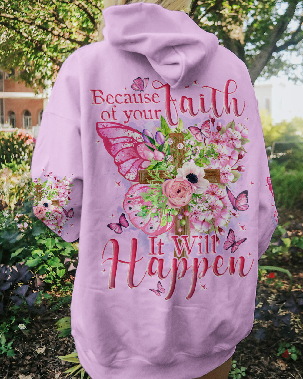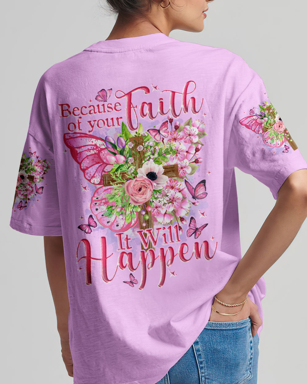 This stylish all-over print shirt features a powerful expression of Christian faith, with a captivating blend of the cross, graceful wings, delicate flowers, vibrant butterflies, and the inspiring quote ‘Because Of Your Faith it will happen.’ Make a statement of faith and be inspired with this unique and beautiful design.