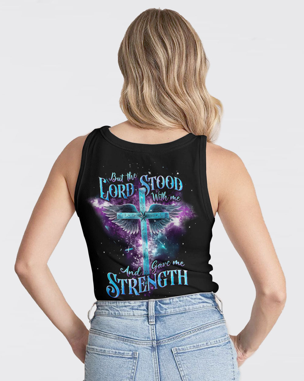 Embrace your unwavering faith and resilience with our majestic cross design, featuring outstretched wings as a symbol of gratitude to God. The phrase, "but the Lord stood with me and gave me strength," carries a profound message of divine support and inner fortitude. It signifies the belief that, even in adversity, God's presence empowers us to overcome challenges. This design is a potent reminder of the faith that sustains us and the divine strength that lights our path