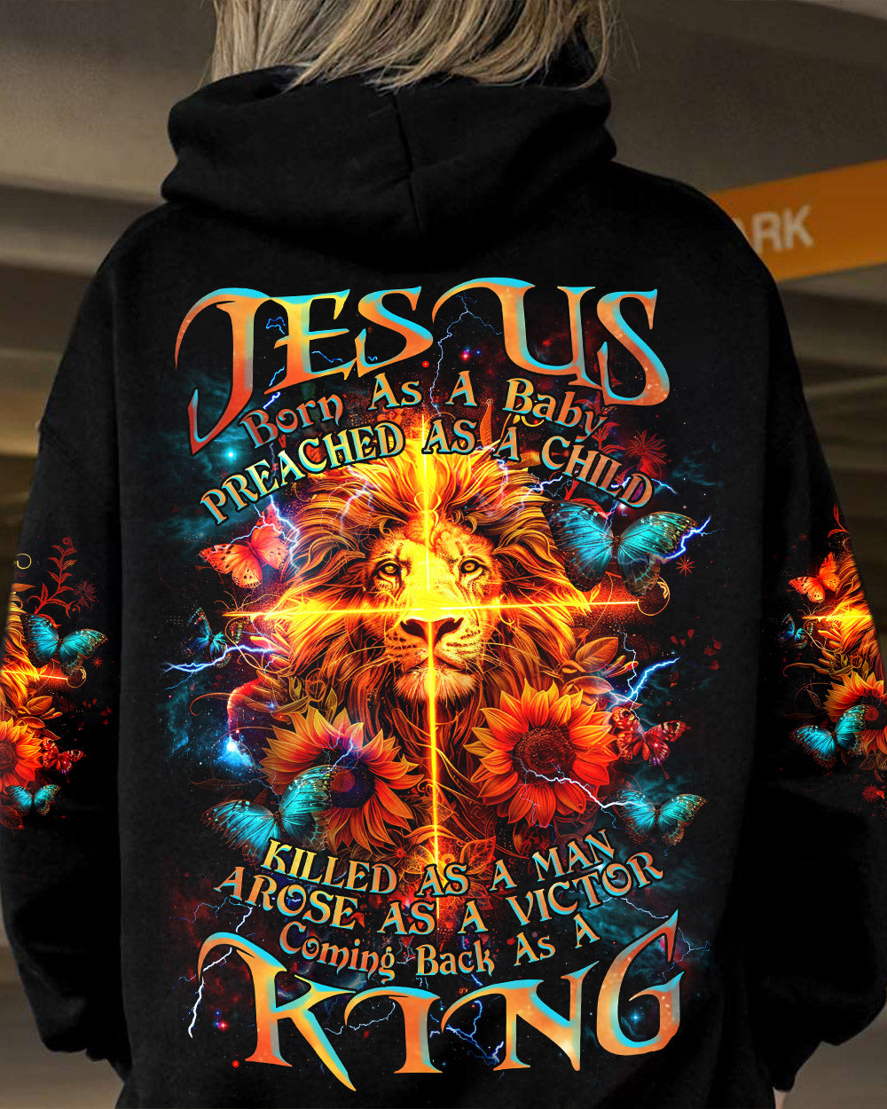Elevate your outfit with our Coming Back As King Women's All Over Print Shirt. Embody strength and authority with our striking cross and lion design, symbolizing Jesus Christ's power and majesty. The powerful quote encapsulates Jesus's profound journey and returning as the reigning King.