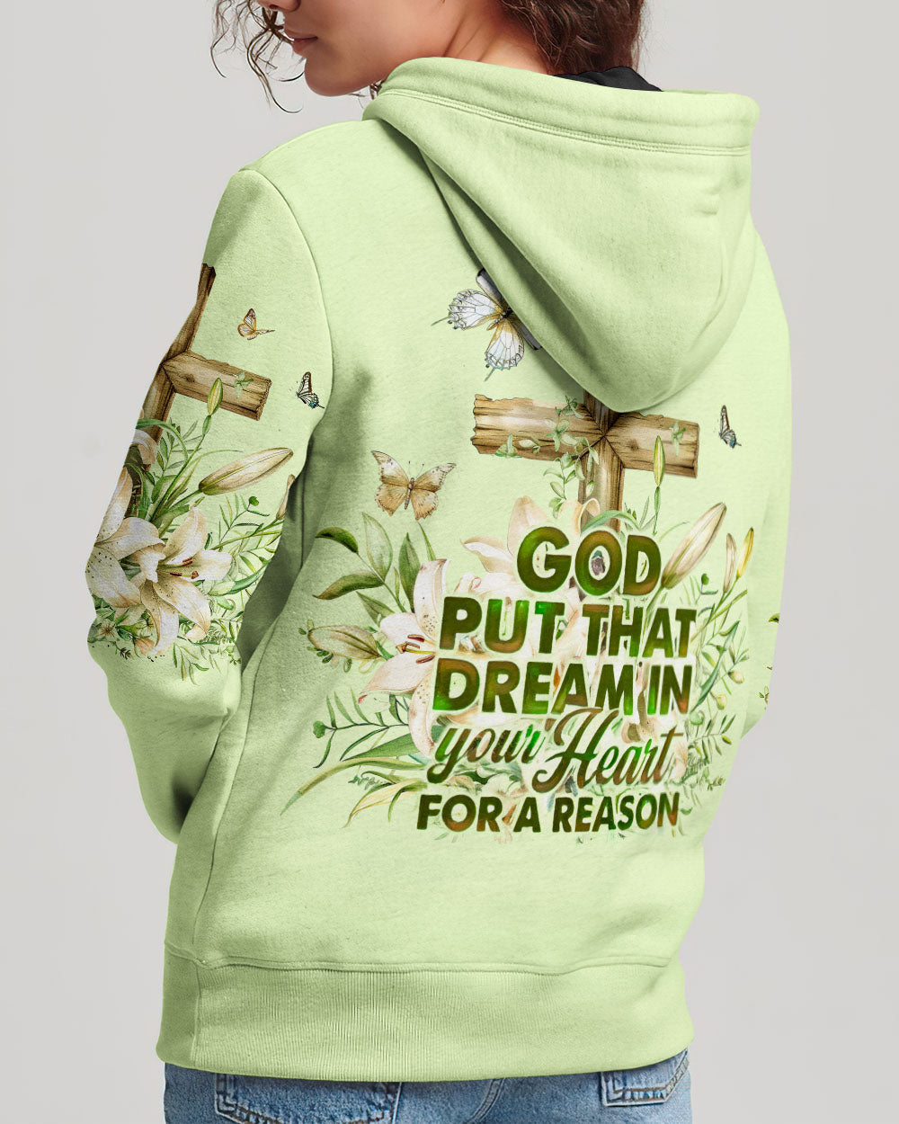 Take a journey of faith with our Dream In Your Heart Women's All Over Print Shirt. Featuring a captivating design of crosses, lilies, butterflies, flowers, and an uplifting quote, this shirt will inspire and uplift. Let it serve as a testament to God's purpose in your life and a reminder to pursue your dreams with unwavering faith and trust in His plan.
