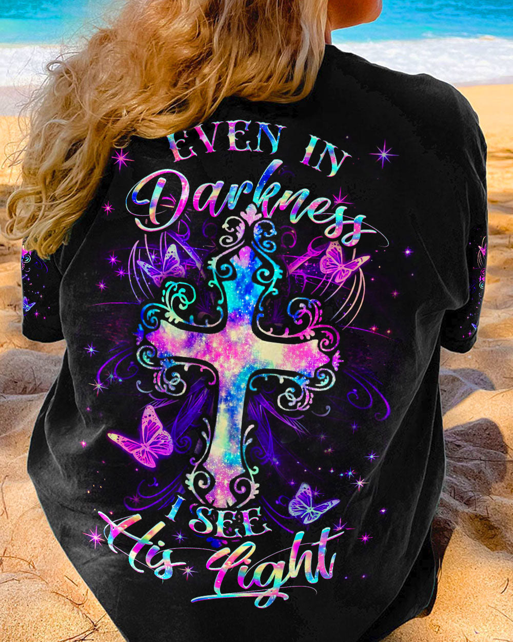 Be inspired with our Even In The Darkness Women's All Over Print Shirt! This beautiful design features a radiant cross adorned with graceful butterflies, swirling smoke, shimmering stars, and a motivating quote. Let your spirit be uplifted and your faith ignited by its majestic beauty and powerful symbolism. This one-of-a-kind design is a source of daily inspiration and a reminder of the unwavering light of Christ even in the darkest times.