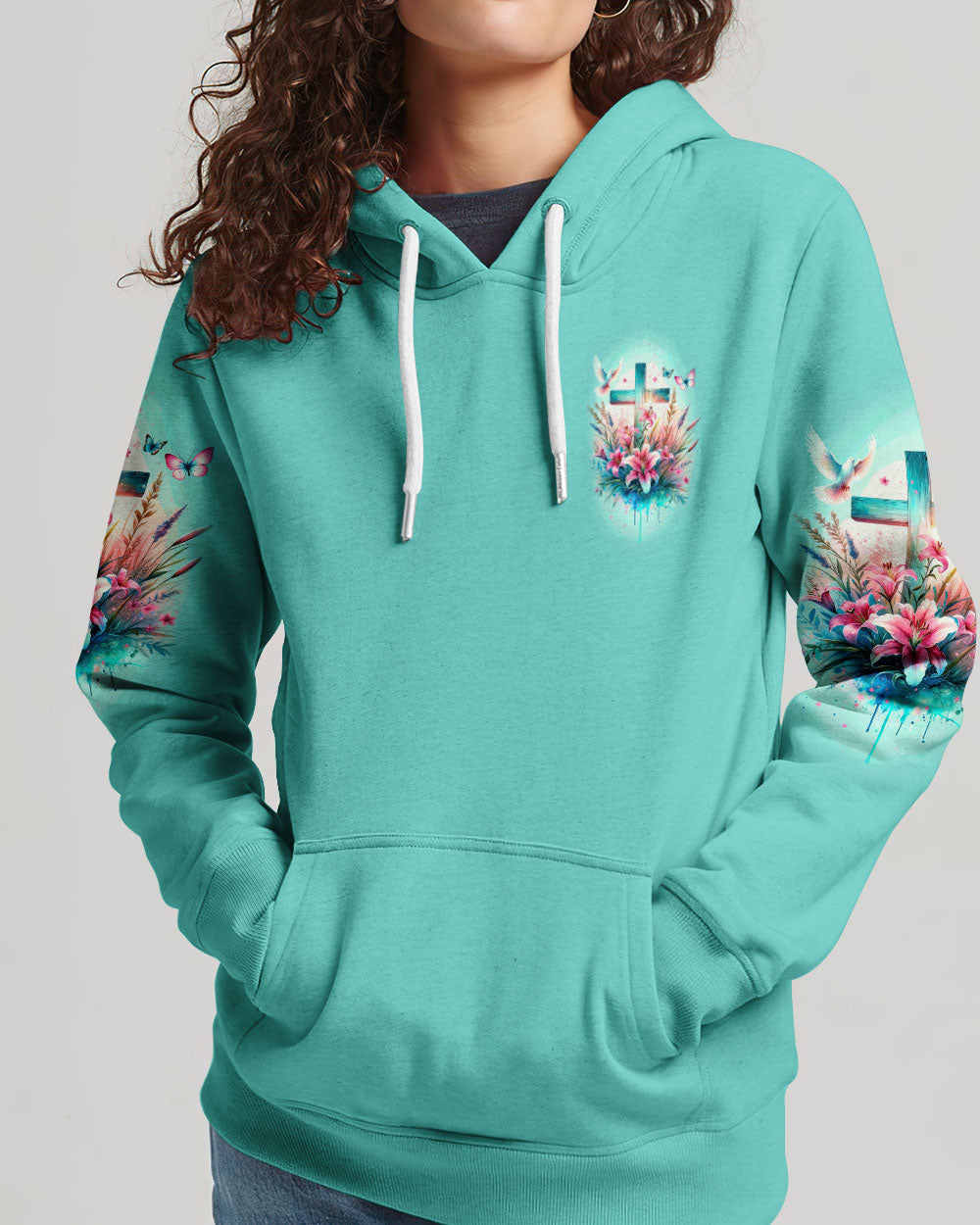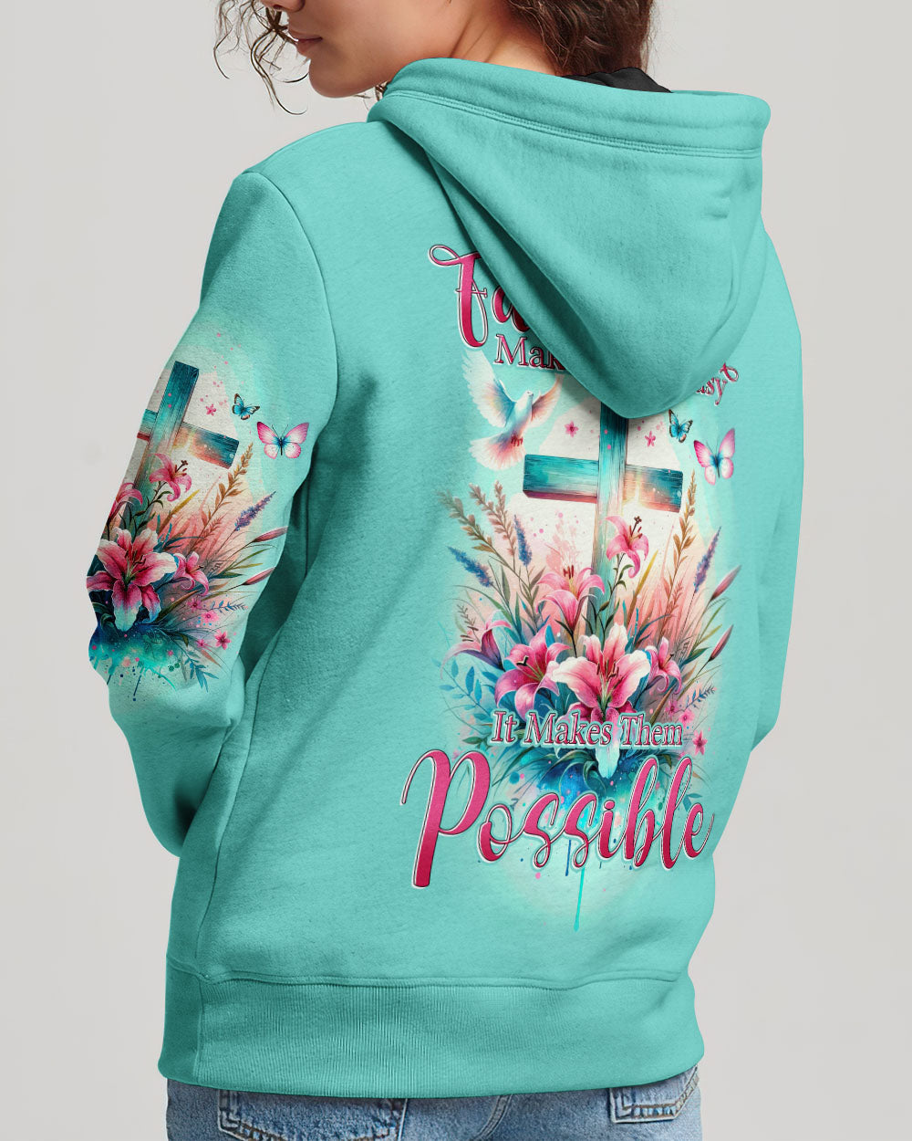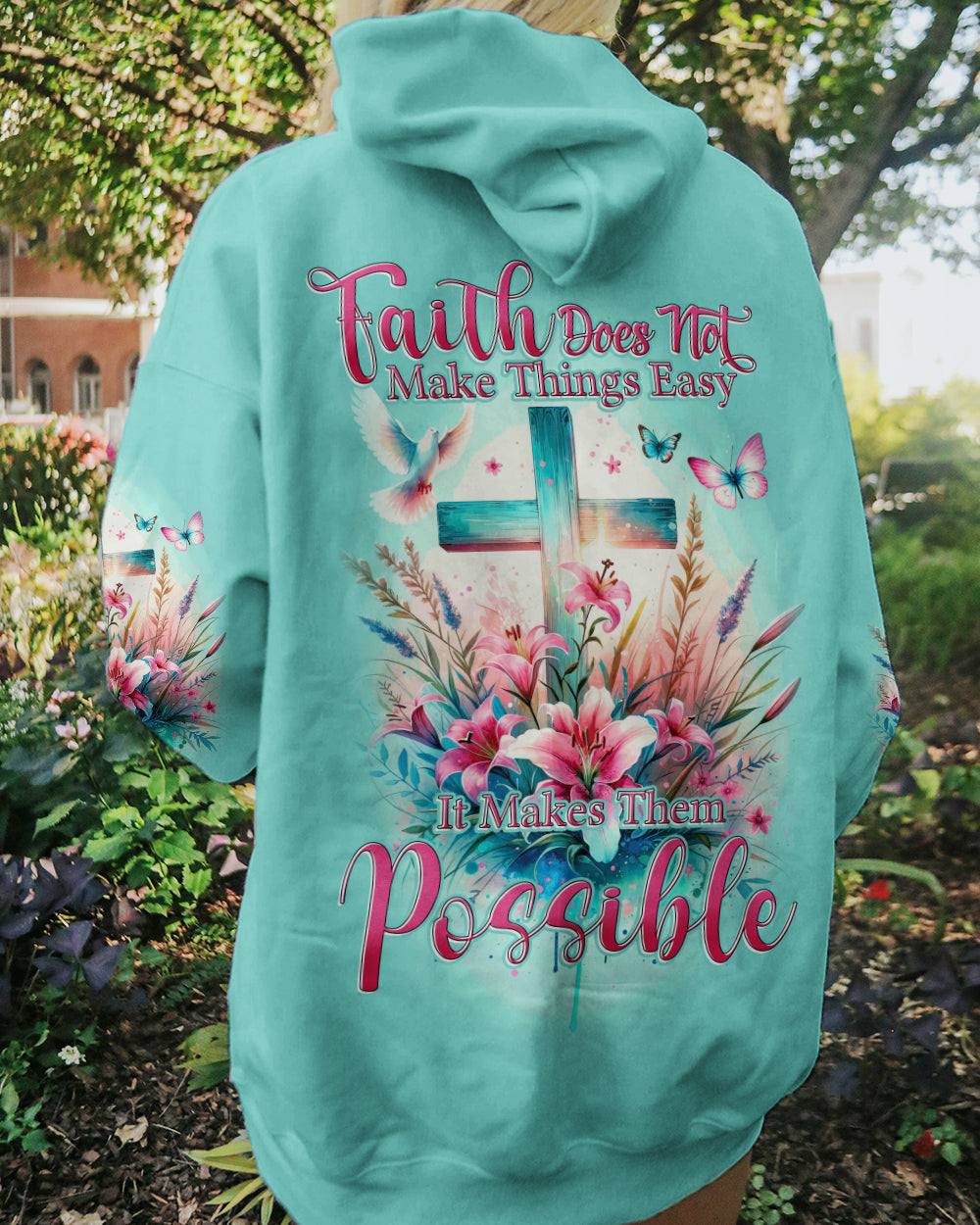 This unique Faith Does Not Make Things Easy Women's All Over Print Shirt celebrates Christian faith in a stunning design. Featuring a resplendent cross, blooming flowers, doves, and butterflies, the quote, "Faith Does Not Make Things Easy; it makes them possible" is an inspiring reminder of the power of unwavering belief. An inspiring visual testament to the beauty of faith.