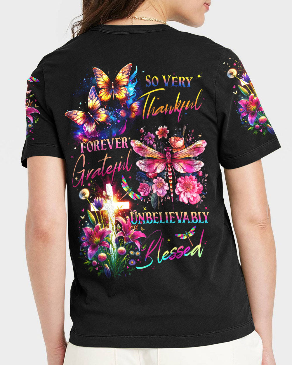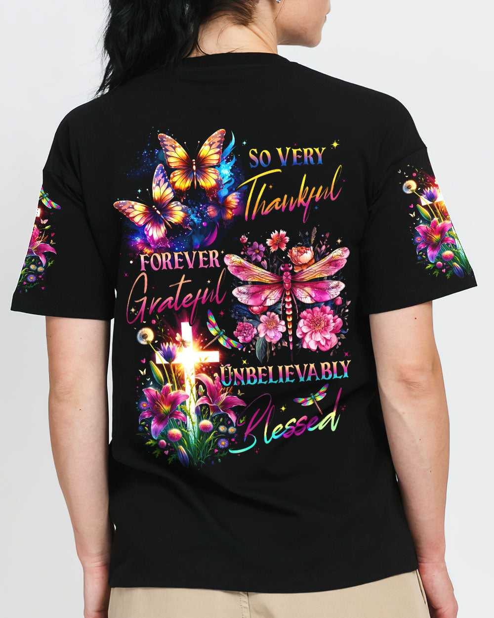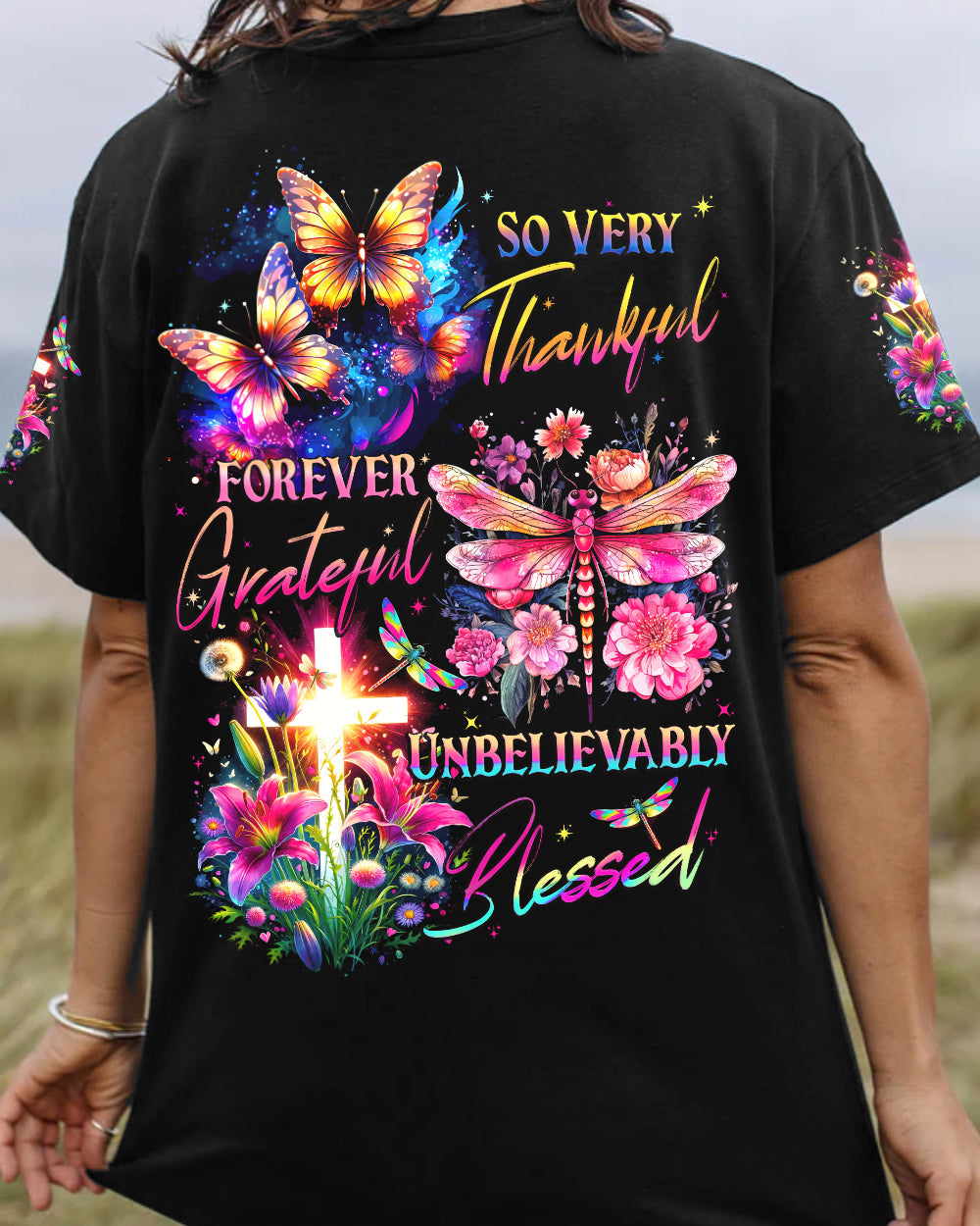 Showcase your faith in style with this remarkable Forever Grateful Women's All Over Print Shirt. Featuring butterflies, dragonflies, crosses, and blooming lilies, this visually striking design will remind you of the beauty of your spiritual blessings. Radiate your appreciation with the meaningful mantra and inspiring design, representing your deeply rooted faith.