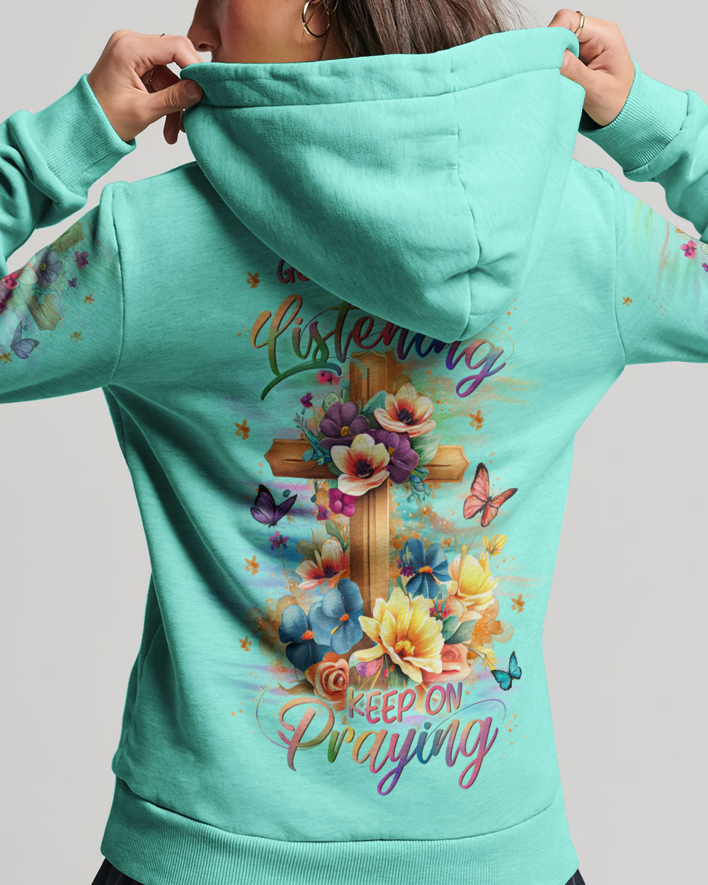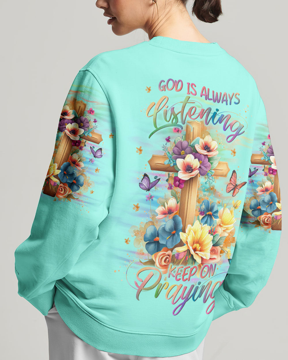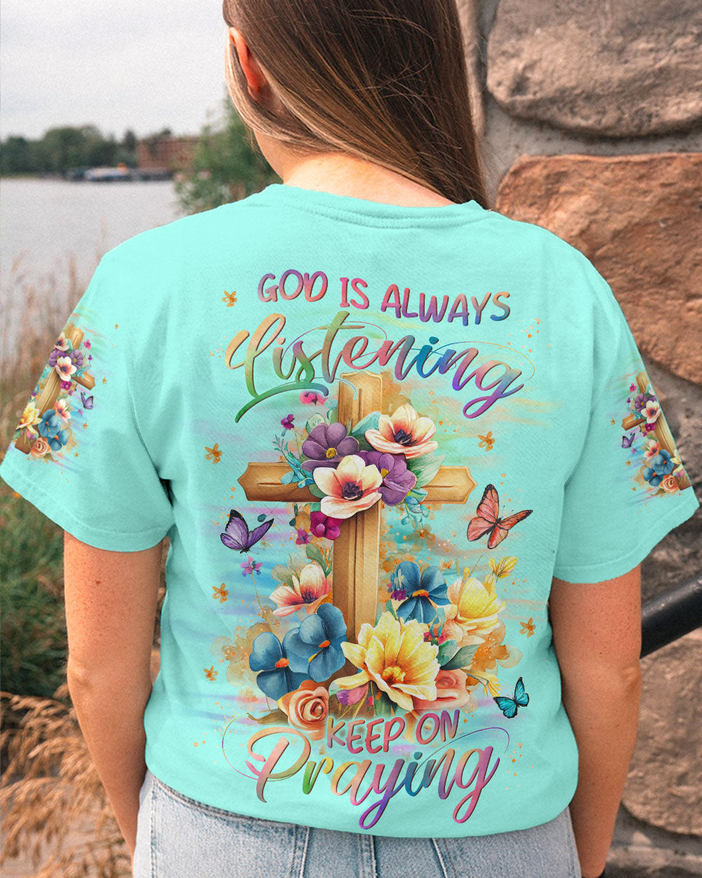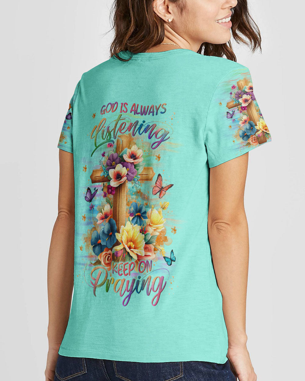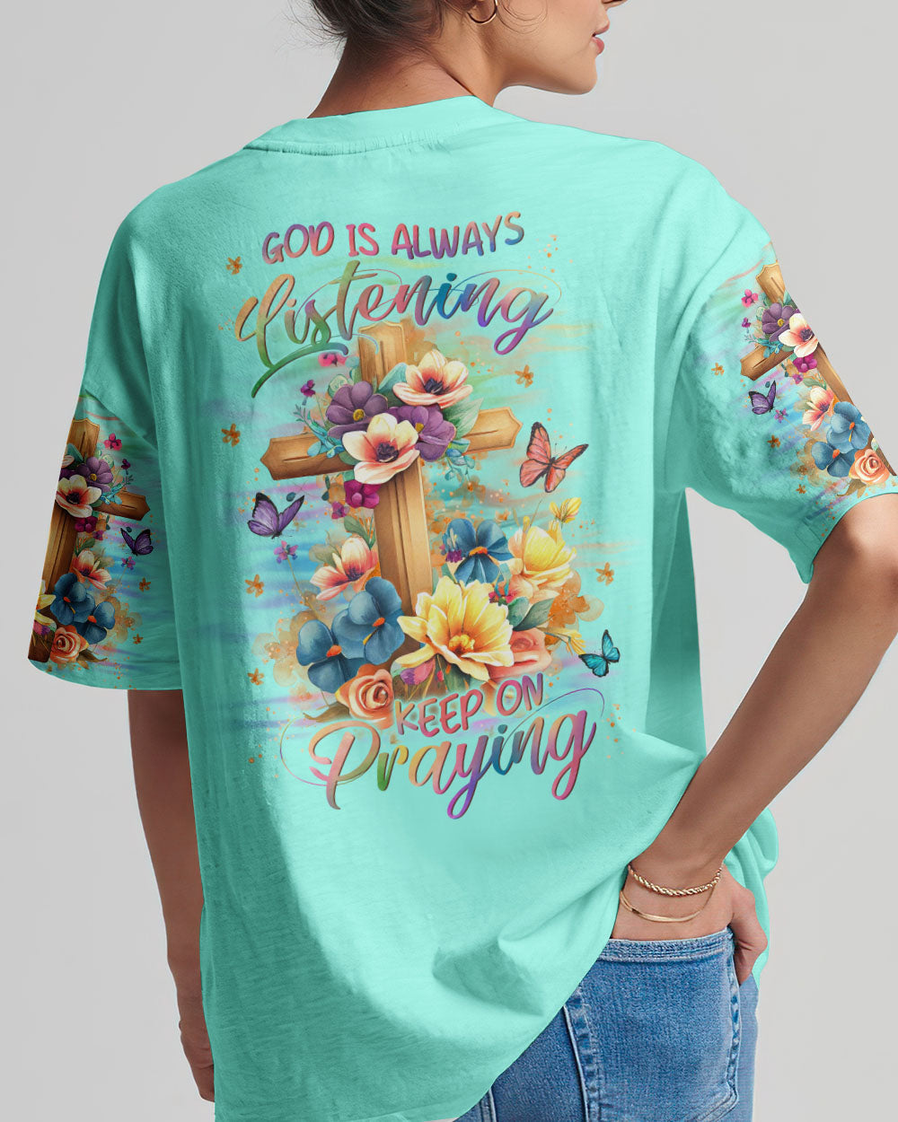 Inspire your spirituality with this beautiful God Is Always Listening Women's All Over Print Shirt. Its exquisite design features a ornately decorated cross and accompanying quote that serves as a reminder of the enduring power of faith. Perfect for wearing proudly and showing off your devotion. Get yours and deepen your journey of prayer and spirituality.