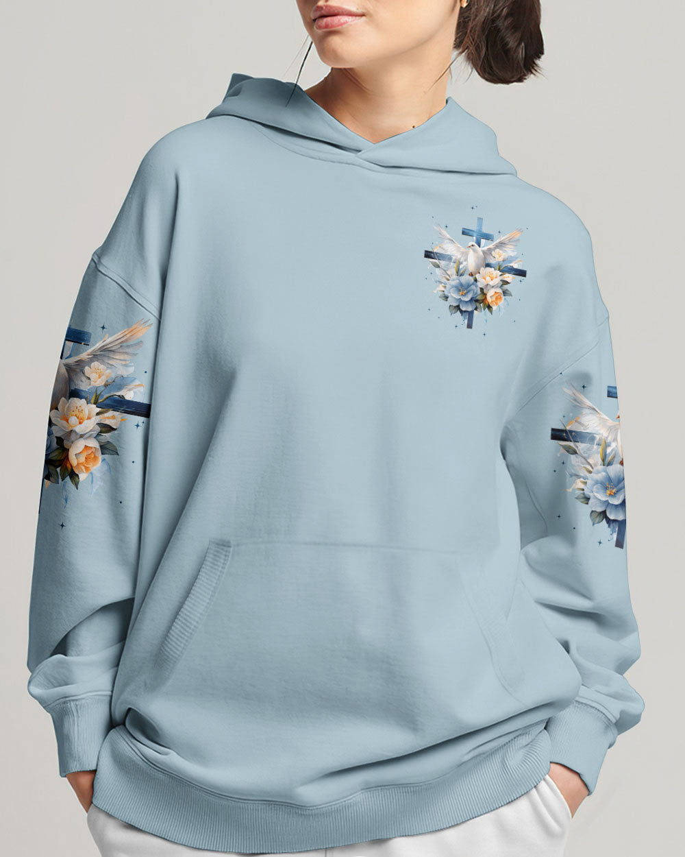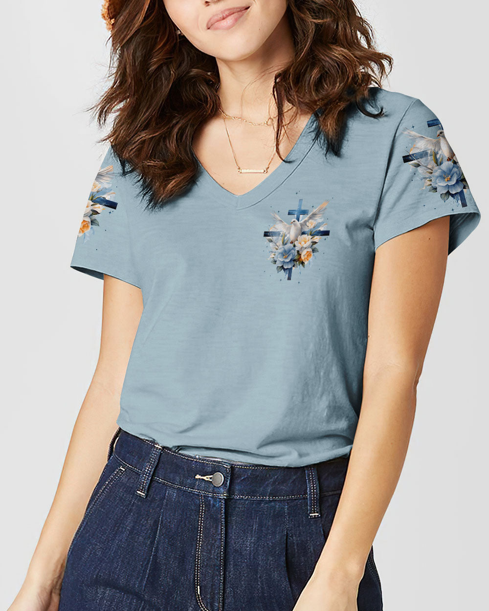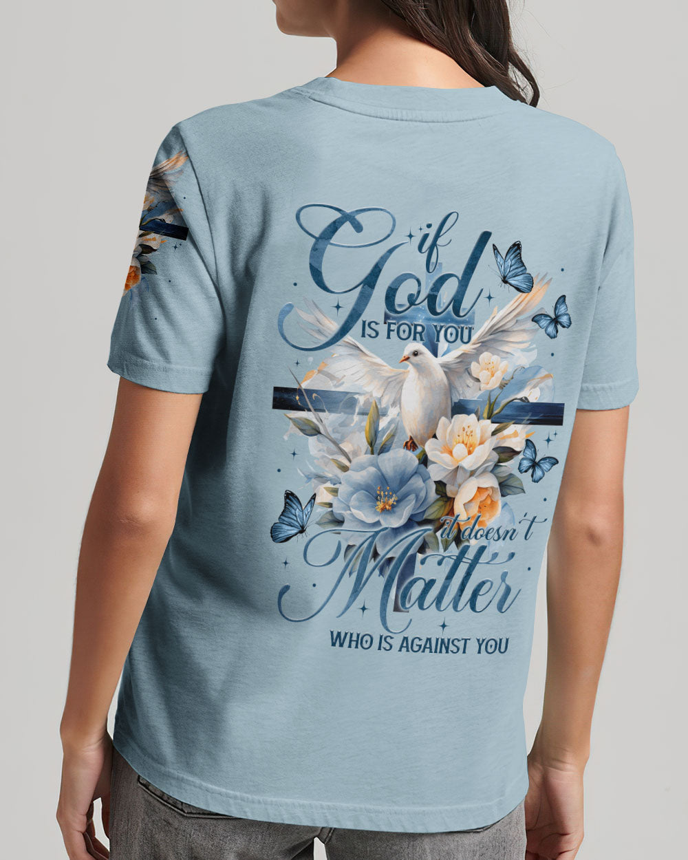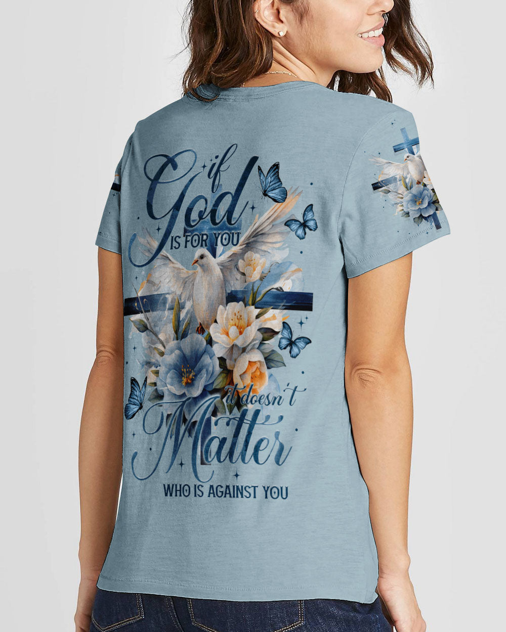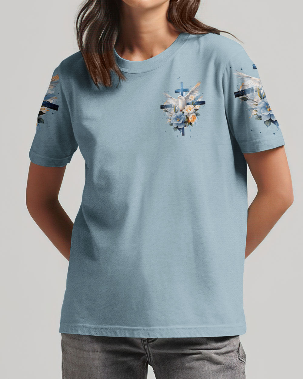 Show off your faith with this stylish, all-over printed shirt. Featuring a beautiful blend of crosses, flowers, and doves, this design is a visual reminder of God's strength and love. With a powerful quote of assurance, it's the perfect way to boldly express your belief in Him.
