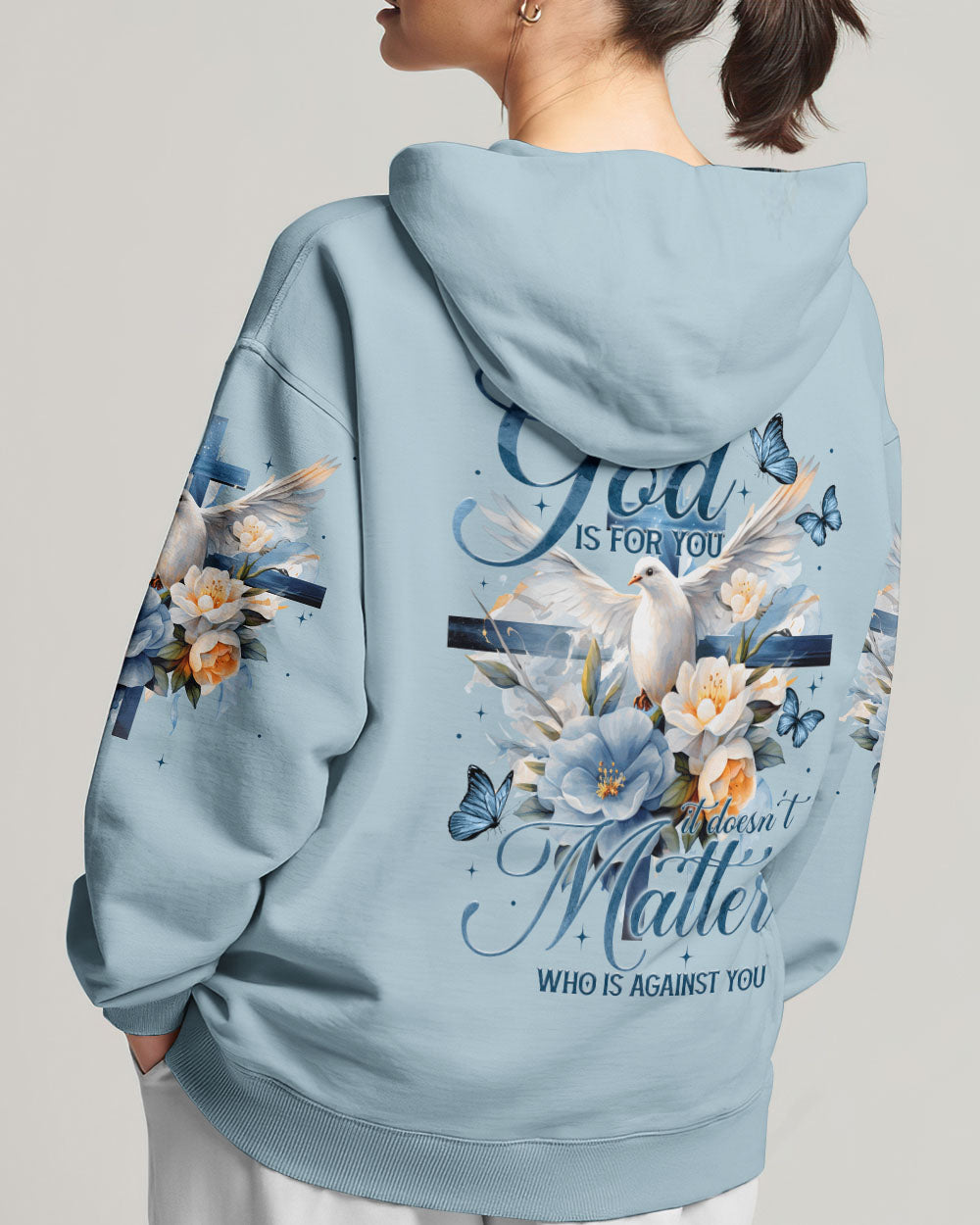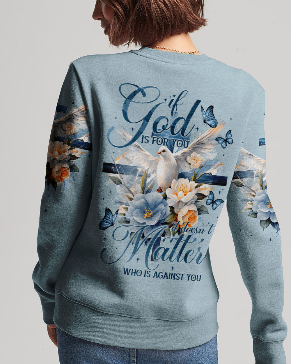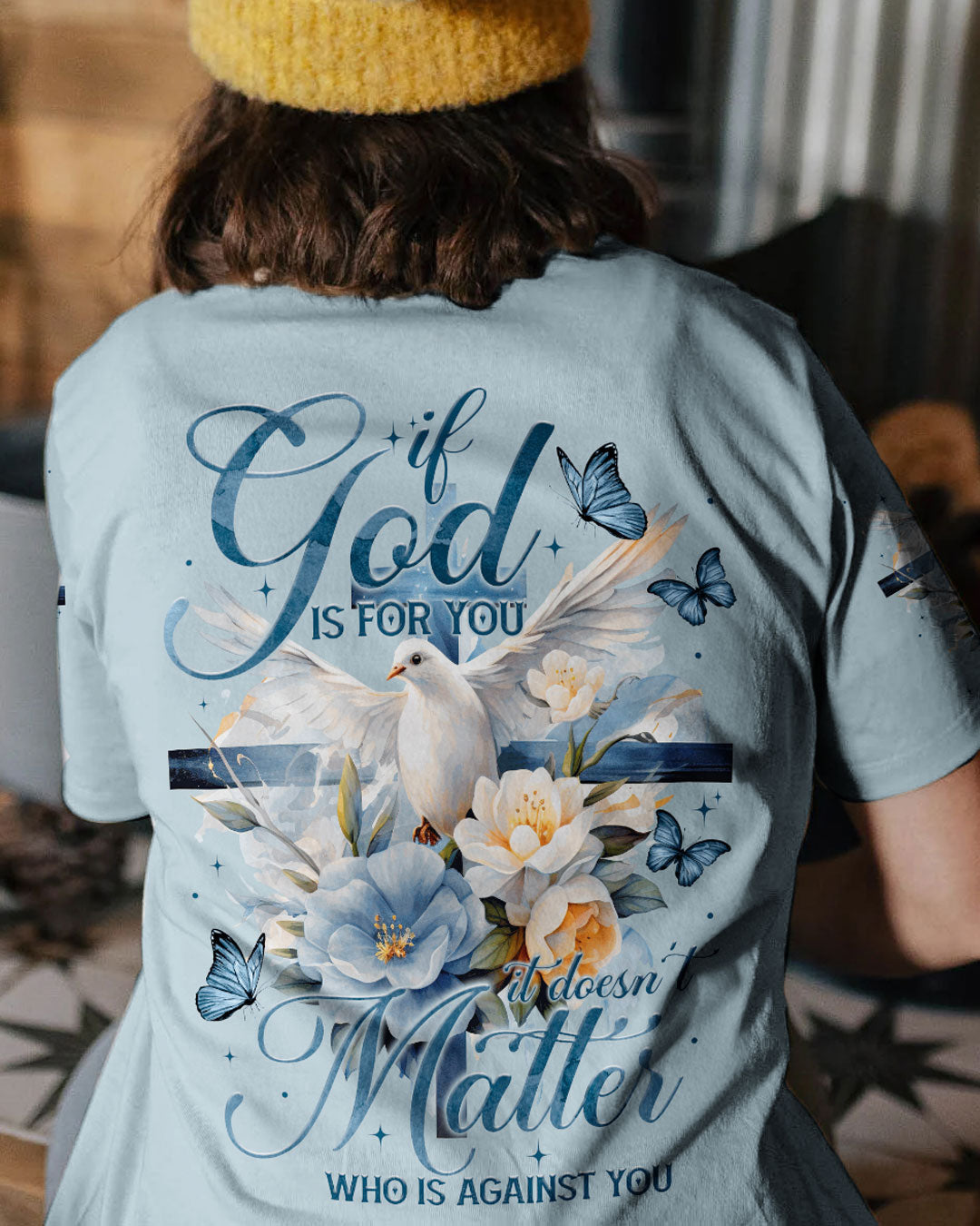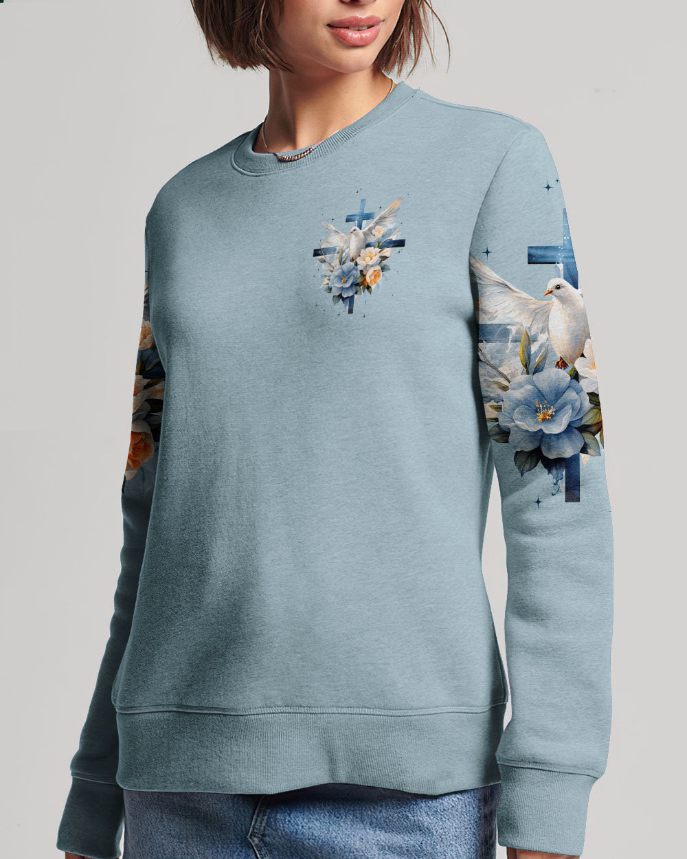 Show off your faith with this stylish, all-over printed shirt. Featuring a beautiful blend of crosses, flowers, and doves, this design is a visual reminder of God's strength and love. With a powerful quote of assurance, it's the perfect way to boldly express your belief in Him.