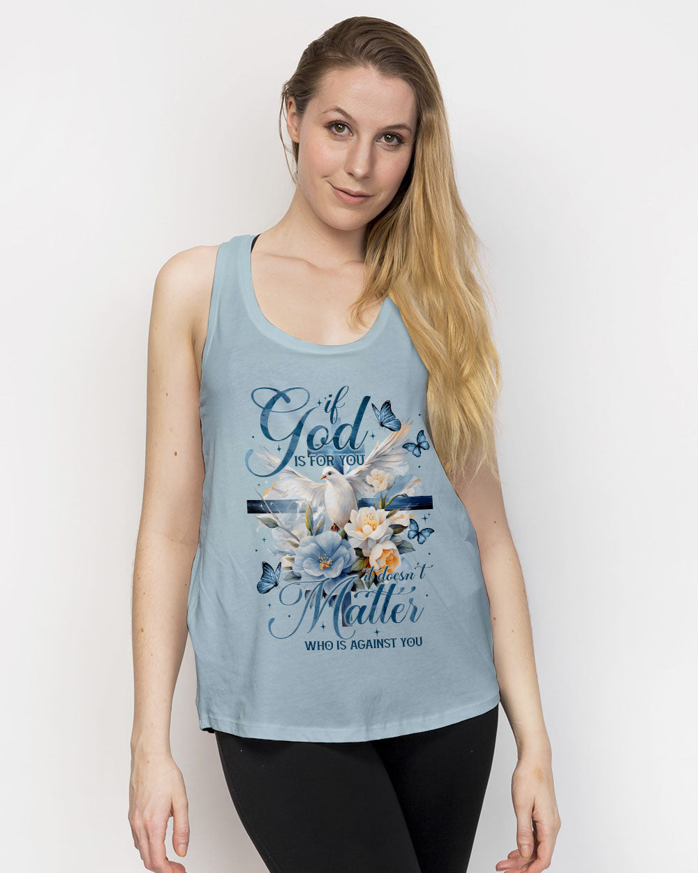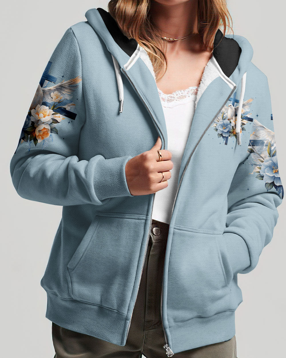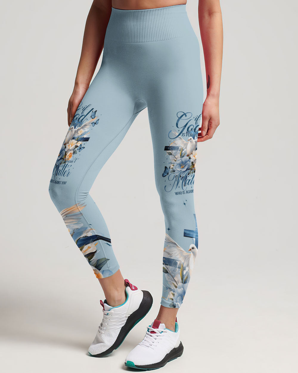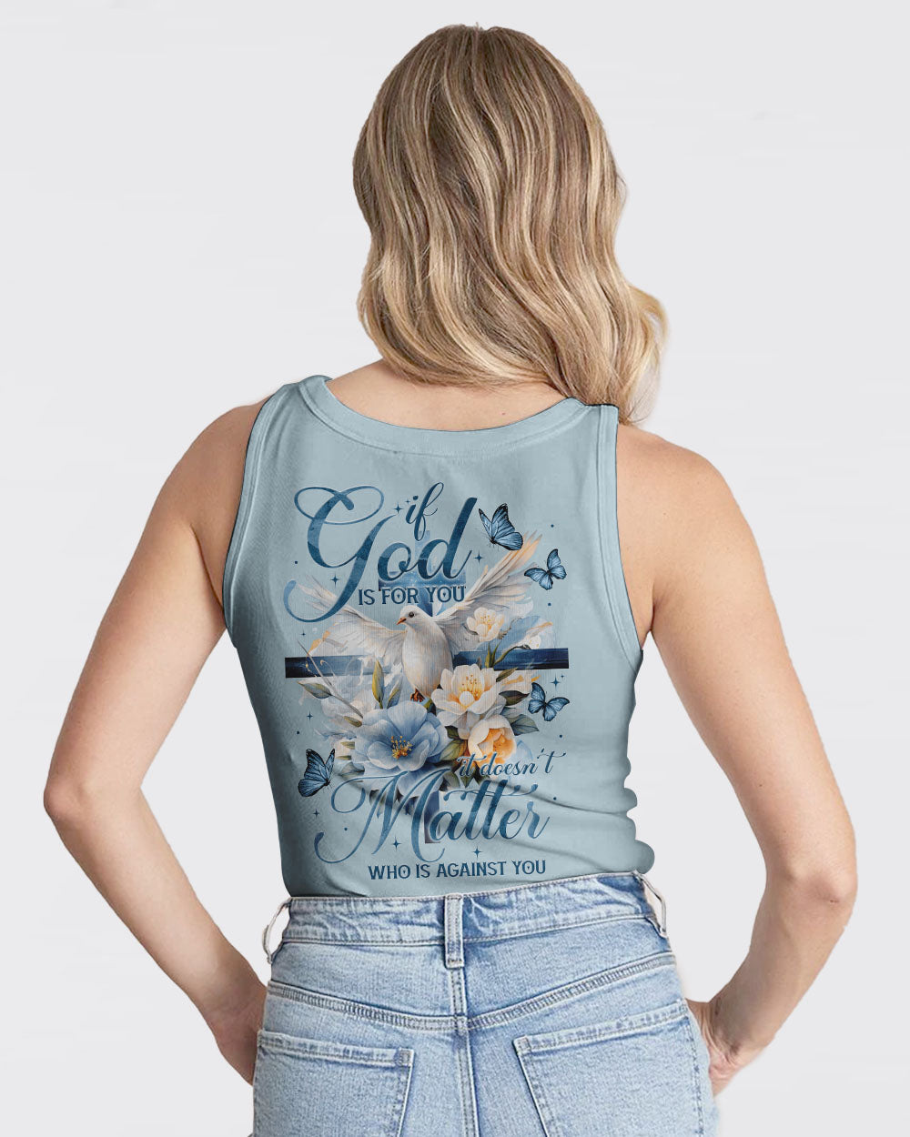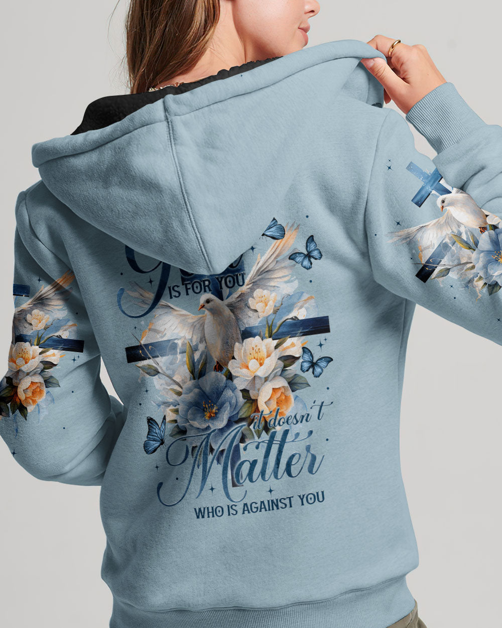 Show off your faith with this stylish, all-over printed shirt. Featuring a beautiful blend of crosses, flowers, and doves, this design is a visual reminder of God's strength and love. With a powerful quote of assurance, it's the perfect way to boldly express your belief in Him.
