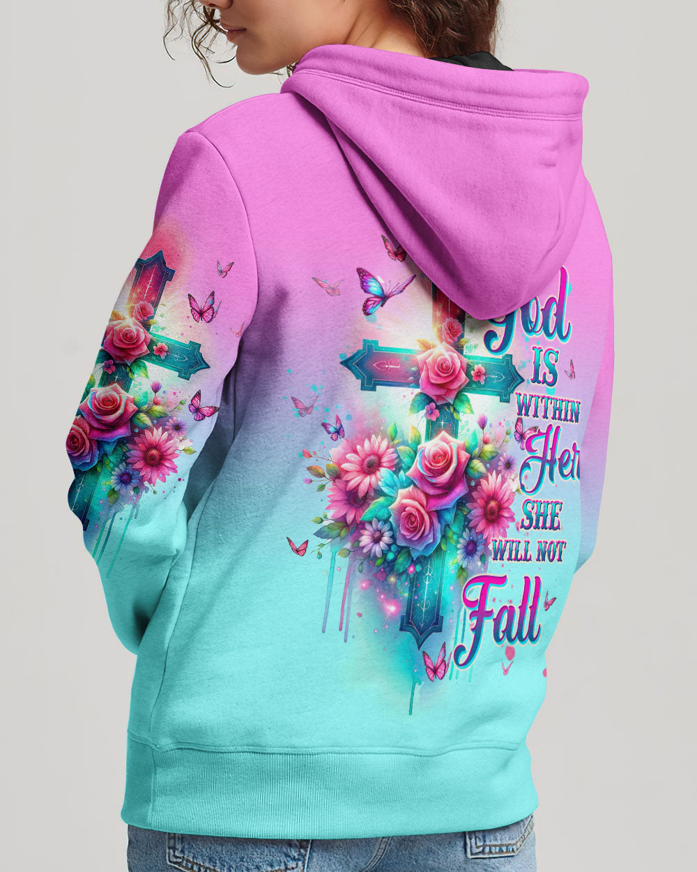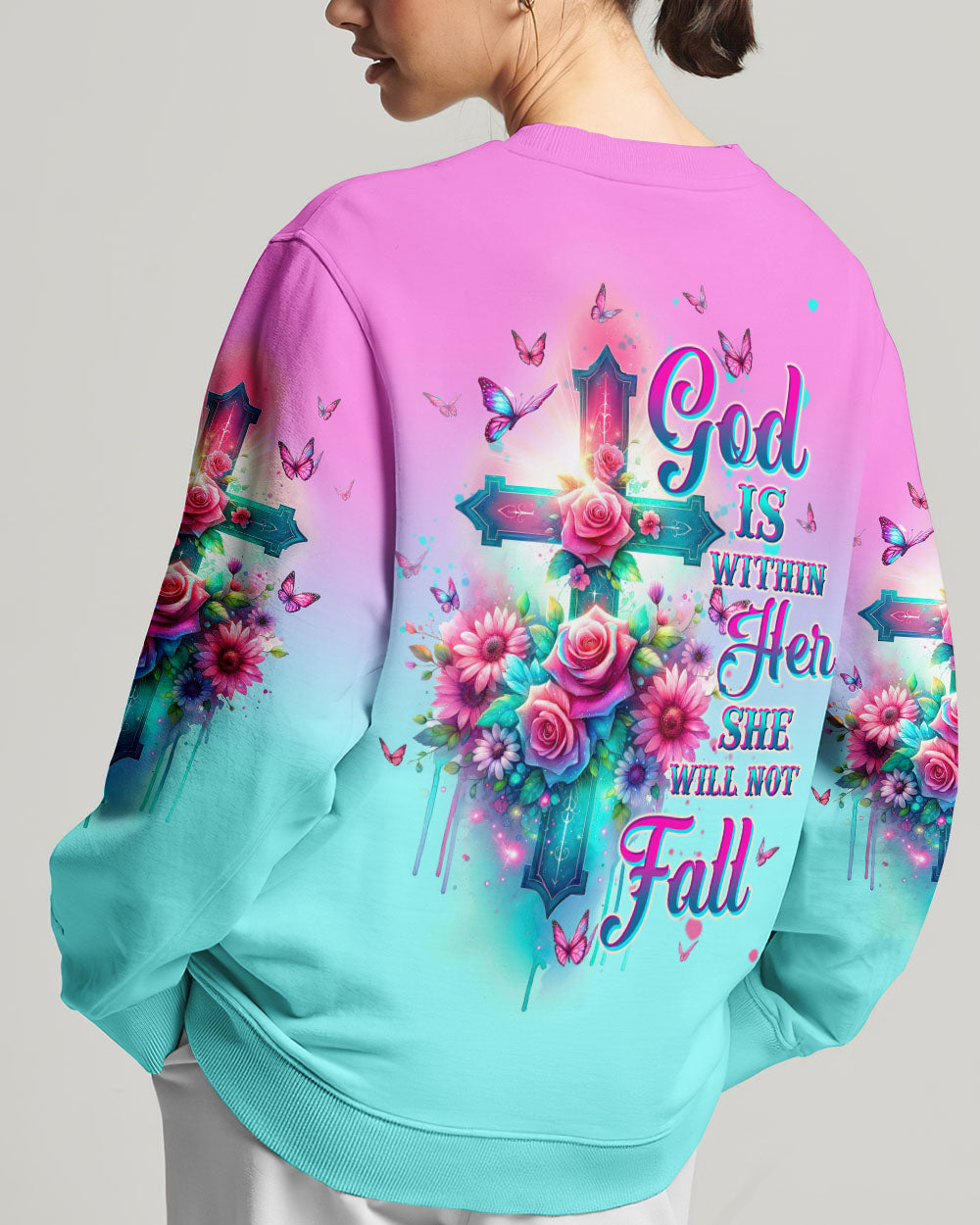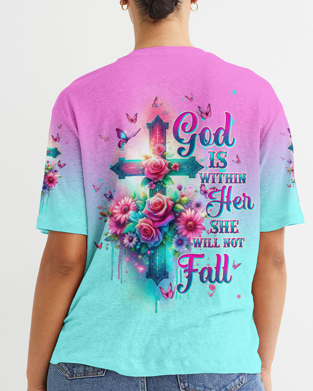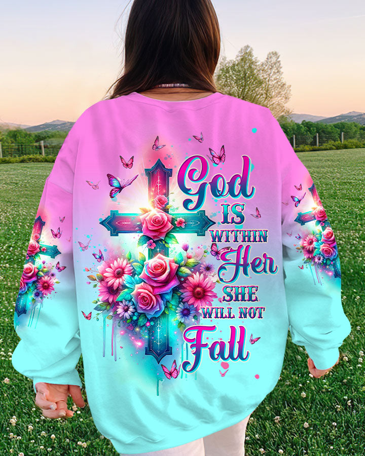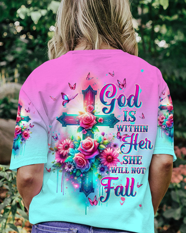 Embrace divine elegance with our God Is Within Her Rose Cross All Over Print. A glowing cross, intertwined with beautiful roses and butterflies, embodies faith and resilience. Featuring the powerful affirmation "God is within her, she will not fall," this design reminds us of the unwavering strength that comes from God's presence, providing protection and uplifting force in the face of life's challenges.