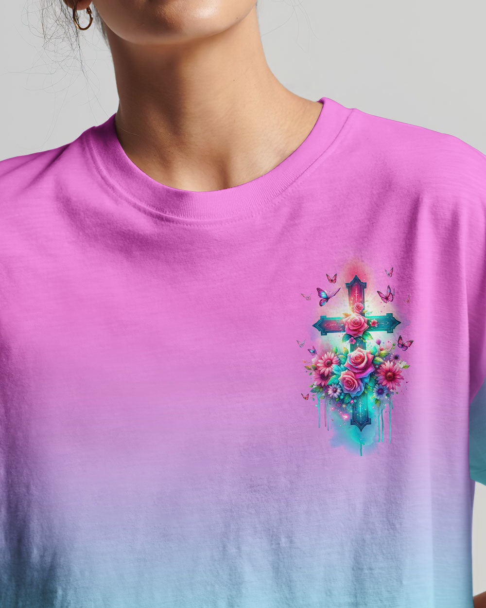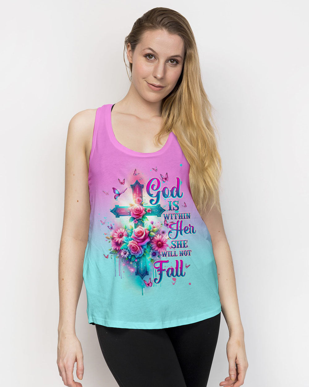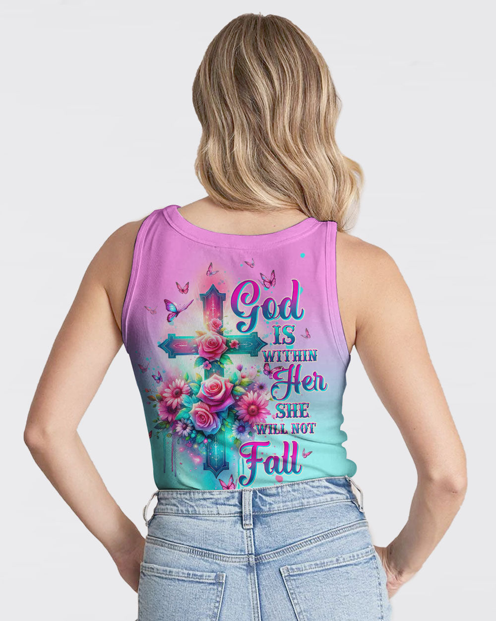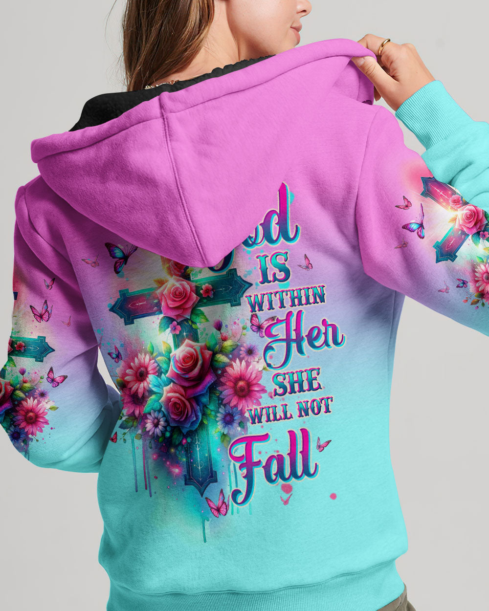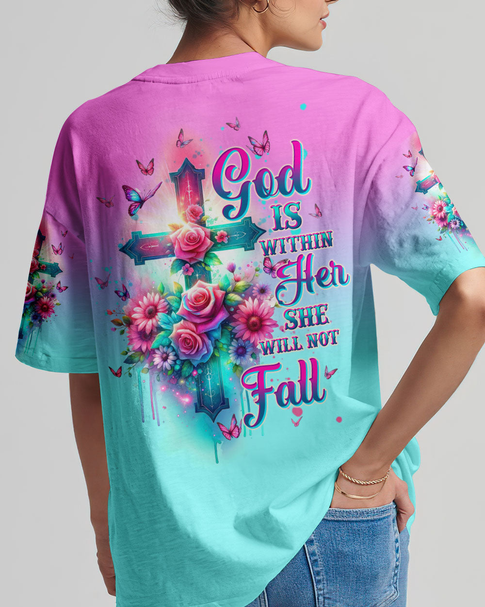 Embrace divine elegance with our God Is Within Her Rose Cross All Over Print. A glowing cross, intertwined with beautiful roses and butterflies, embodies faith and resilience. Featuring the powerful affirmation "God is within her, she will not fall," this design reminds us of the unwavering strength that comes from God's presence, providing protection and uplifting force in the face of life's challenges.