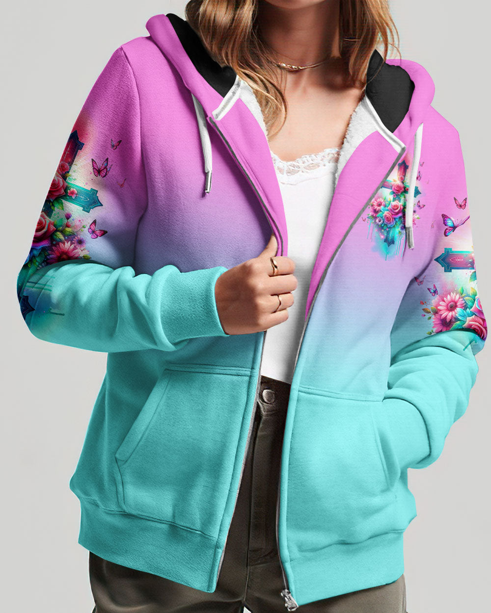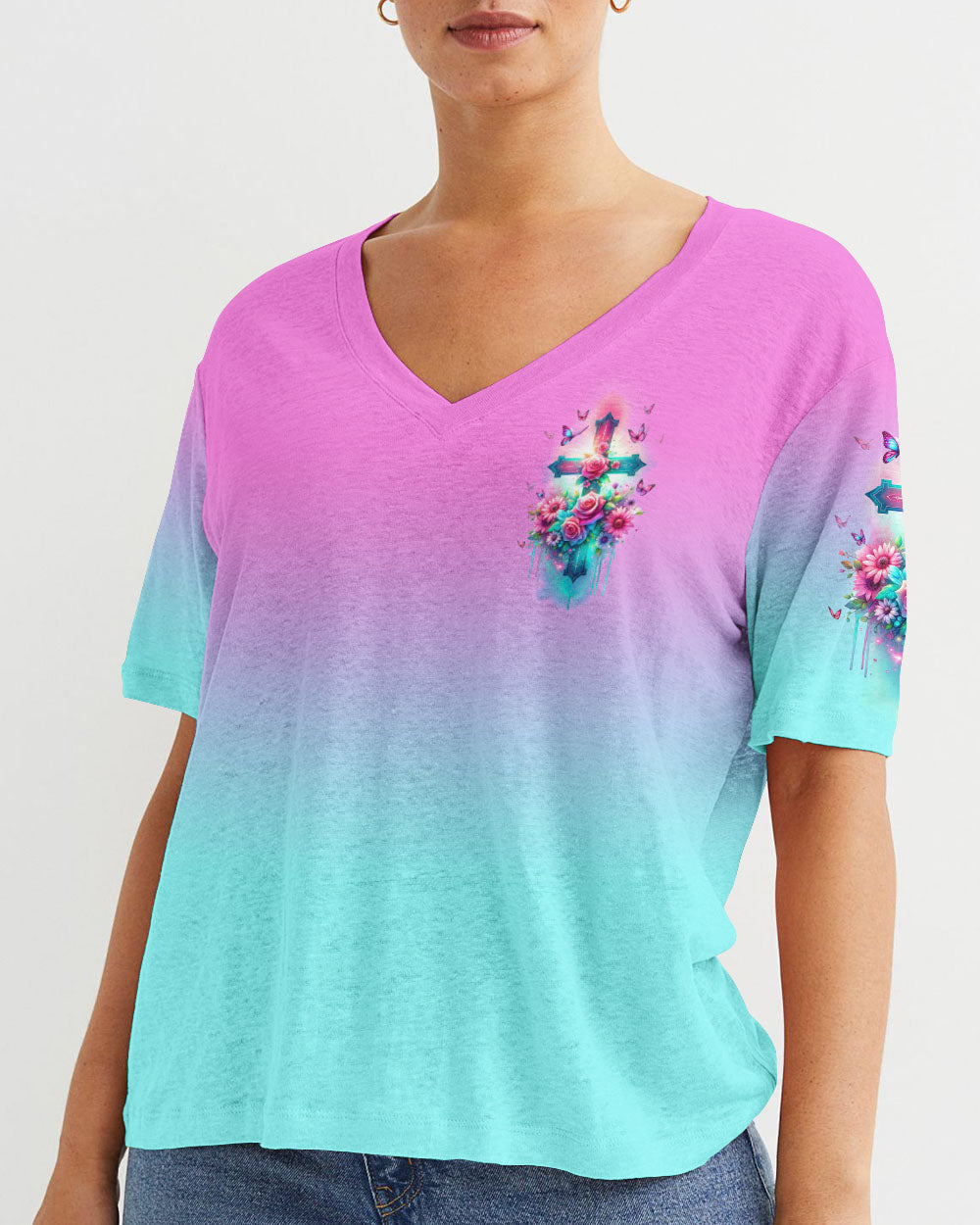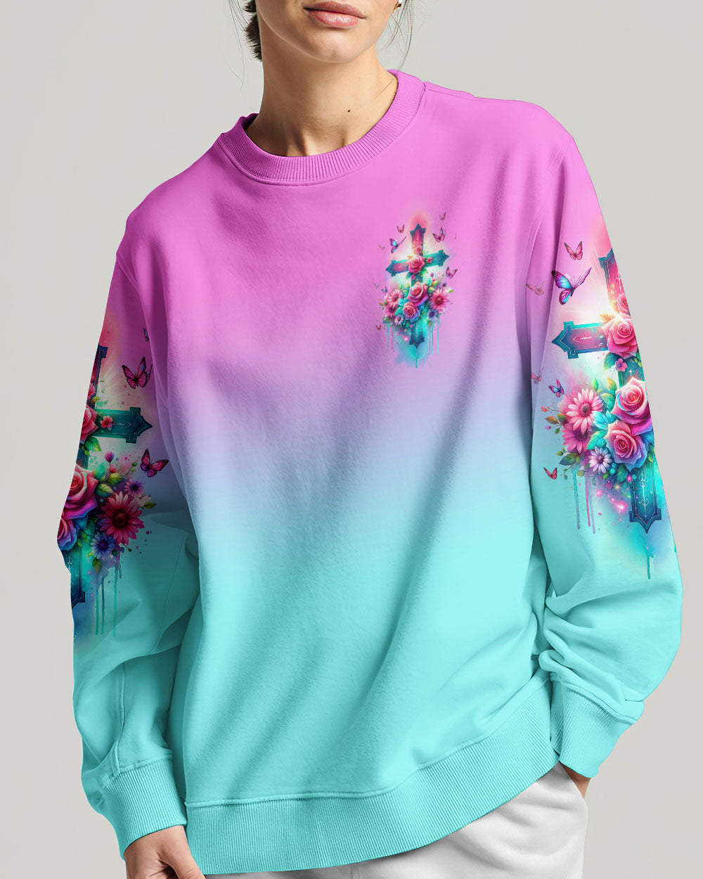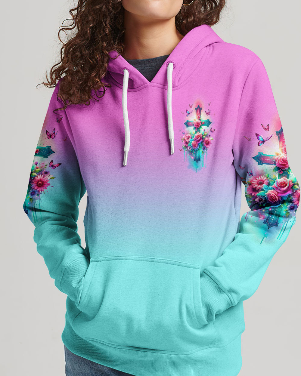 Embrace divine elegance with our God Is Within Her Rose Cross All Over Print. A glowing cross, intertwined with beautiful roses and butterflies, embodies faith and resilience. Featuring the powerful affirmation "God is within her, she will not fall," this design reminds us of the unwavering strength that comes from God's presence, providing protection and uplifting force in the face of life's challenges.