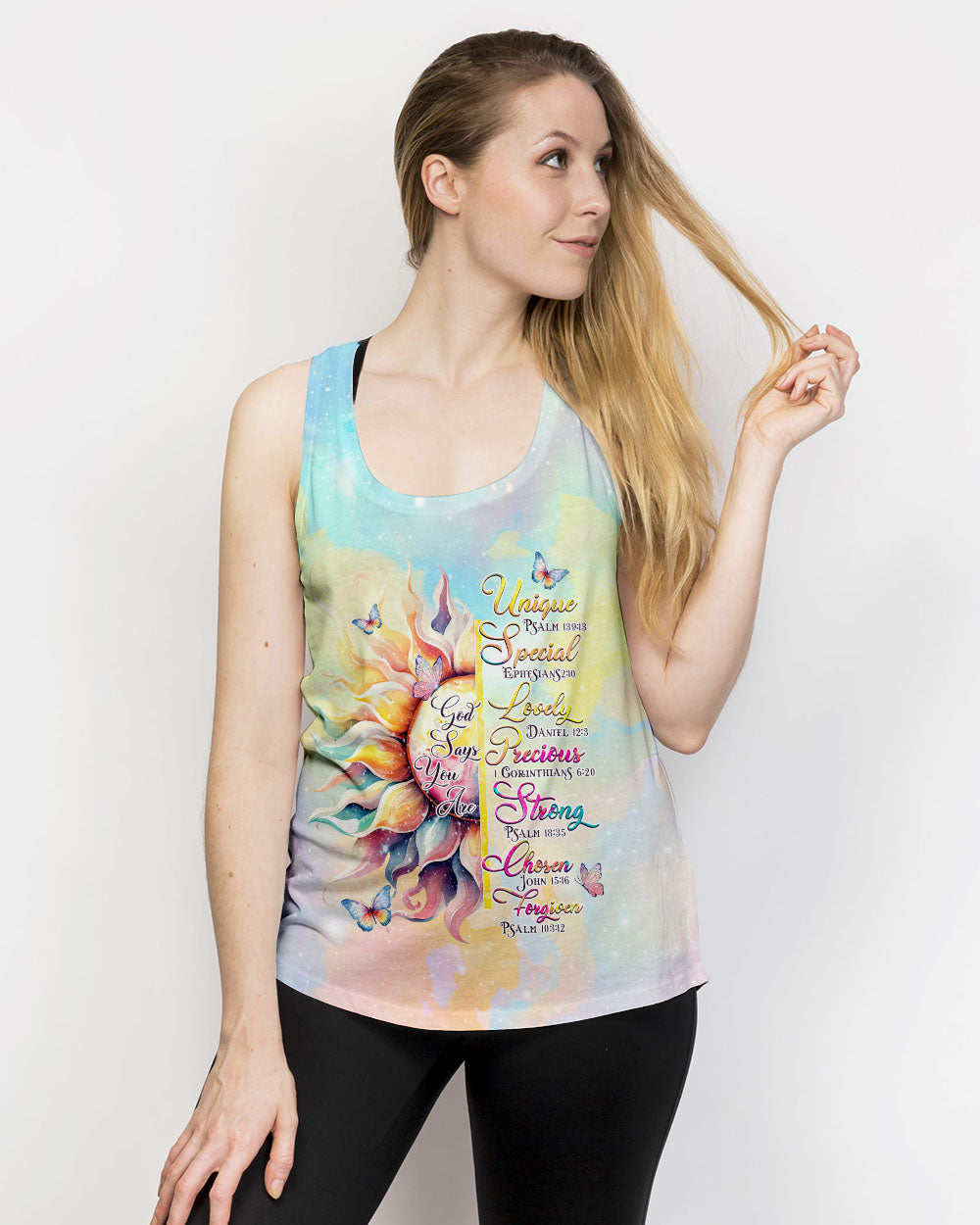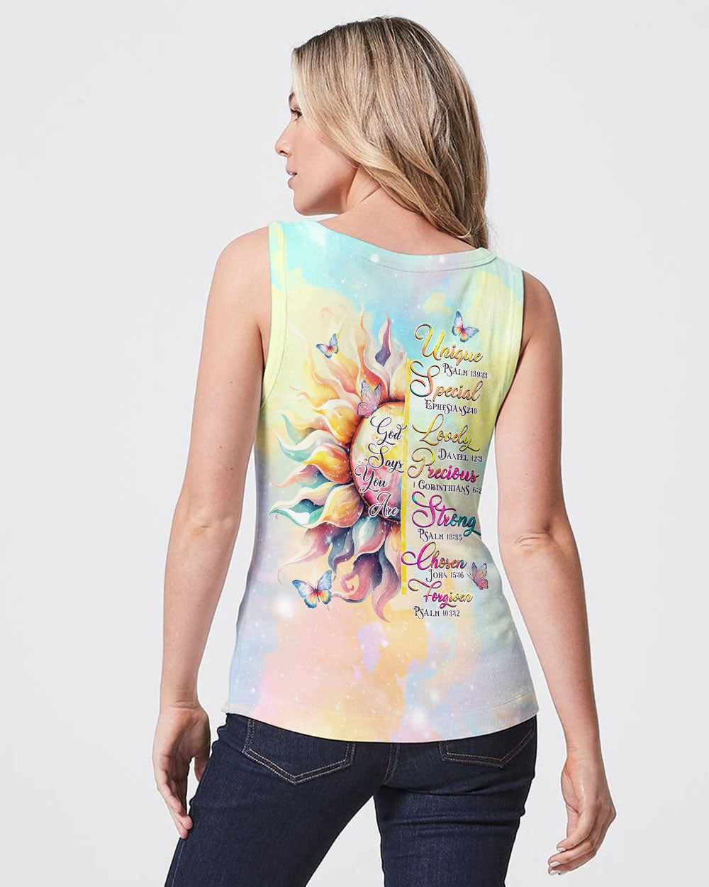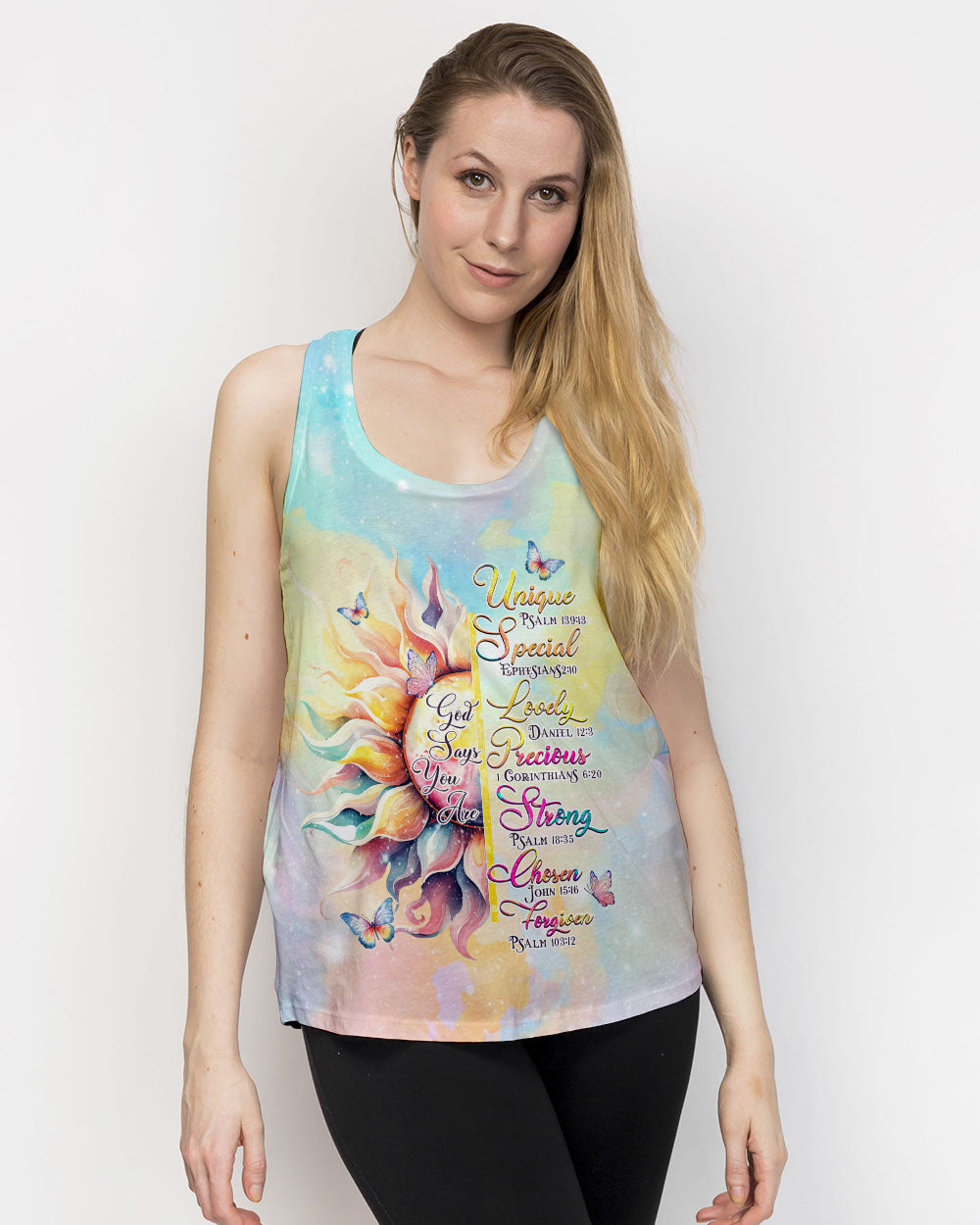 Introducing our delightful pastel sunflower design, brimming with warmth and joy. The quote "God says you are unique, special, lovely, precious, strong, chosen, forgiven" echoes divine affirmation, reminding us of our inherent worth and unconditional love. Embrace your identity and walk confidently in faith with this inspiring reminder.