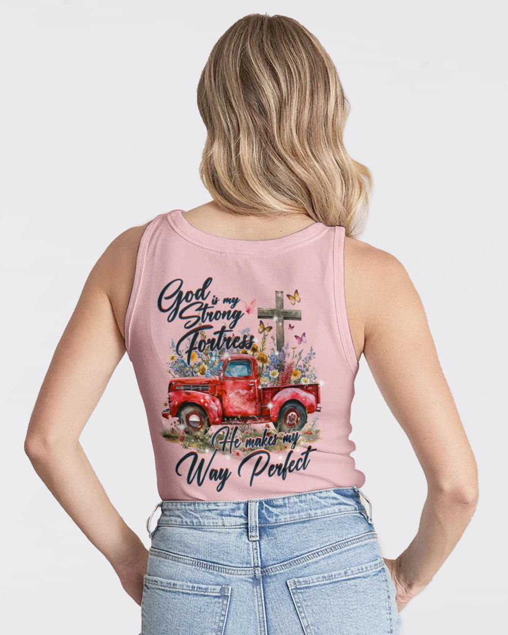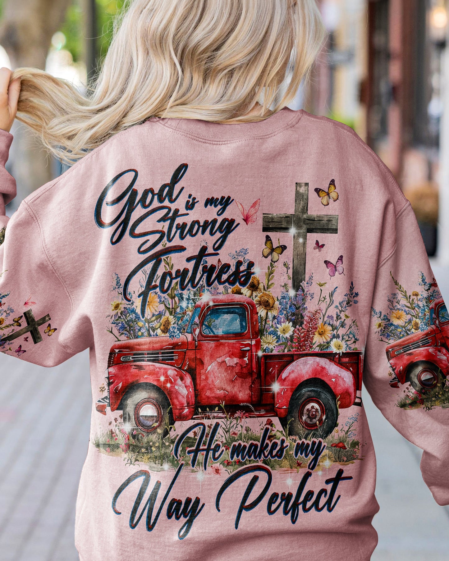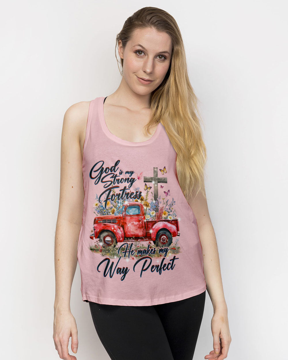 Embrace the beauty of divine guidance with our He Makes My Way Perfect Women's All Over Print Shirt. Featuring flower trucks, crosses, and butterflies, this Christian-inspired design signifies the blossoming strength of faith. With the quote "God is my strong fortress. He makes my way perfect," this shirt represents spiritual growth and resilience.