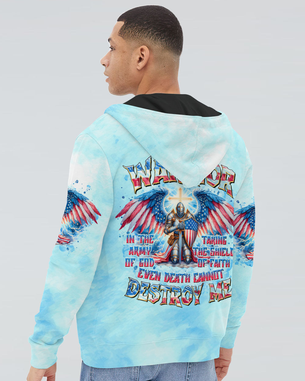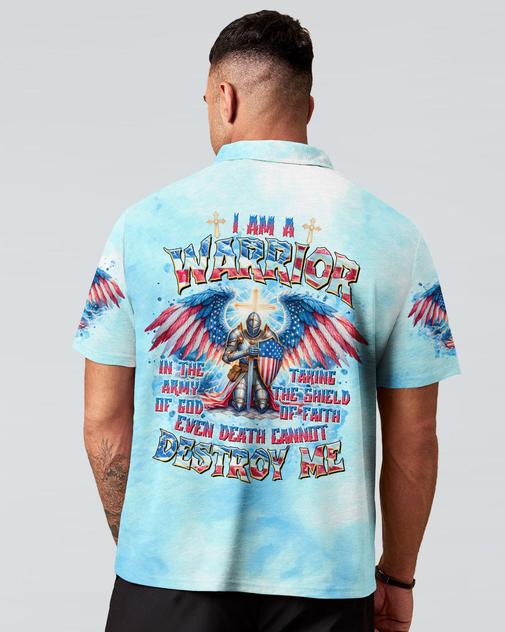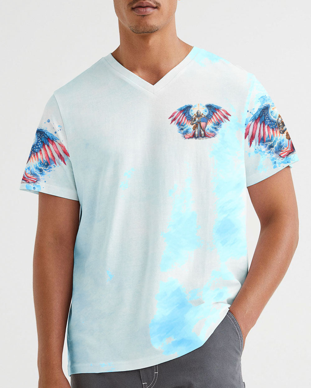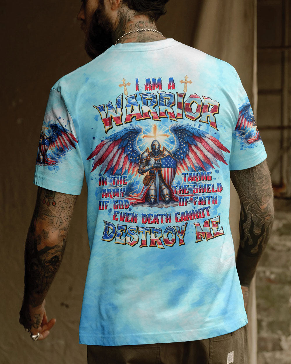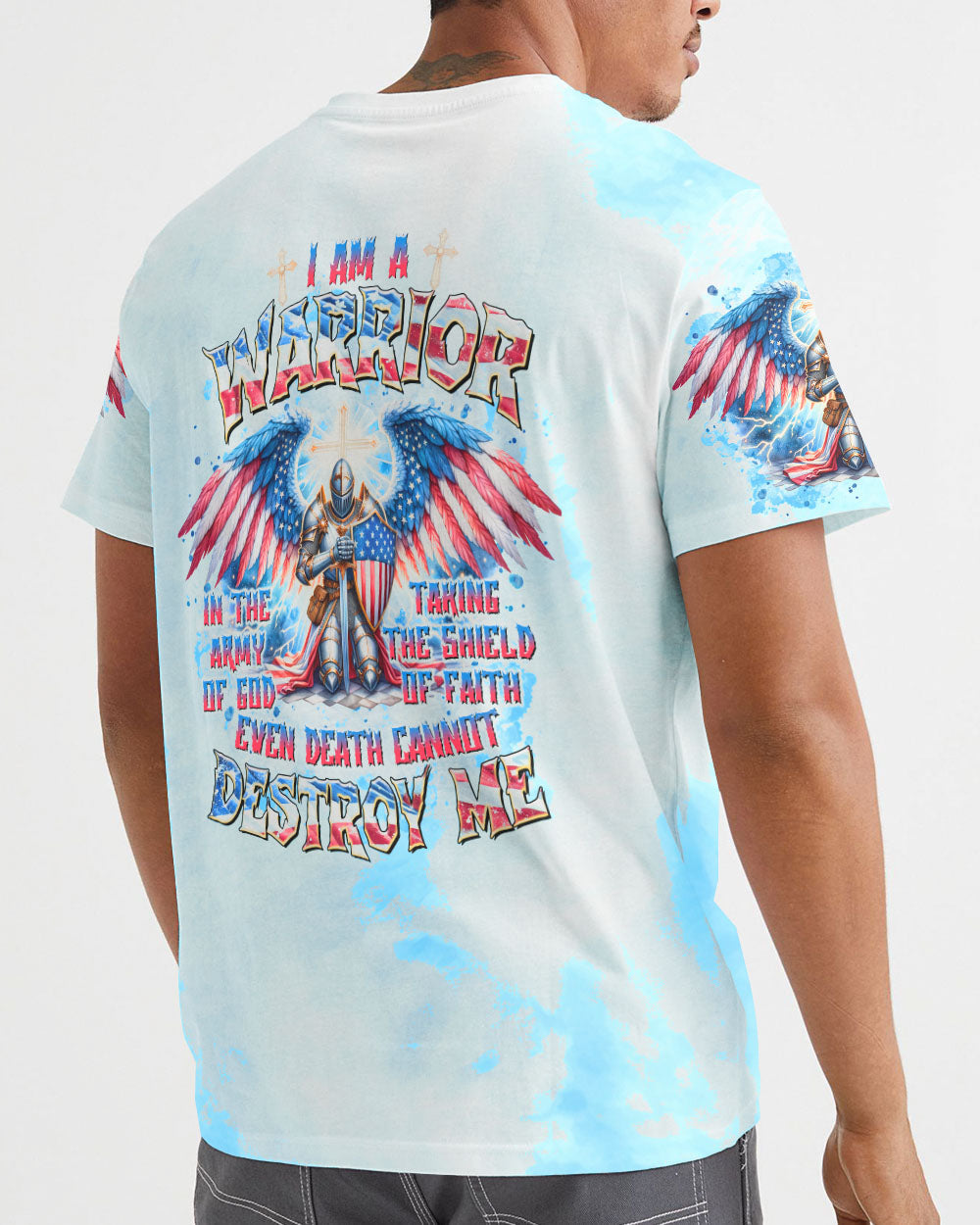 This men's all over print shirt showcases your unwavering faith and bravery as a warrior in God's army. Featuring majestic wings and lightning bolts, it also declares your trust in God's protection and the power of faith. With this powerful design, you will have the strength and conviction to face any challenge.