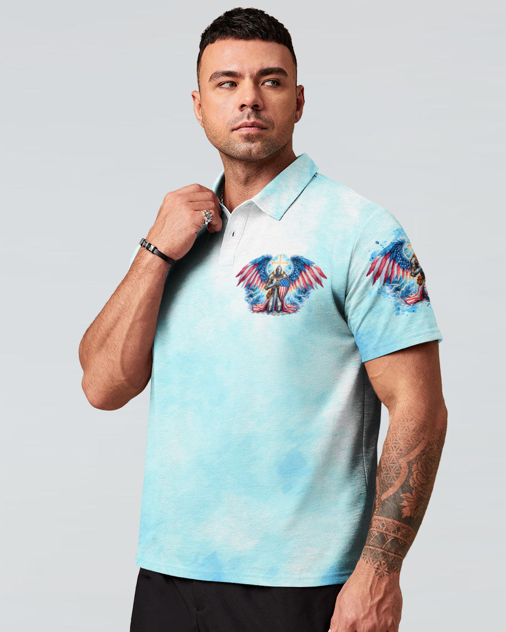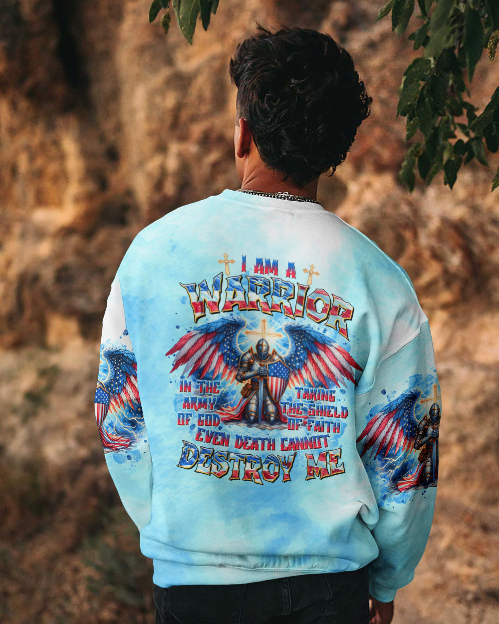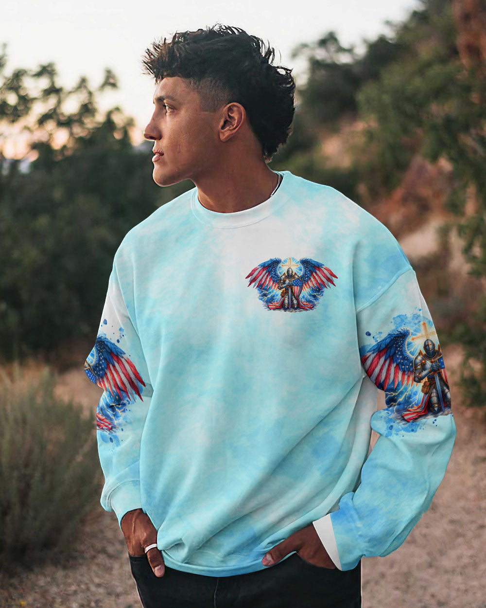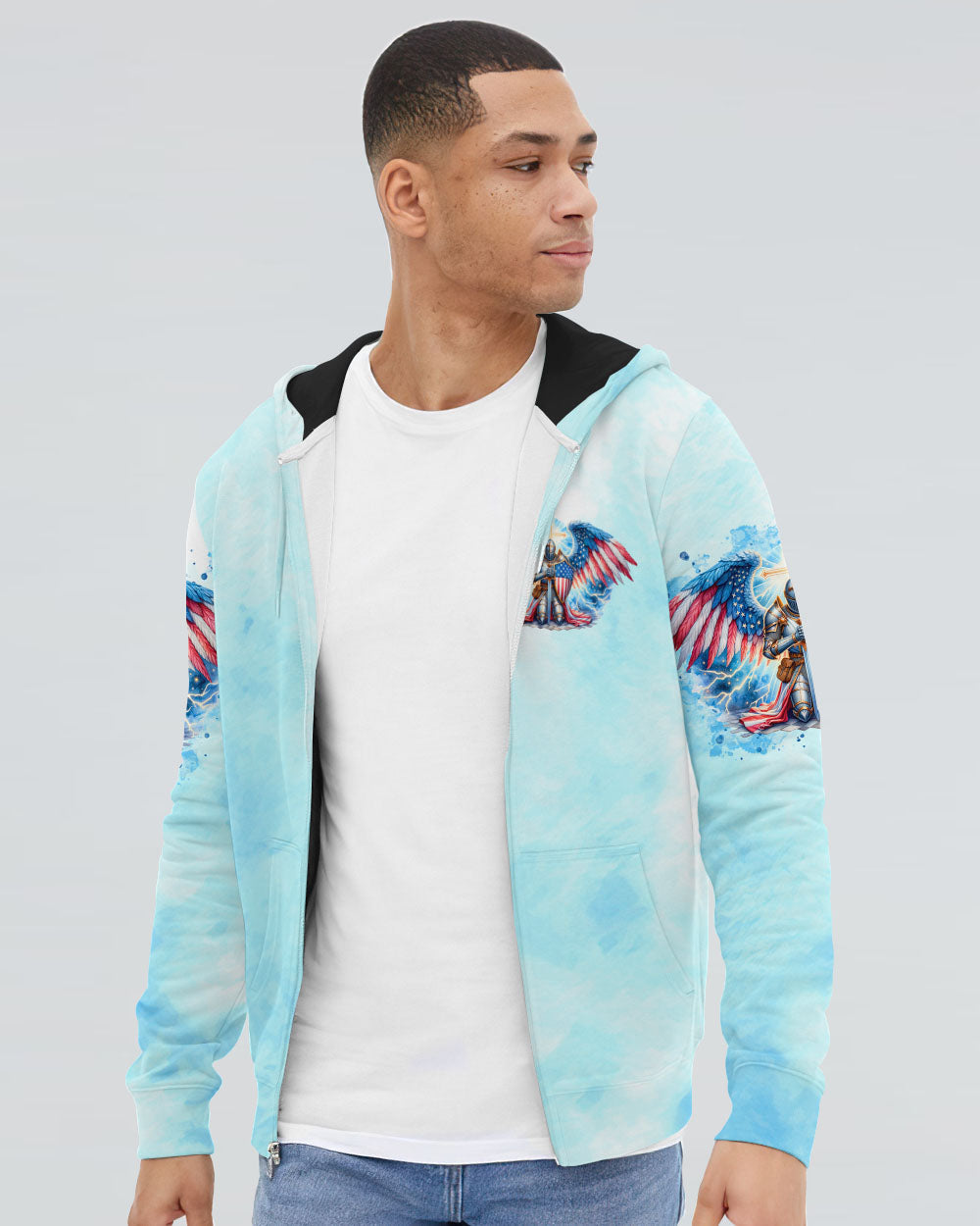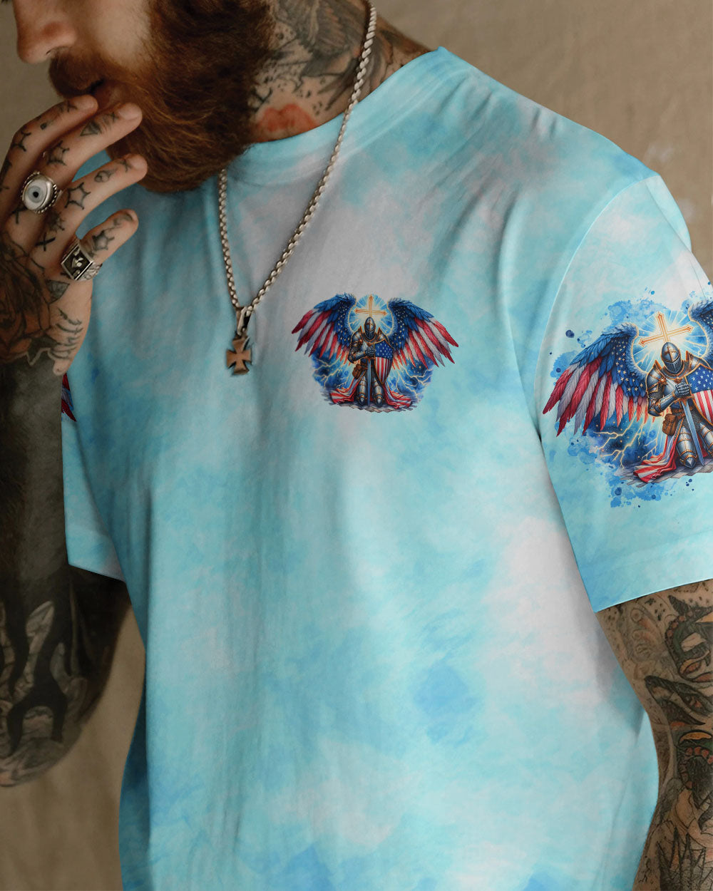 This men's all over print shirt showcases your unwavering faith and bravery as a warrior in God's army. Featuring majestic wings and lightning bolts, it also declares your trust in God's protection and the power of faith. With this powerful design, you will have the strength and conviction to face any challenge.