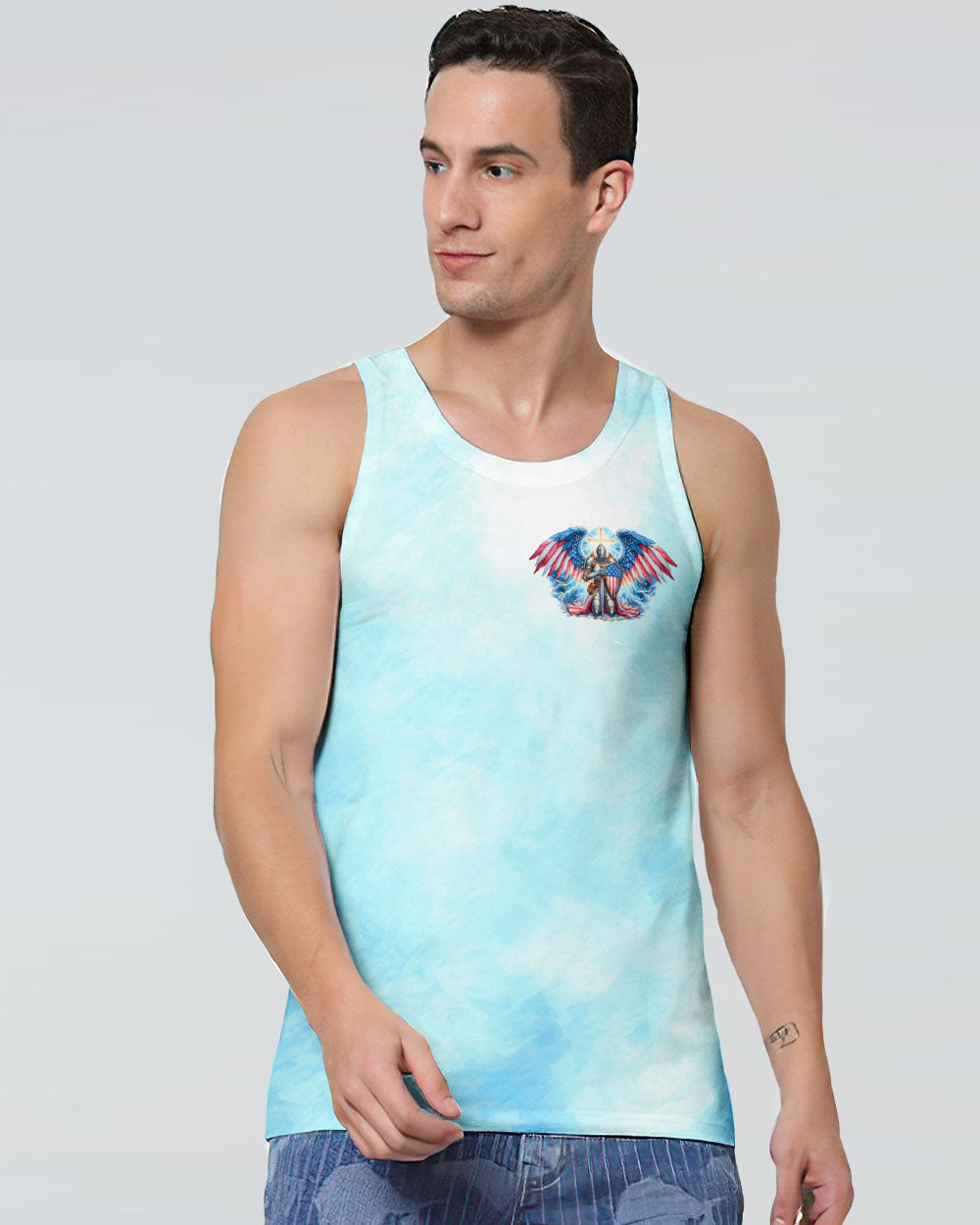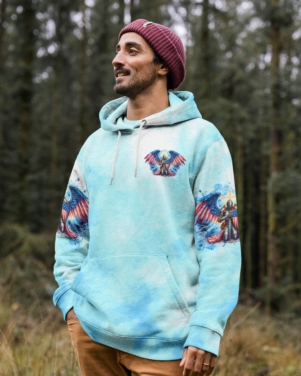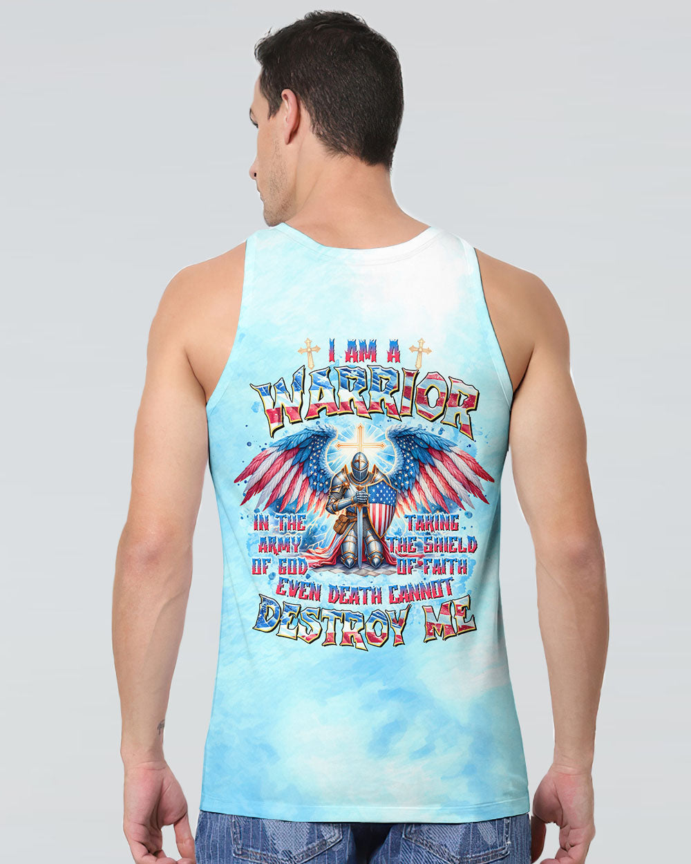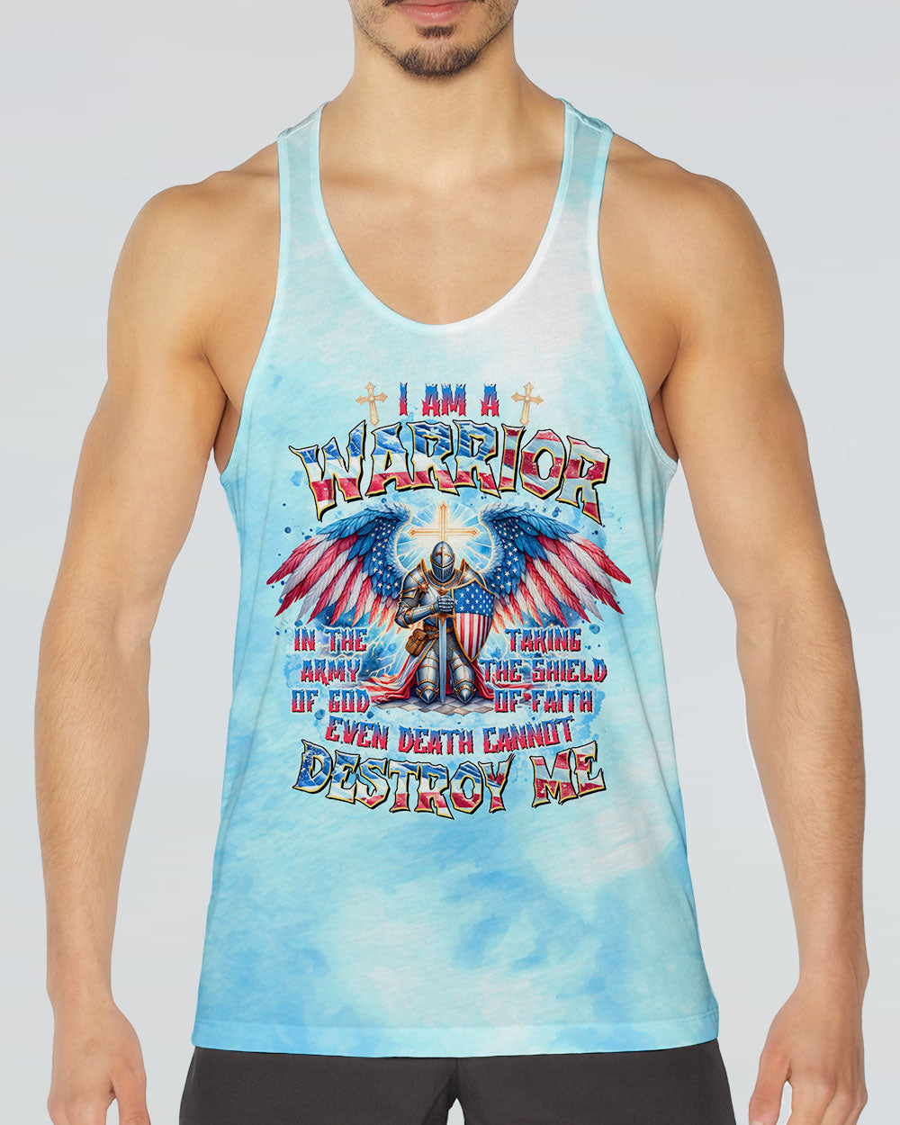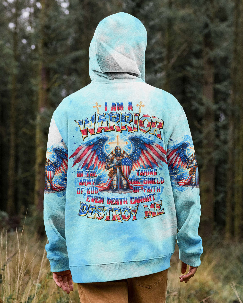 This men's all over print shirt showcases your unwavering faith and bravery as a warrior in God's army. Featuring majestic wings and lightning bolts, it also declares your trust in God's protection and the power of faith. With this powerful design, you will have the strength and conviction to face any challenge.