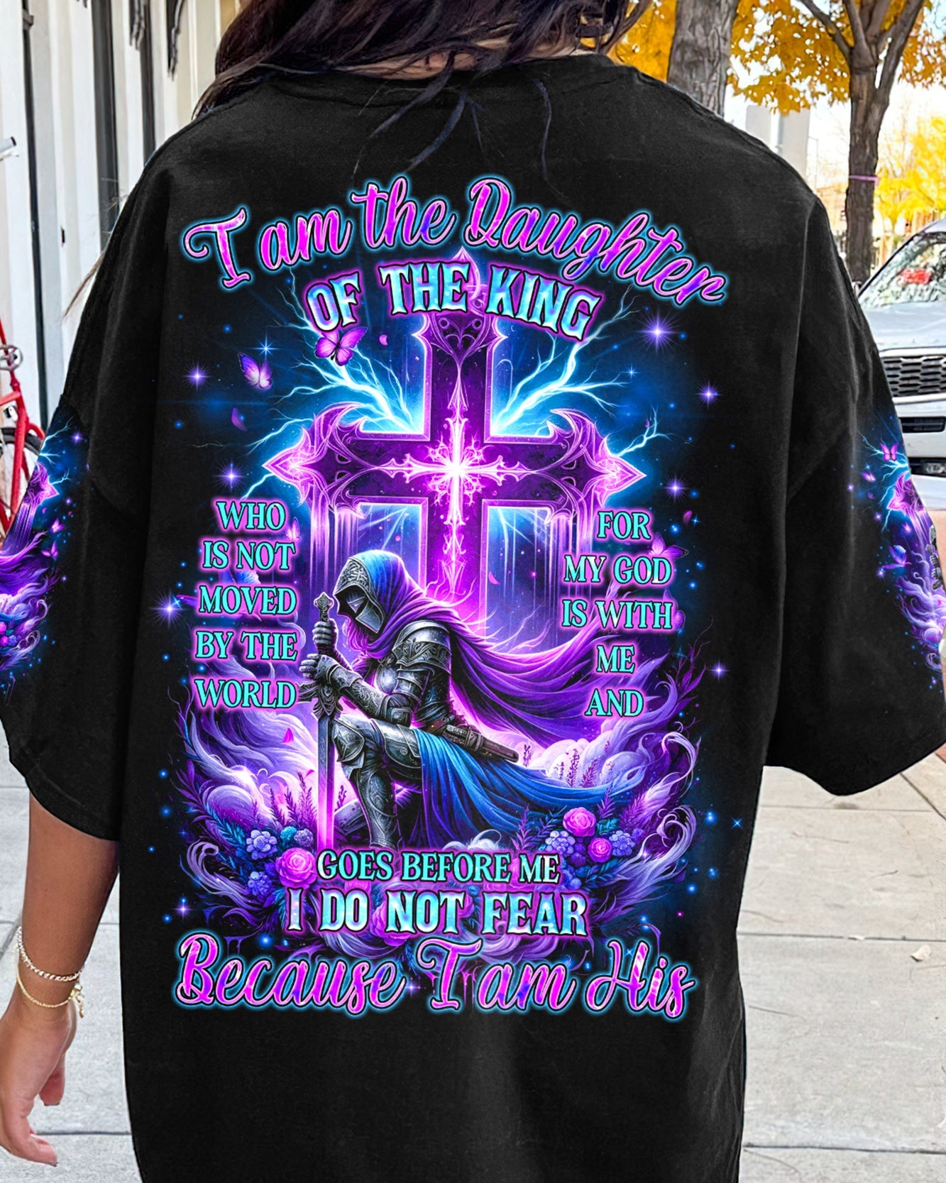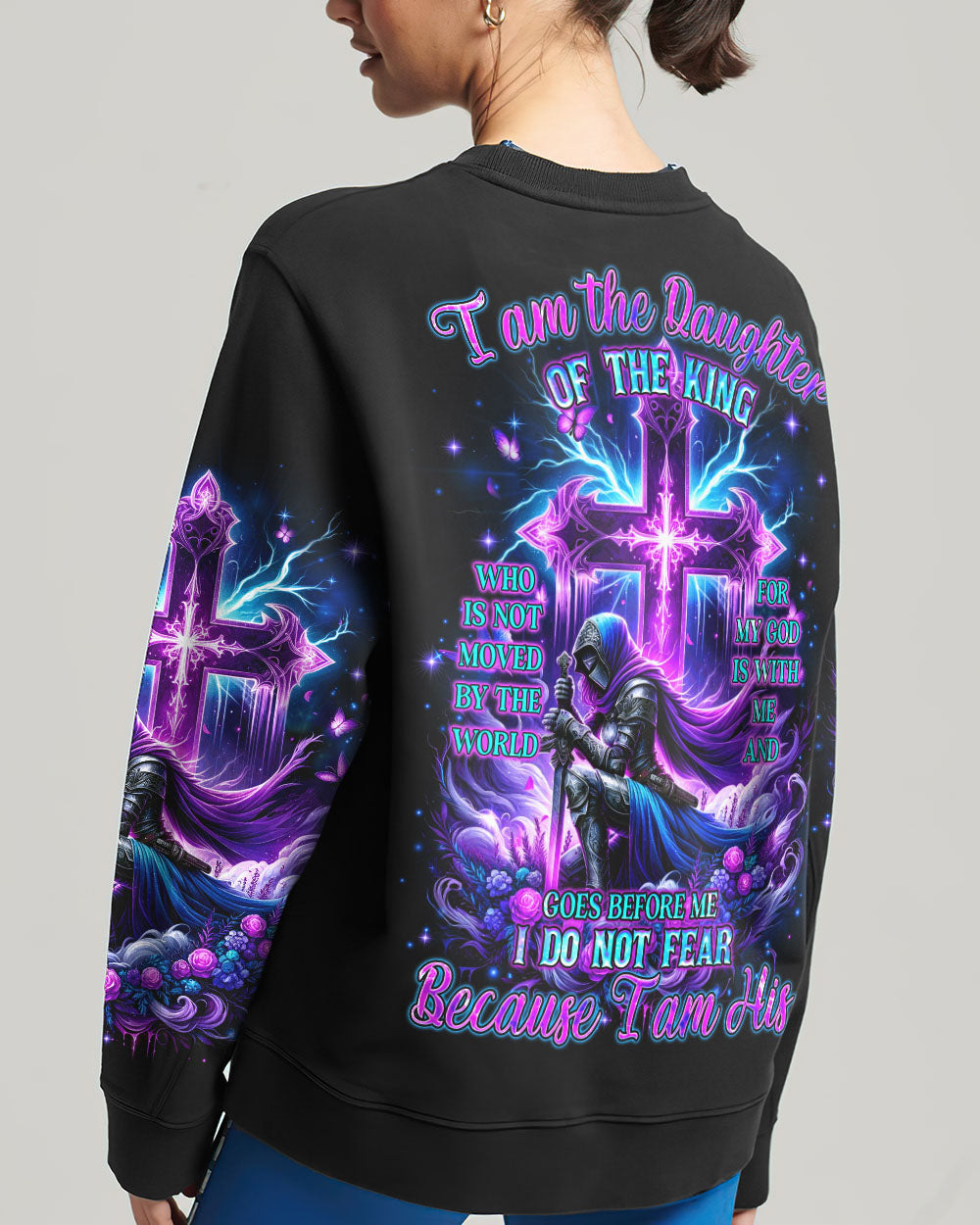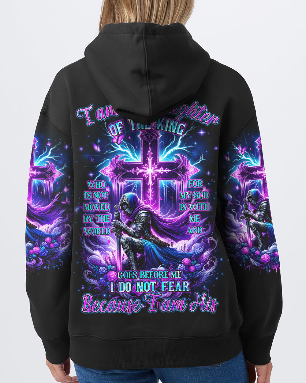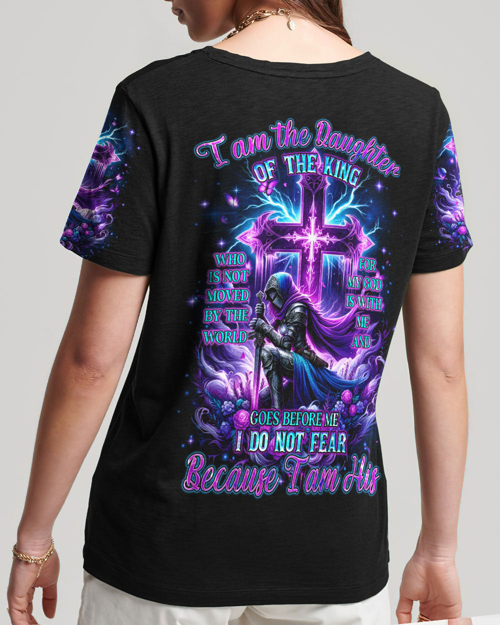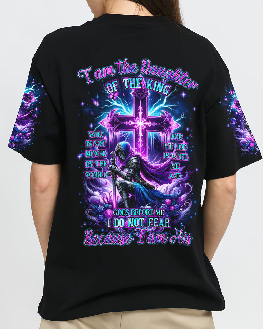 Embrace your divine identity with our 'I Am The Daughter Of The King' shirt. This bold design features a female warrior kneeling before a cross, surrounded by powerful symbols of roses and butterflies. The backdrop of thunder represents the almighty strength of God. With the inspiring quote "I am the daughter of the King," this shirt is a declaration of faith and courage.