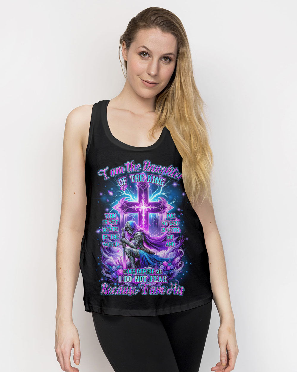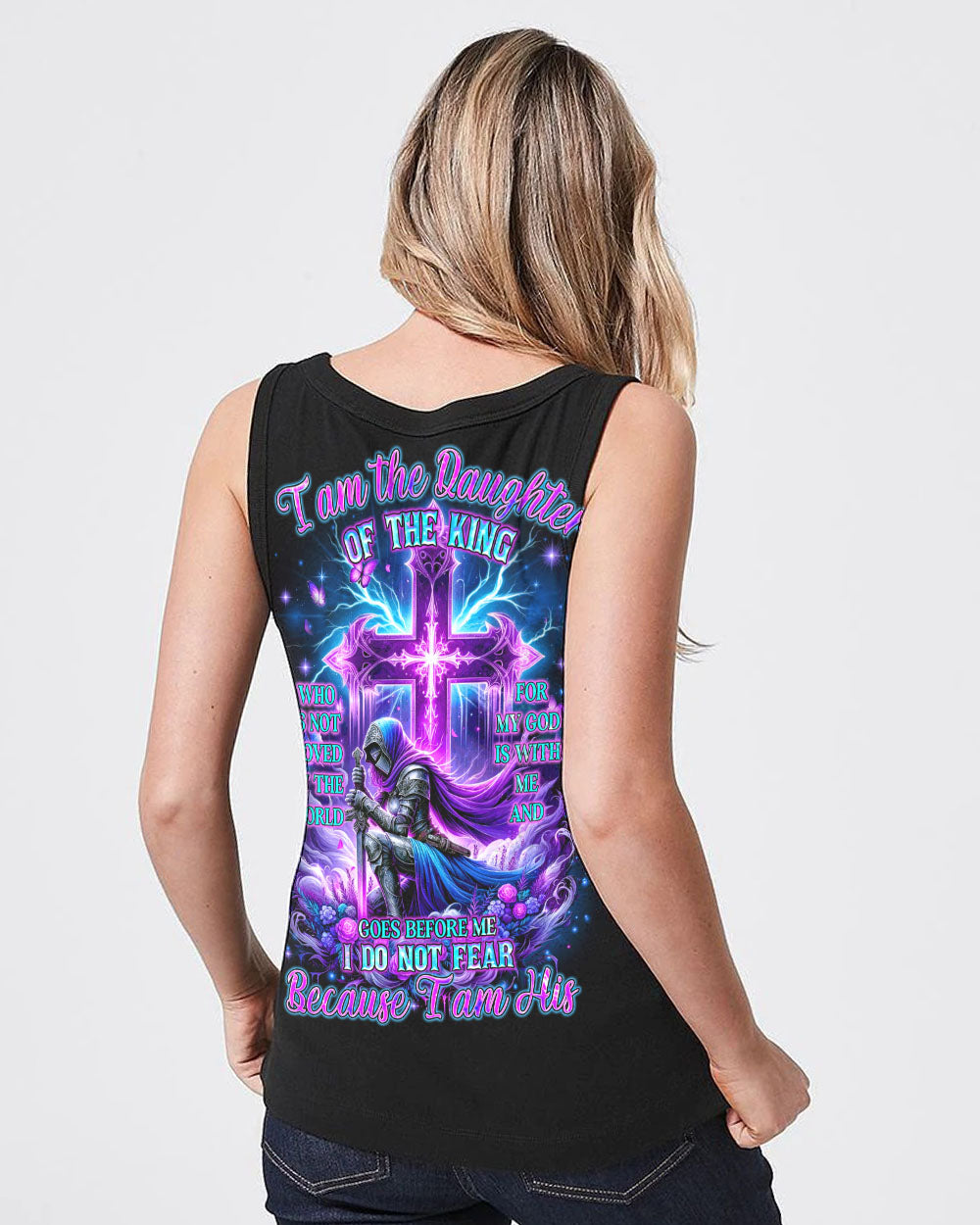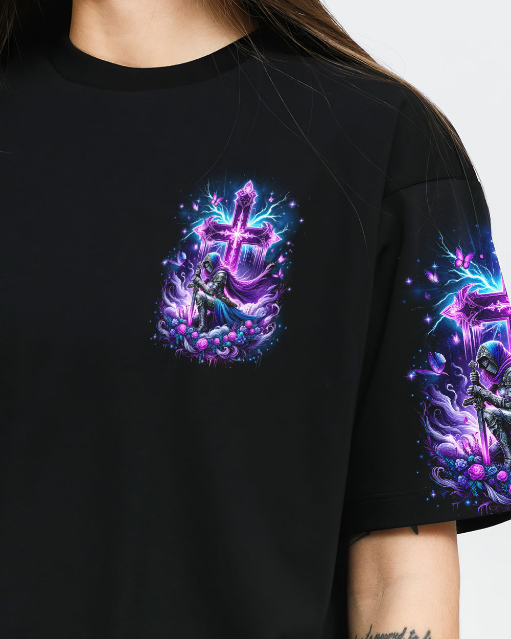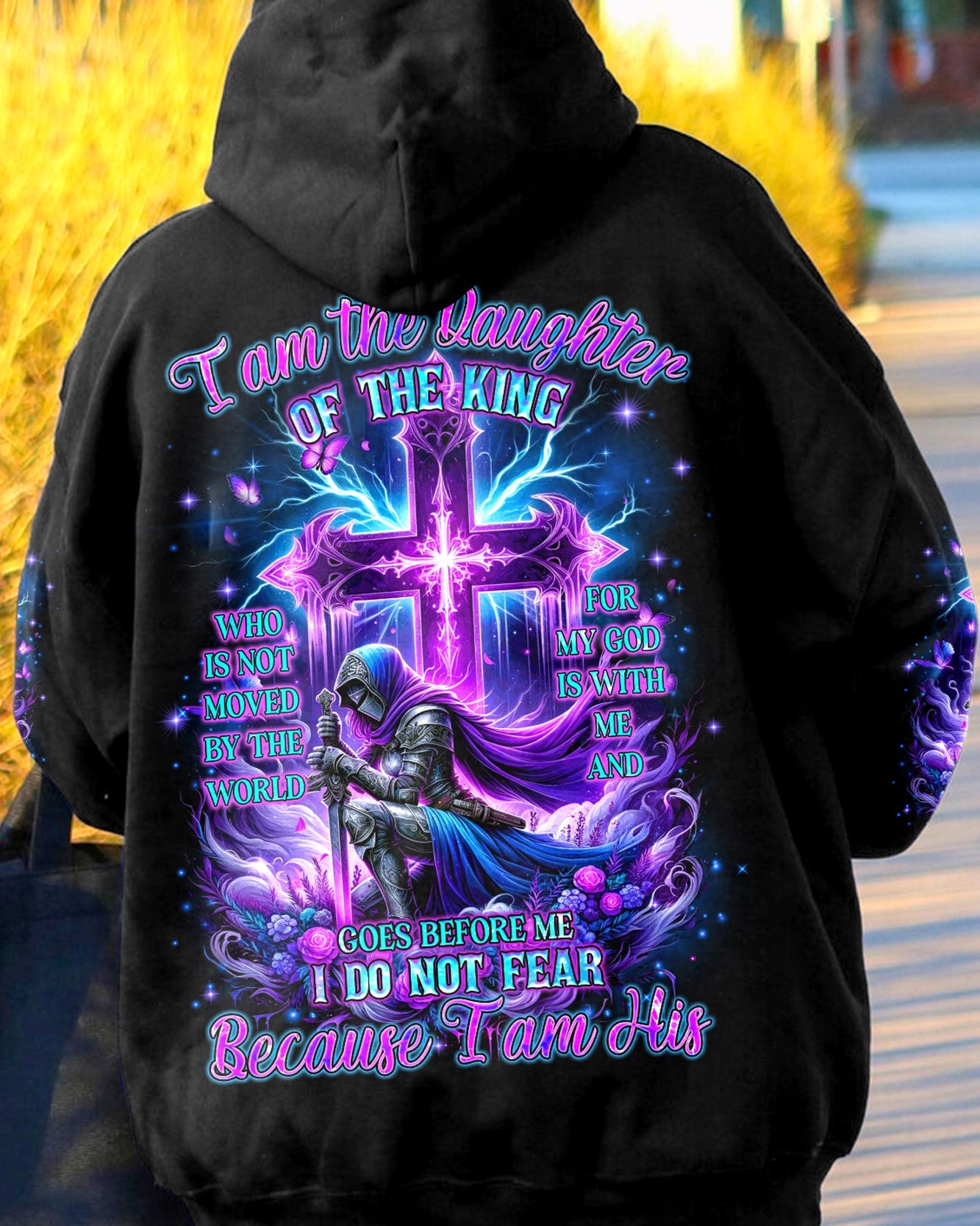Embrace your divine identity with our 'I Am The Daughter Of The King' shirt. This bold design features a female warrior kneeling before a cross, surrounded by powerful symbols of roses and butterflies. The backdrop of thunder represents the almighty strength of God. With the inspiring quote "I am the daughter of the King," this shirt is a declaration of faith and courage.