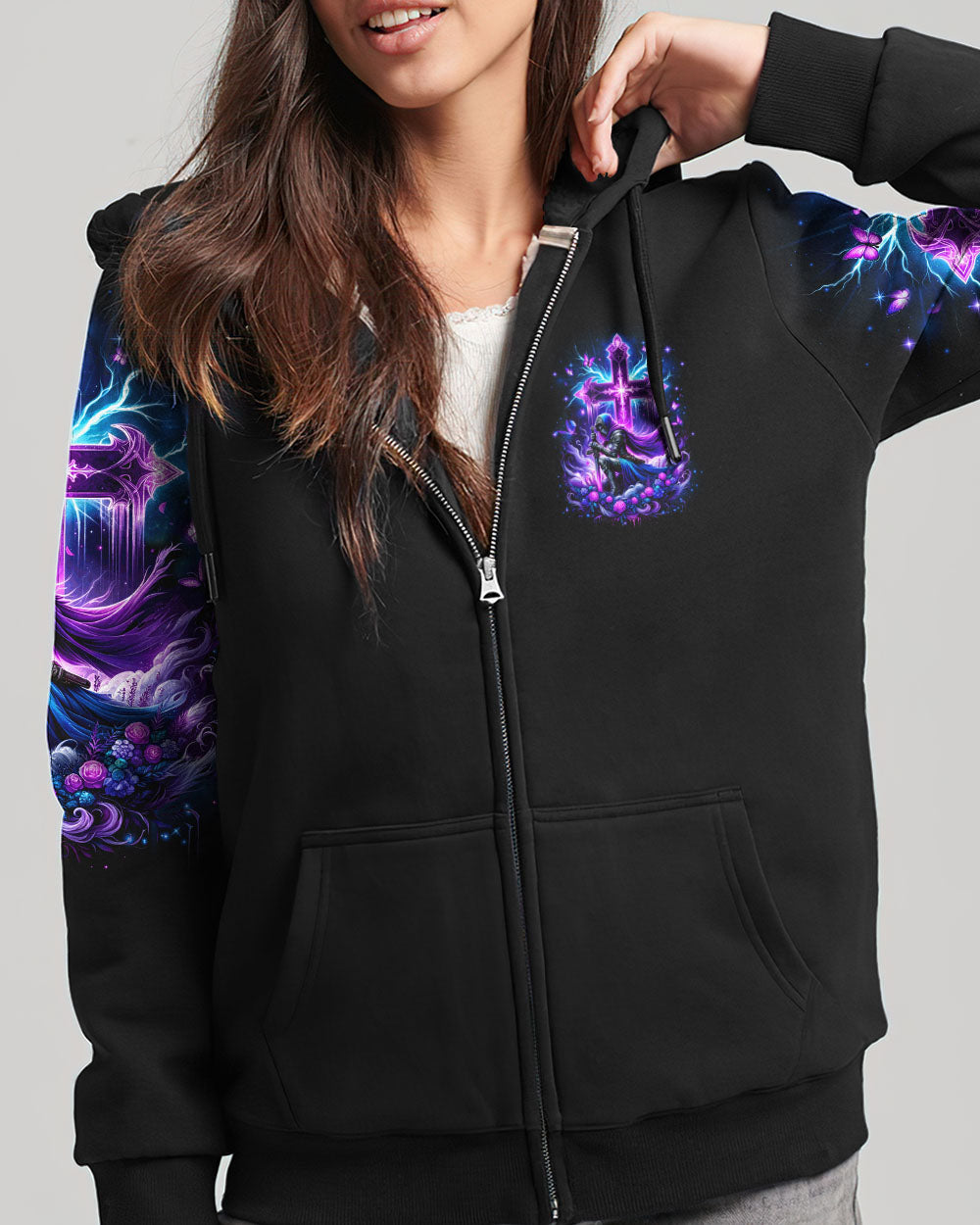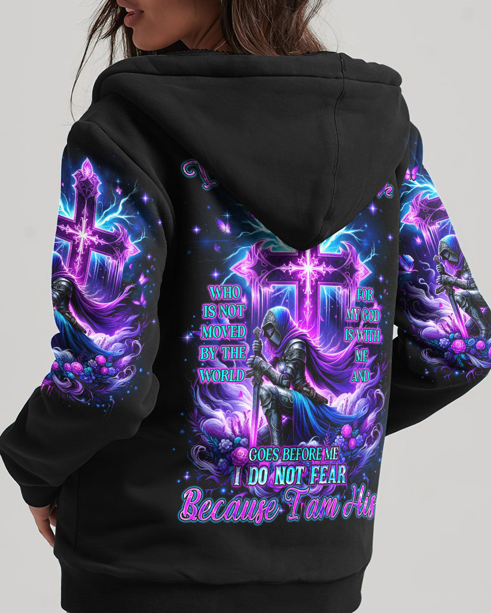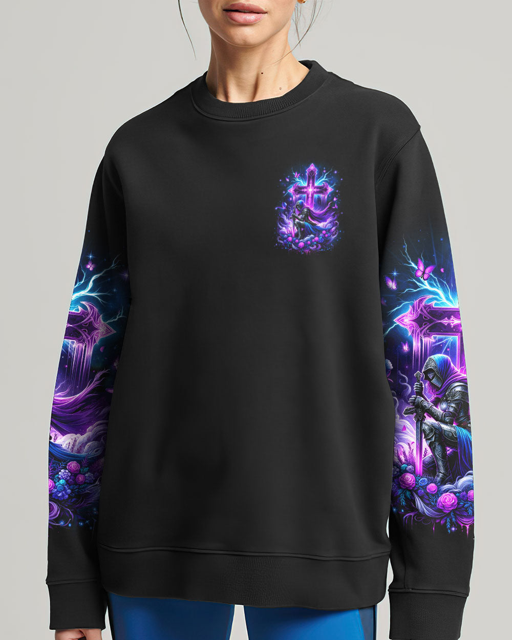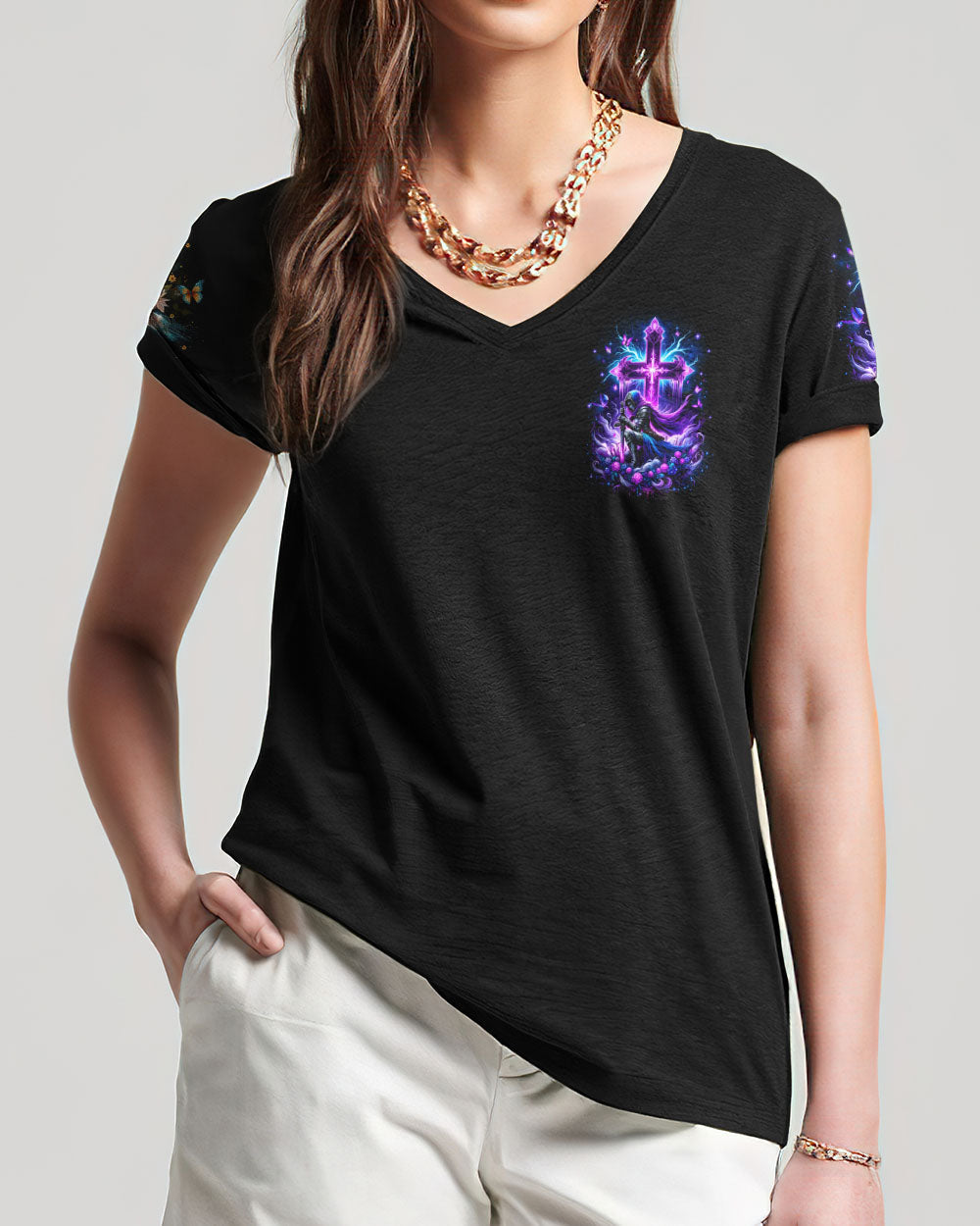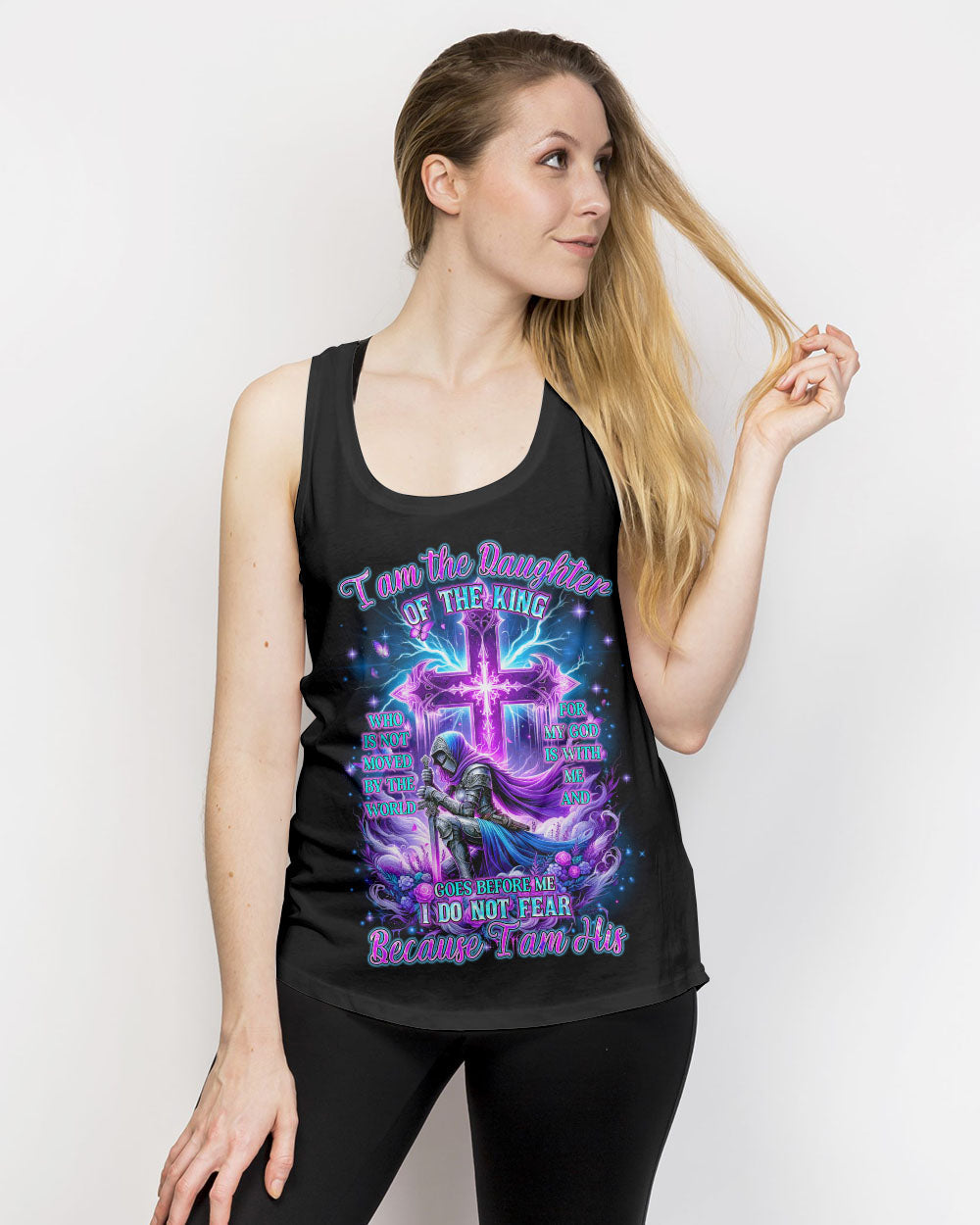 Embrace your divine identity with our 'I Am The Daughter Of The King' shirt. This bold design features a female warrior kneeling before a cross, surrounded by powerful symbols of roses and butterflies. The backdrop of thunder represents the almighty strength of God. With the inspiring quote "I am the daughter of the King," this shirt is a declaration of faith and courage.