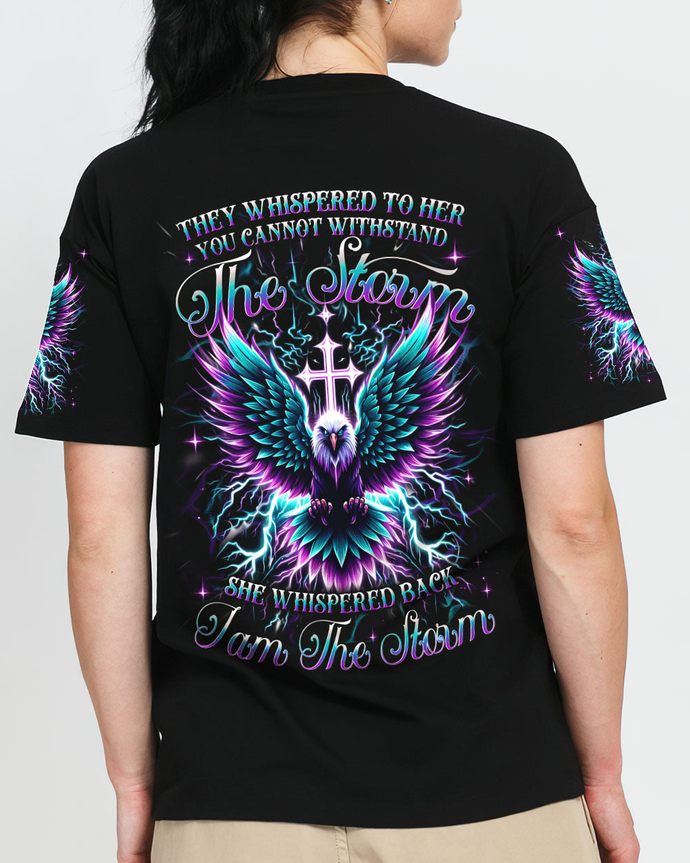 Revel in the strength and grace of this unique Eagle Cross Women's All Over Print Shirt. Featuring a powerful image of a majestic eagle and the indomitable quote, "They Whispered To Her You Can't Withstand The Storm, She Whispered Back I Am The Storm," this design symbolizes resilience and unwavering faith. Show off your spirit in style and order this shirt today.