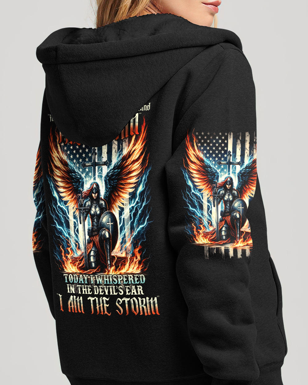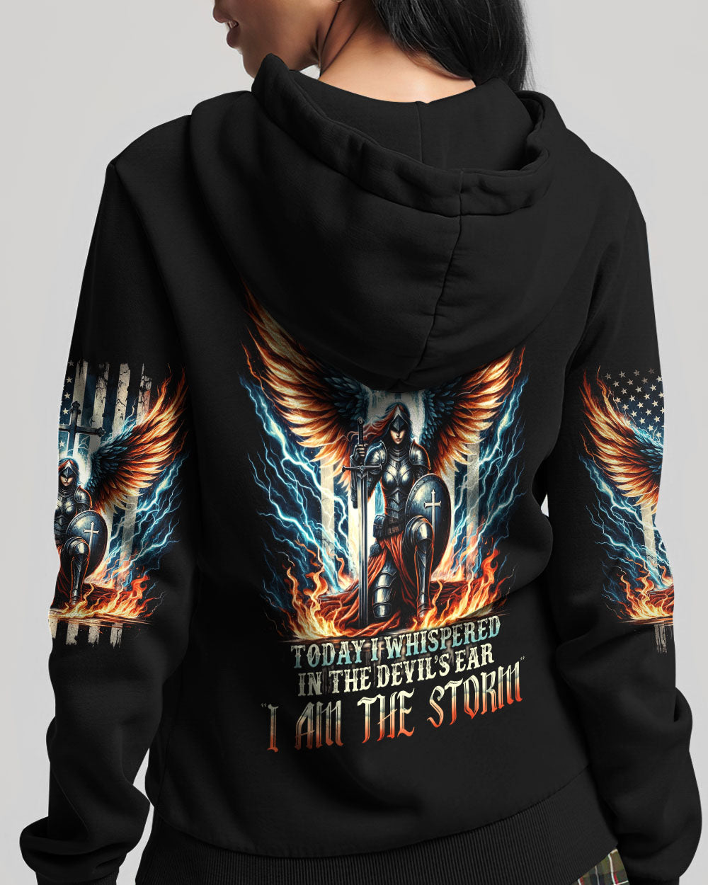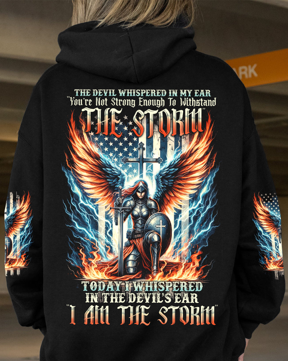Immerse yourself in the heart of Christian faith with our breathtaking design! Behold a powerful female warrior, adorned with wings, kneeling in unwavering devotion before the cross, symbolizing her strength through God. The imagery of flames and thunderbolts invokes divine power and protection. The quote, "The devil whispered in my ear 'you're not strong enough to withstand the storm.' Today I whisper in the devil's ear 'I am the storm,'" beautifully encapsulates the unwavering spirit of Christian belief. Don't miss the chance to own this remarkable and profound design that embodies the unbreakable strength of faith.
