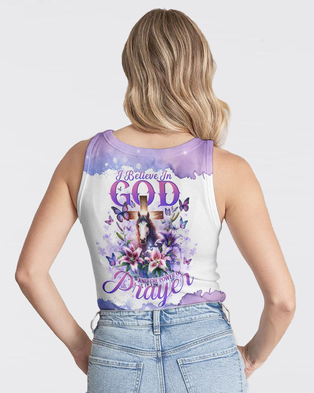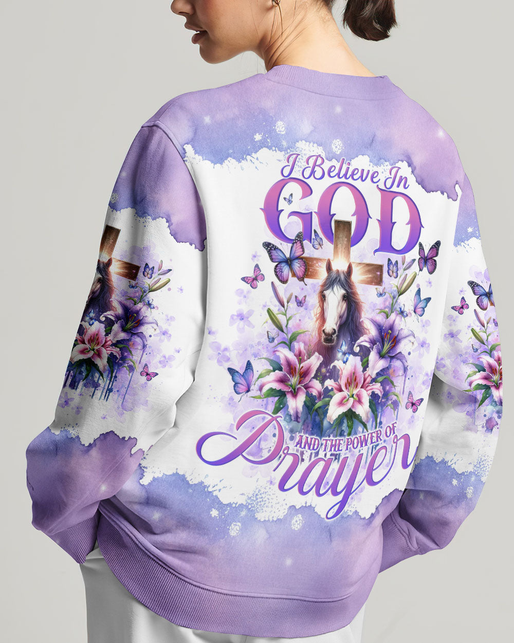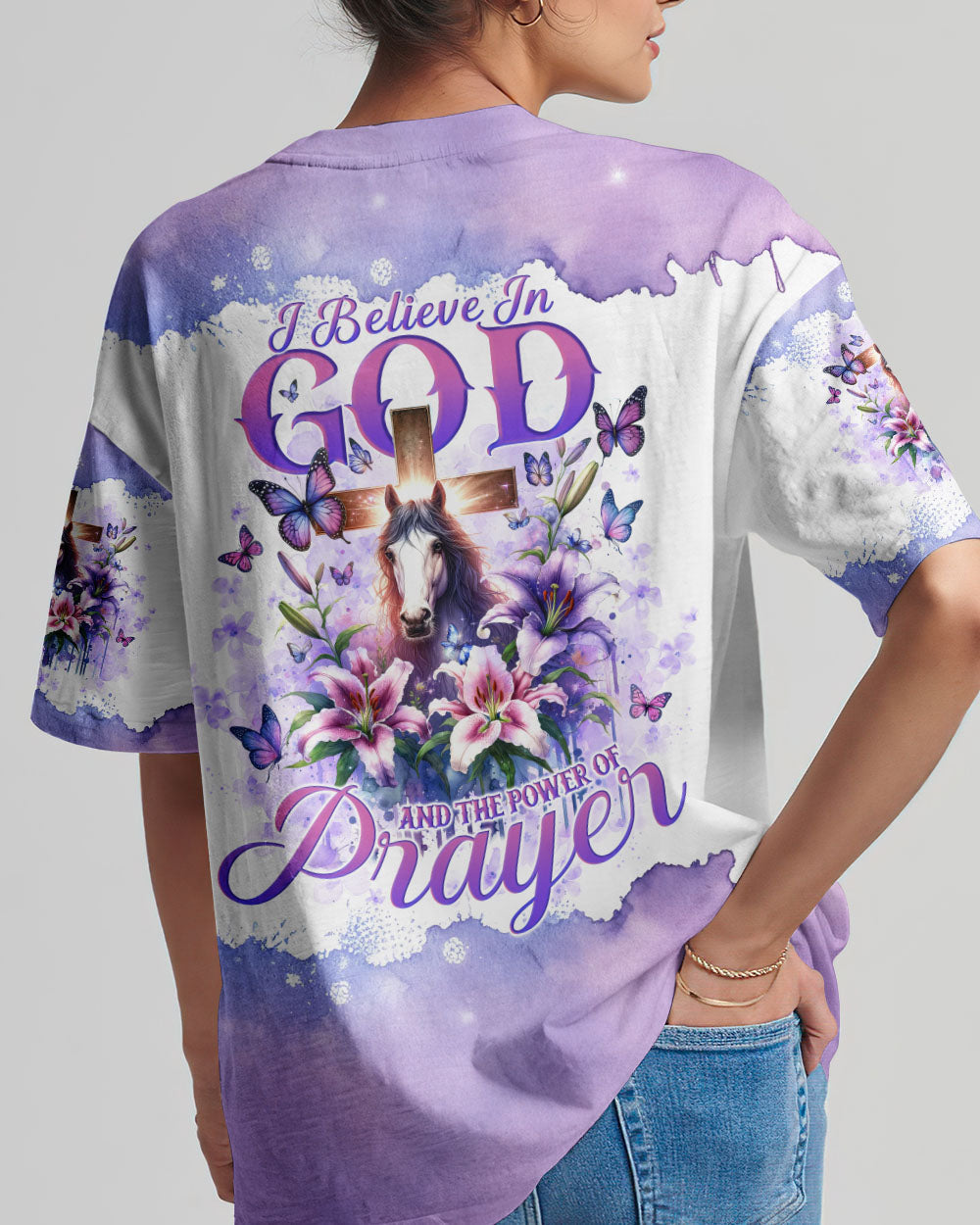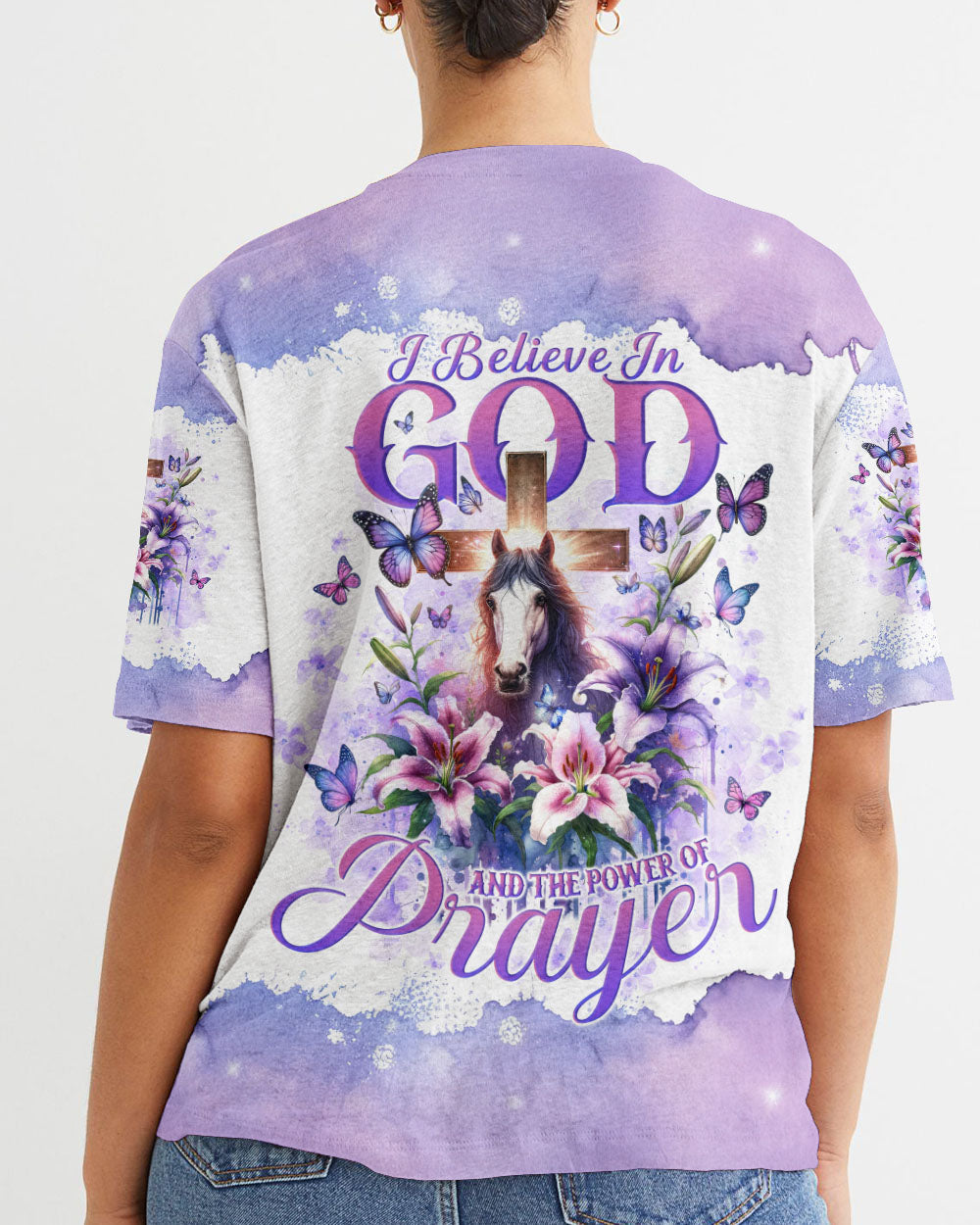 Celebrate your faith and love for horses with our exquisite design featuring a cross, lilies, and a horse. The saying, "I believe in God and the power of prayer," signifies a profound trust in the divine and the transformative strength found in heartfelt communication and spiritual devotion