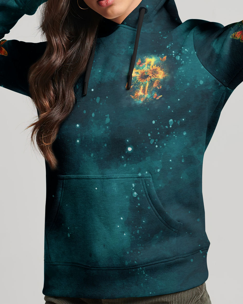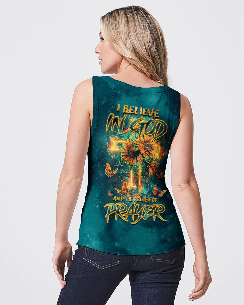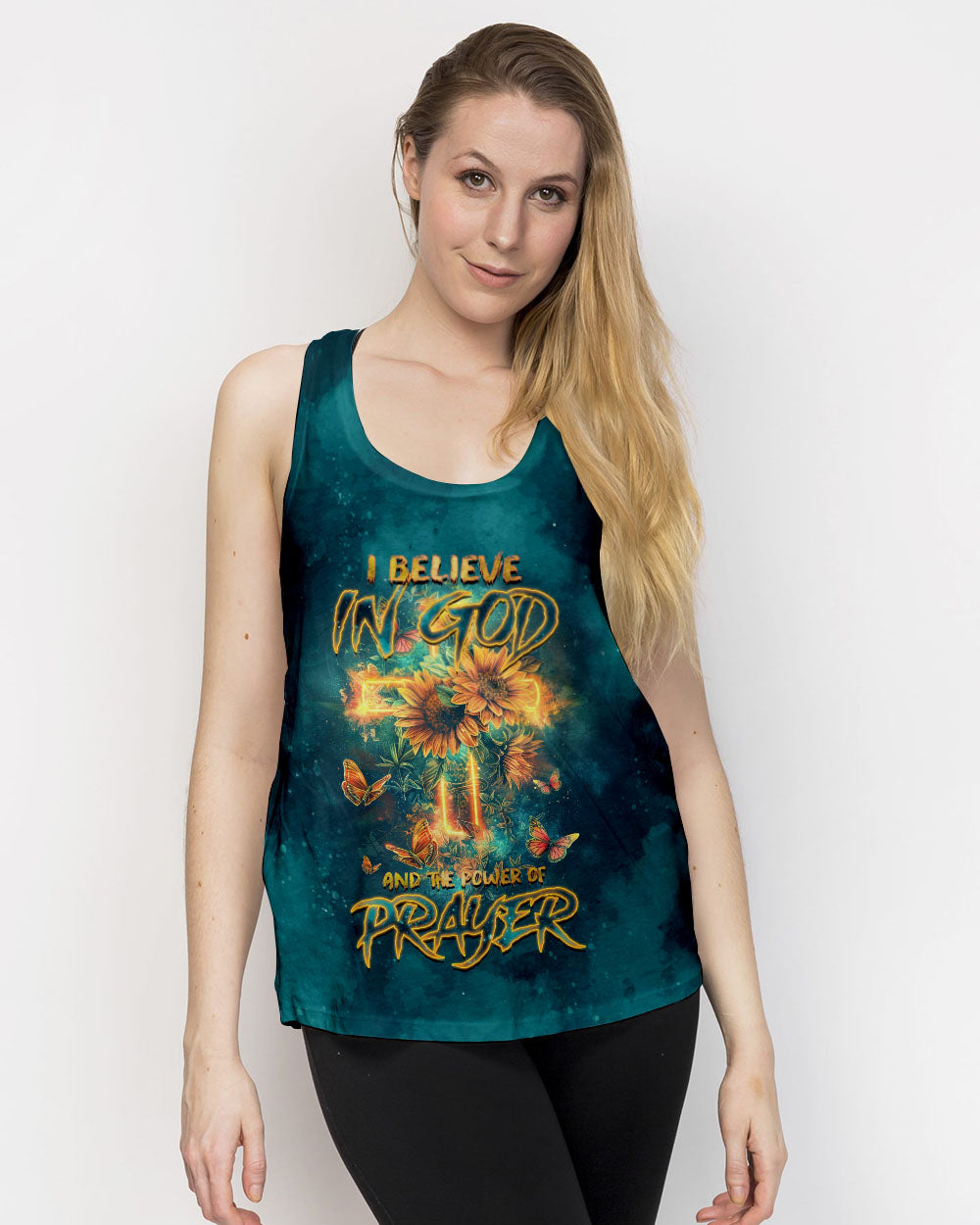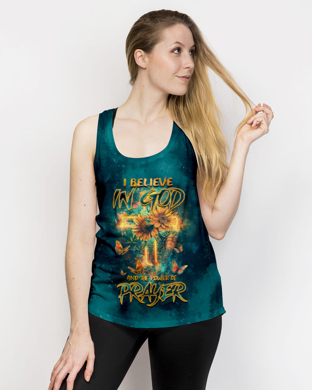 This all-over print shirt features a captivating sunflower design that exudes warmth and vitality. The statement "I believe in God and the power of prayer" serves as a reminder of the transformative strength and enduring connection to God, bringing solace and empowerment in our spiritual journey.