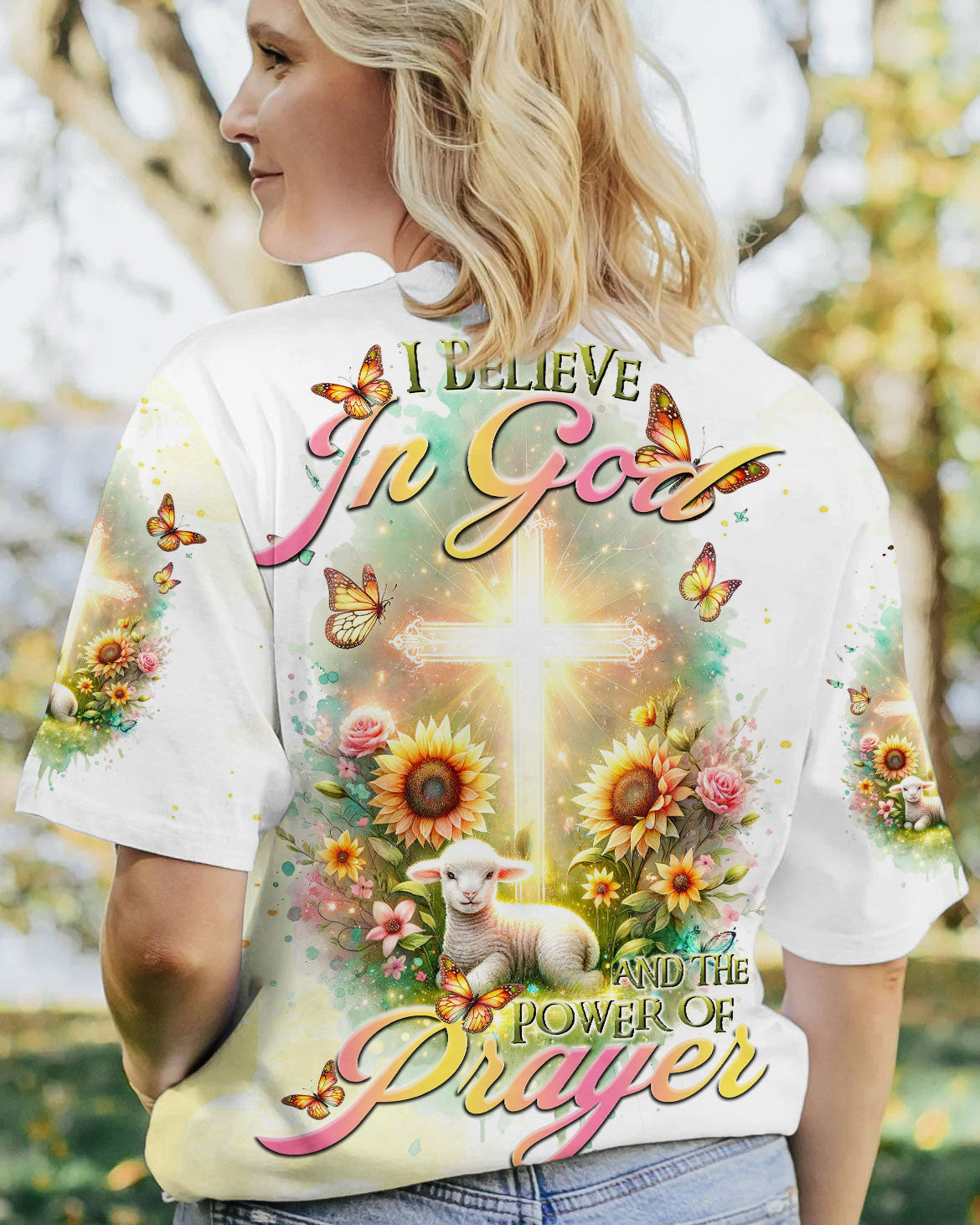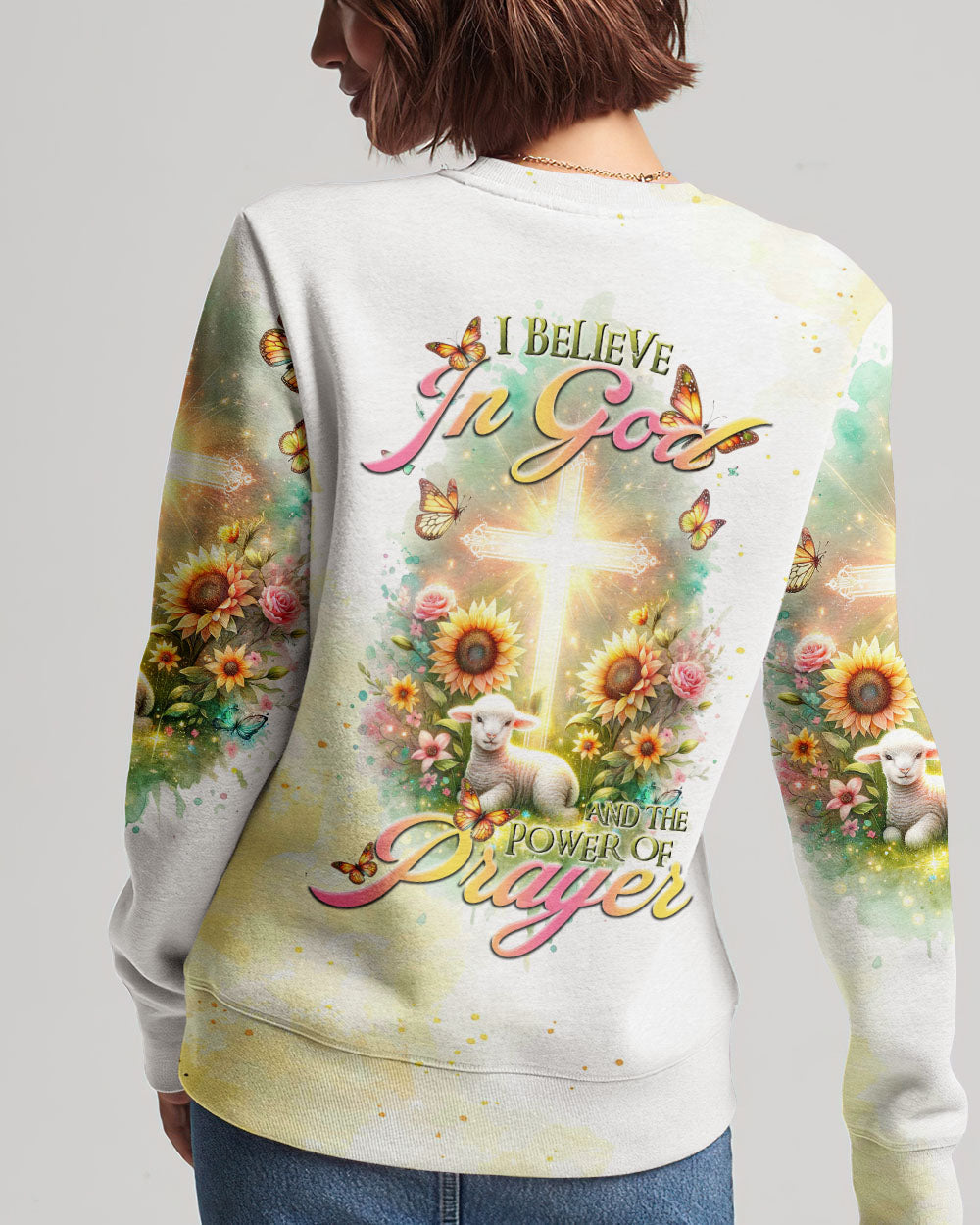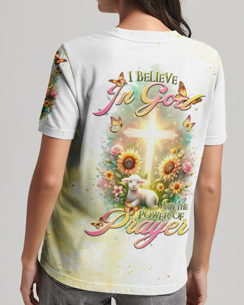 Elevate your spiritual space with our tranquil design featuring a glowing cross, bright flowers, and a gentle lamb, capturing the essence of faith. The saying, "I believe in God and the power of prayer," signifies a deep connection to God and the transformative strength found in prayer, encouraging unwavering trust in divine guidance and the comforting power of heartfelt communication with the divine.