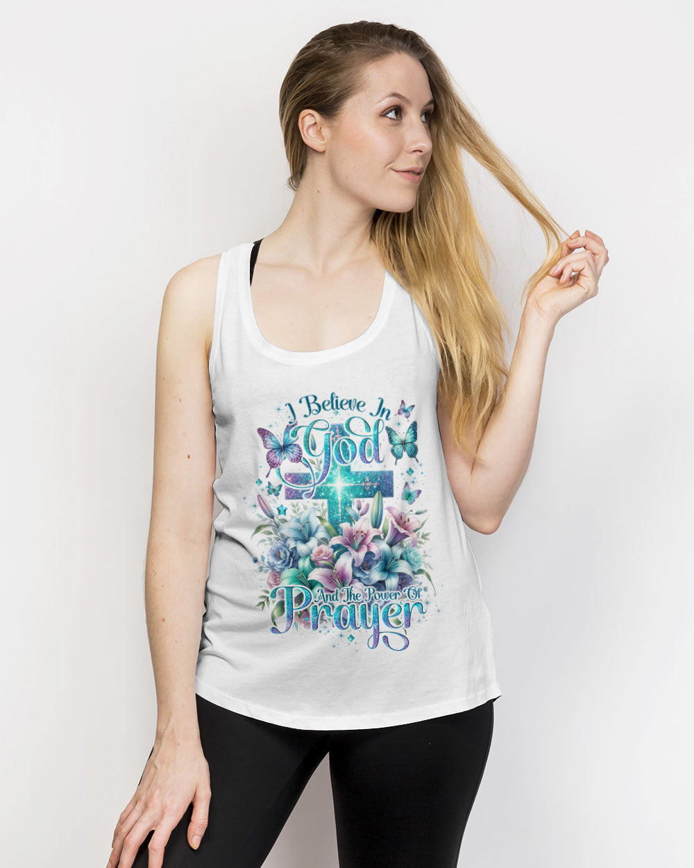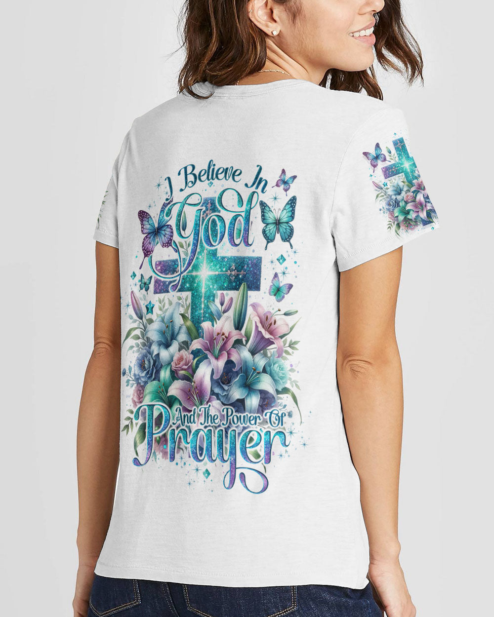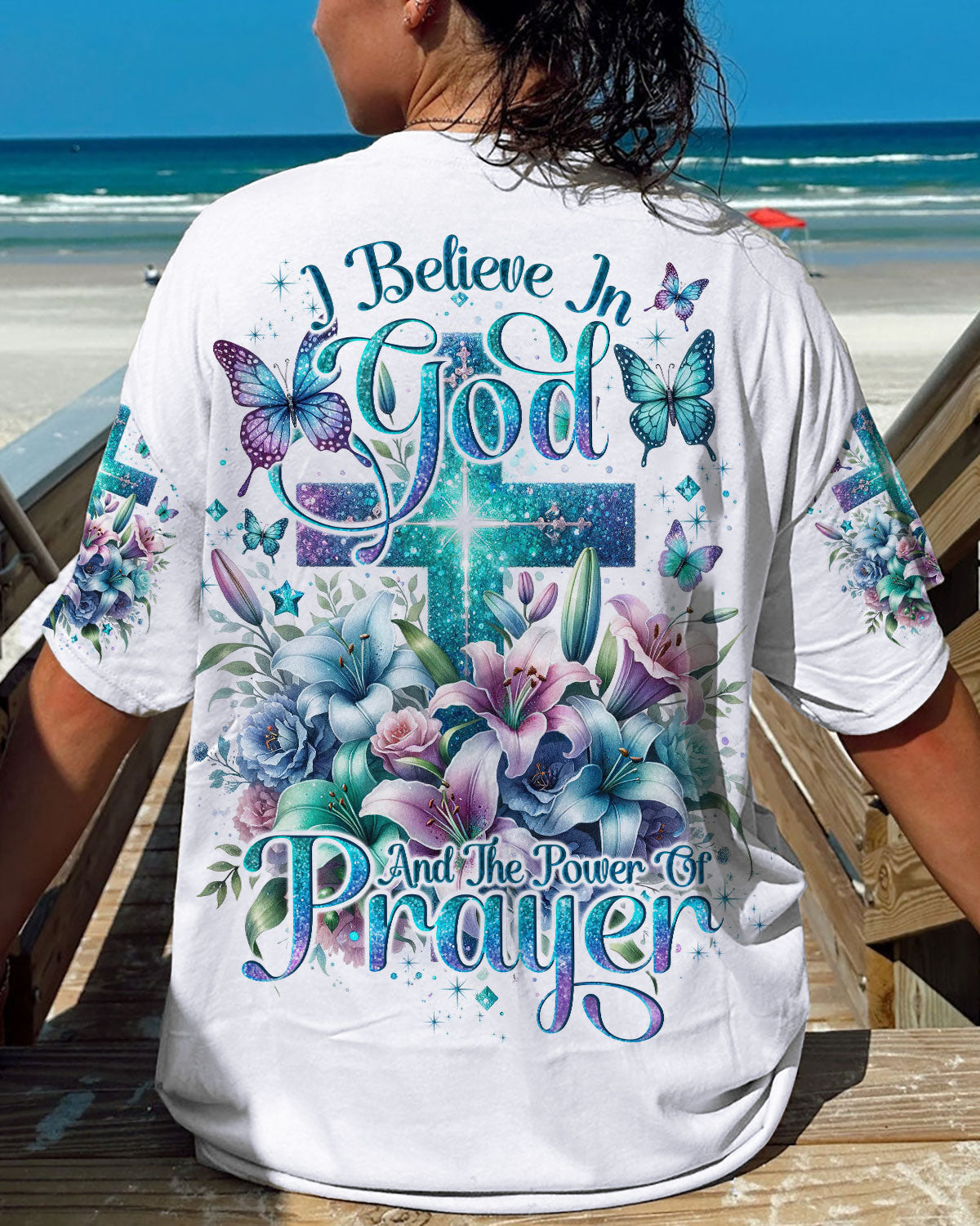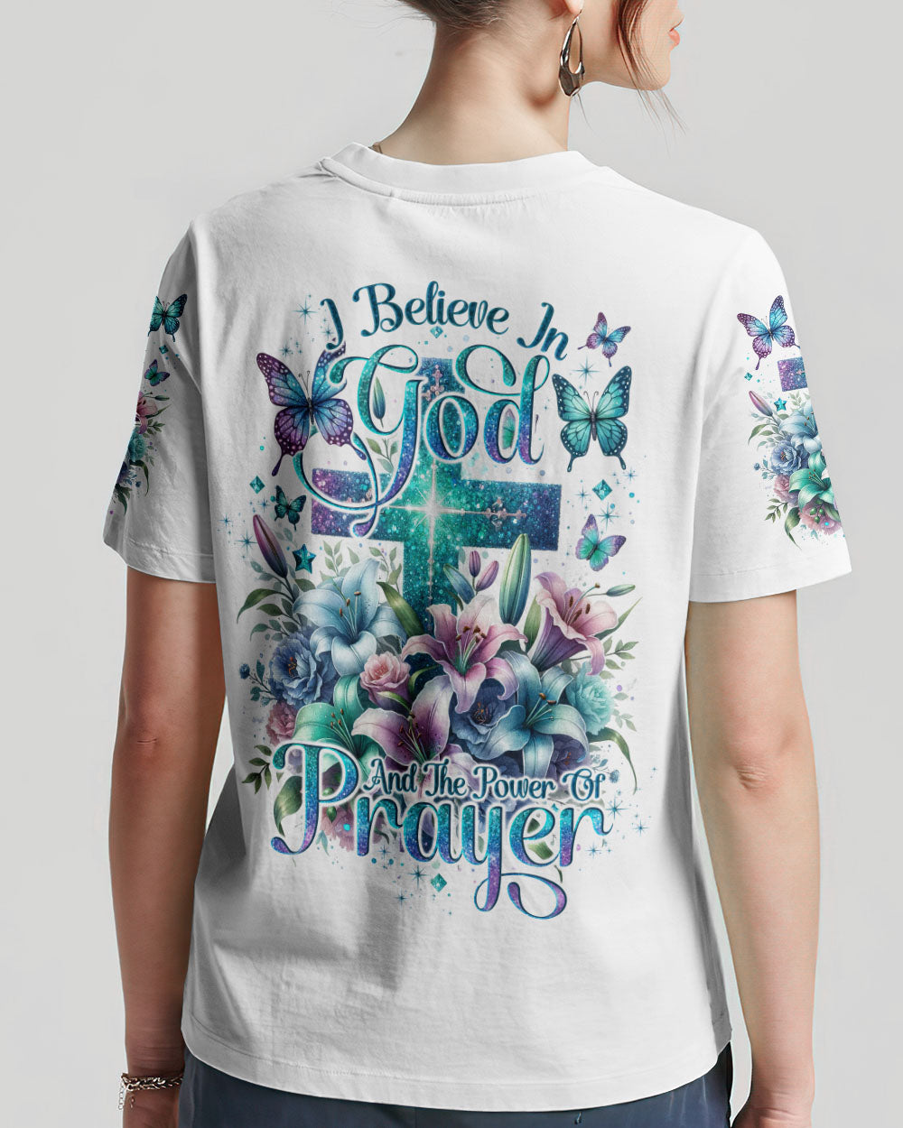 This all-over-print I Believe In God Women's Shirt features a stunning design of a vibrant cross intertwined with blooming lilies, representing faith in Jesus and the power of prayer. The message conveys trust in the divine and reliance on prayer to find solace, guidance and strength to face life's challenges. Reaffirm your faith with this powerful reminder of God's grace.