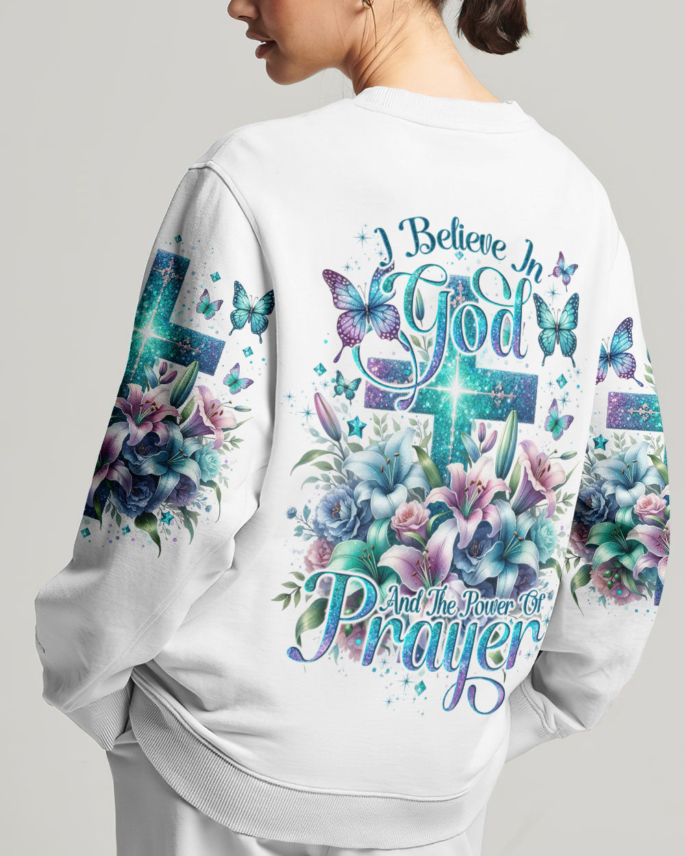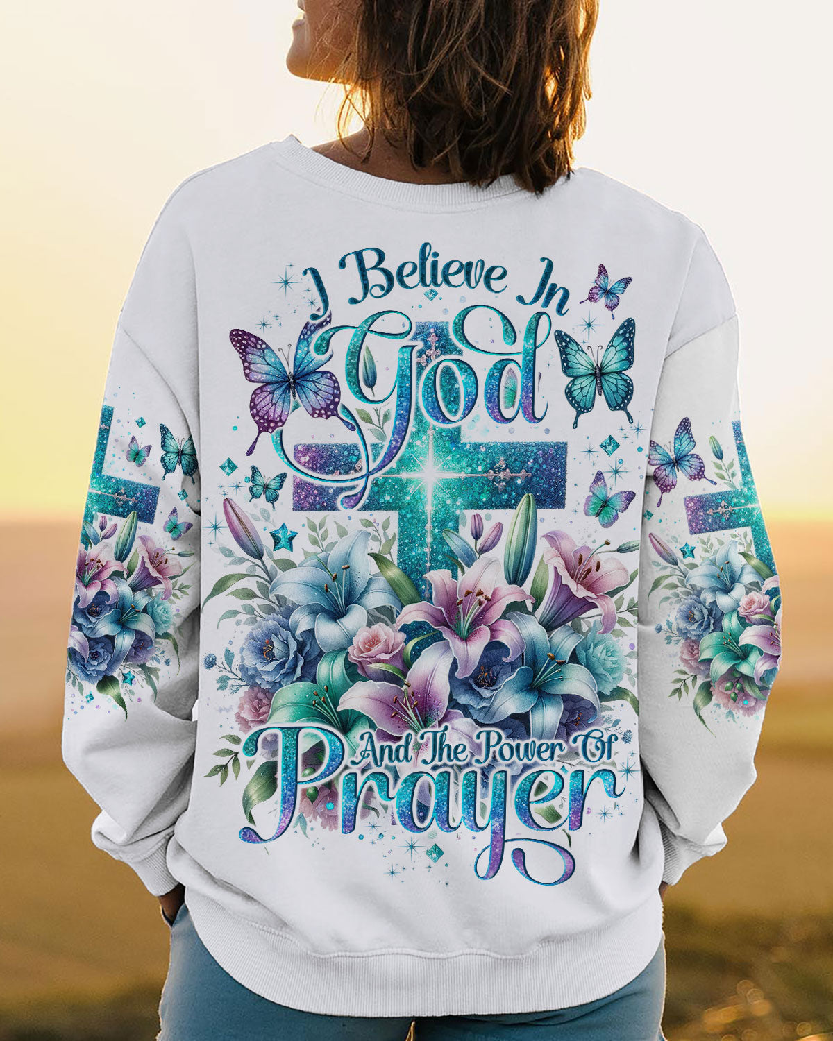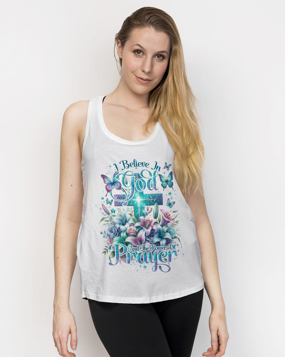 This all-over-print I Believe In God Women's Shirt features a stunning design of a vibrant cross intertwined with blooming lilies, representing faith in Jesus and the power of prayer. The message conveys trust in the divine and reliance on prayer to find solace, guidance and strength to face life's challenges. Reaffirm your faith with this powerful reminder of God's grace.