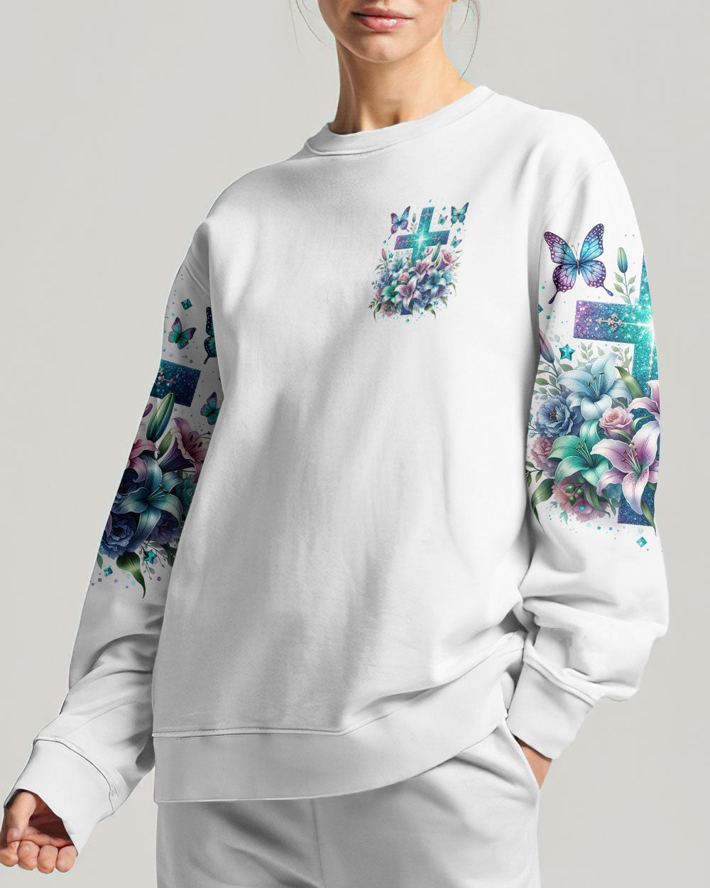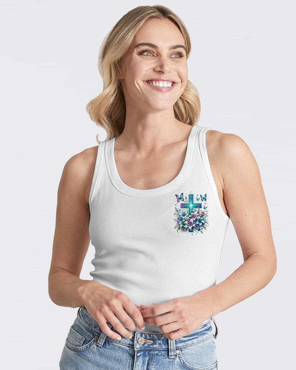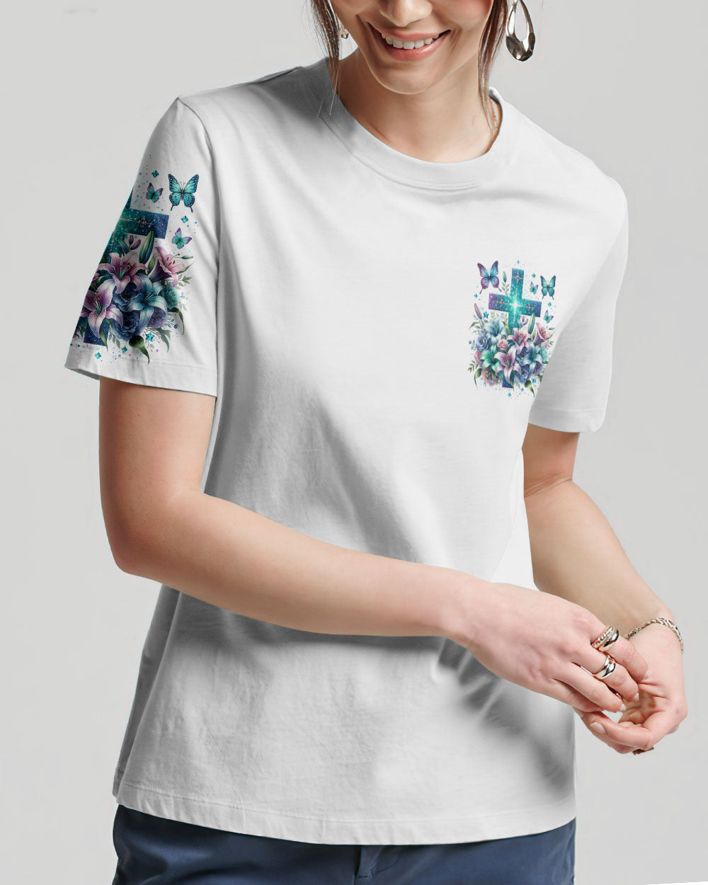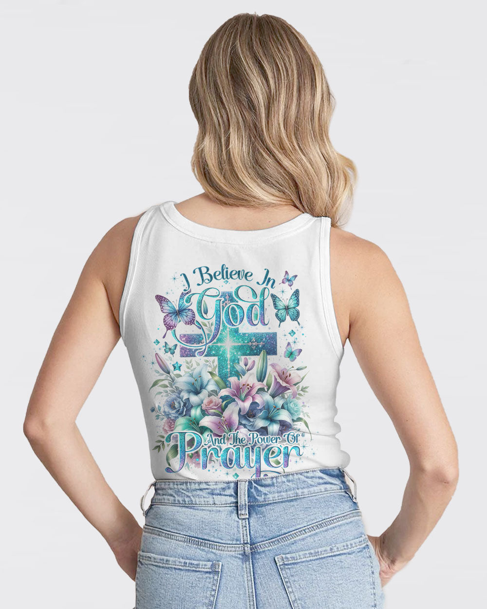 This all-over-print I Believe In God Women's Shirt features a stunning design of a vibrant cross intertwined with blooming lilies, representing faith in Jesus and the power of prayer. The message conveys trust in the divine and reliance on prayer to find solace, guidance and strength to face life's challenges. Reaffirm your faith with this powerful reminder of God's grace.