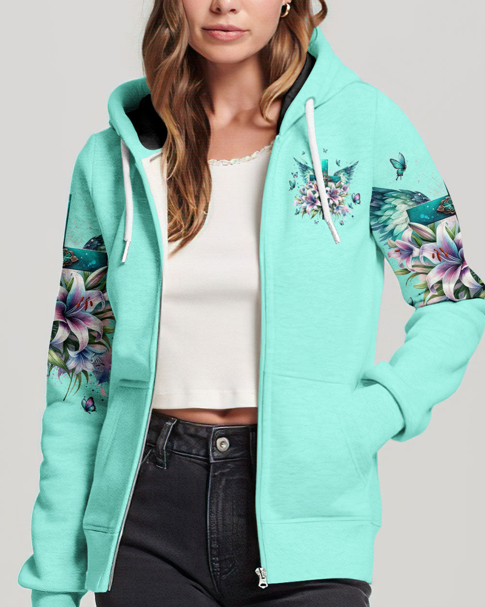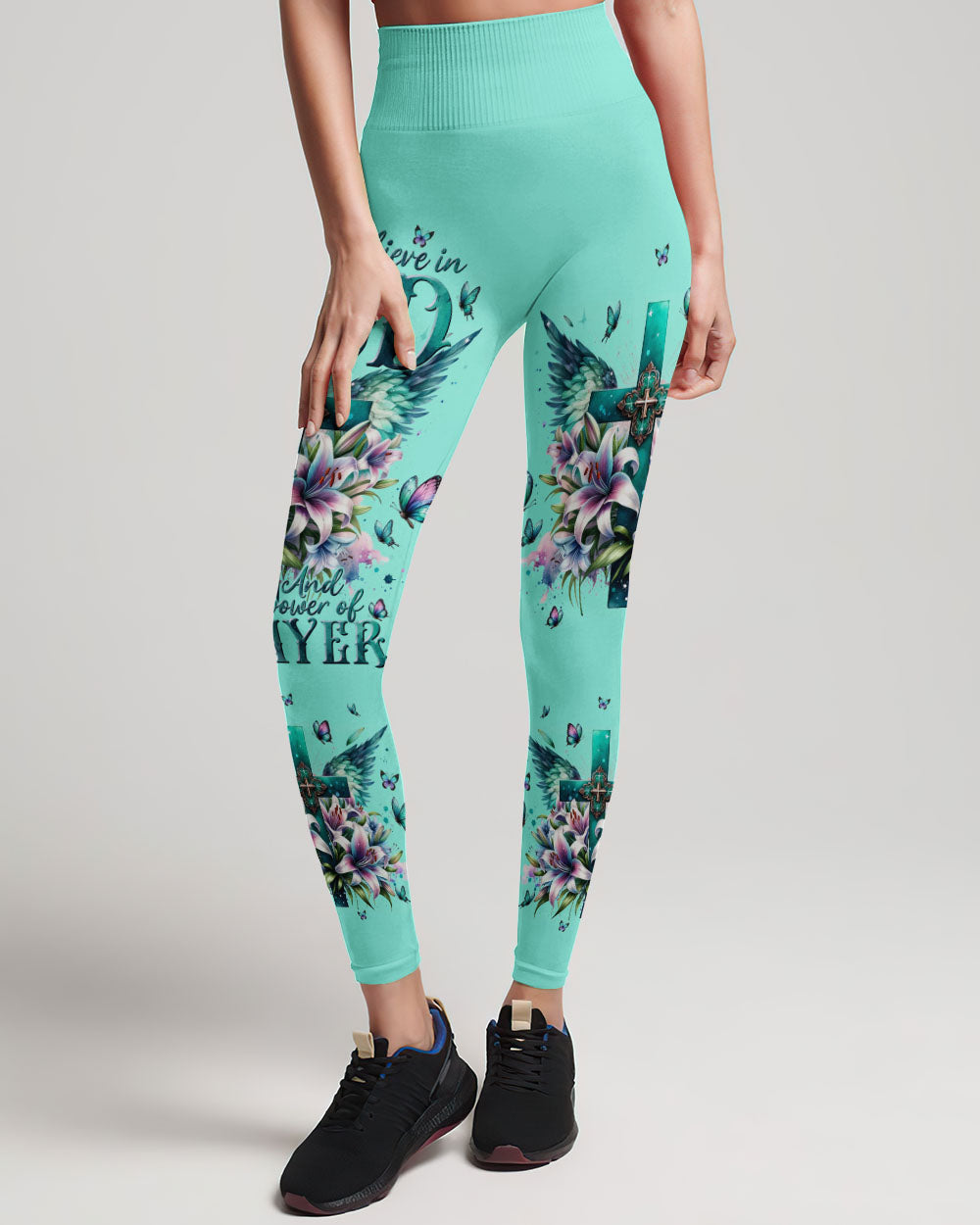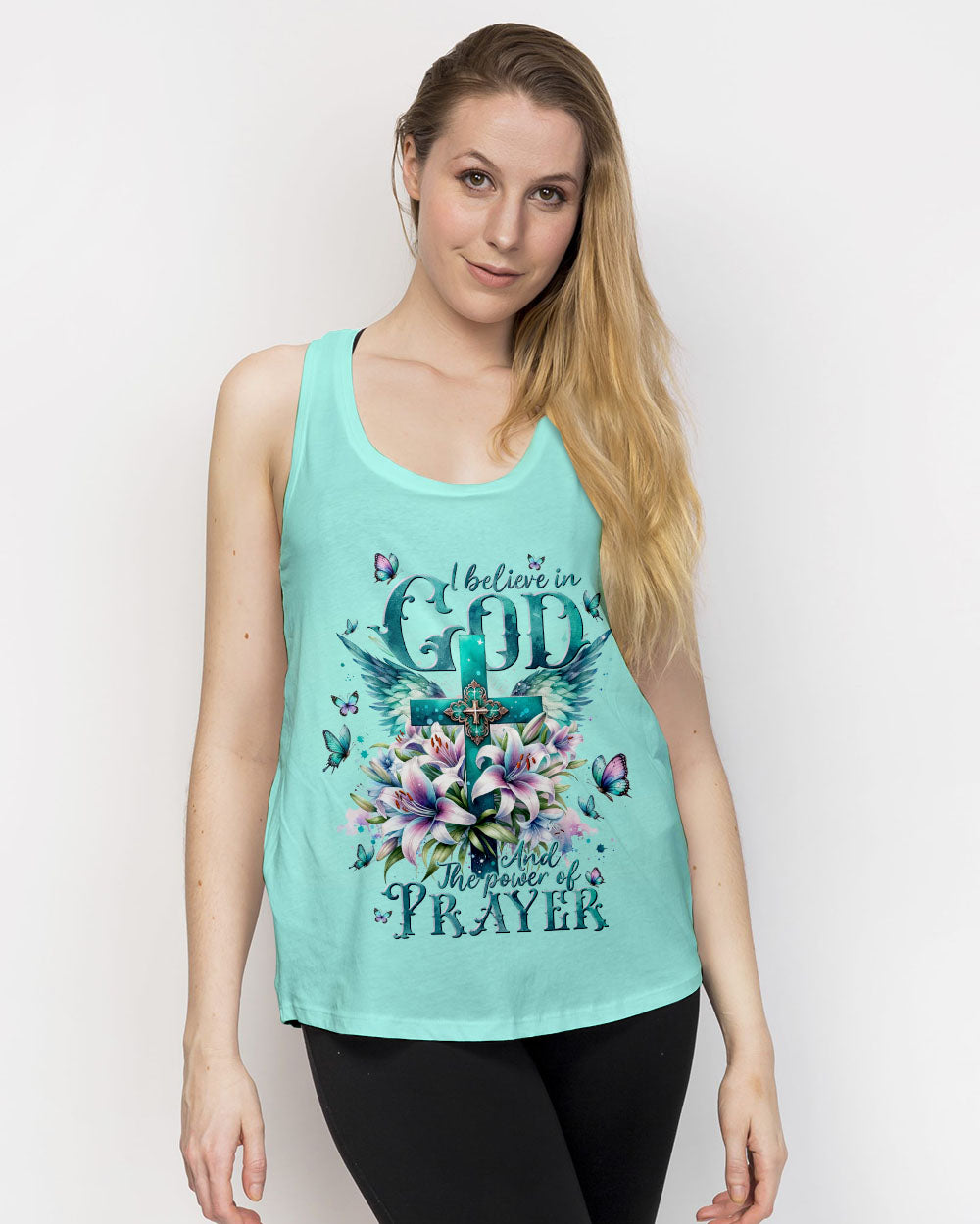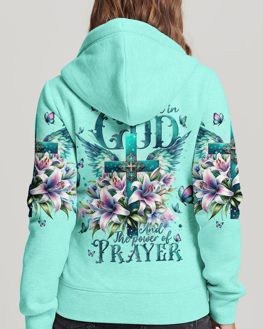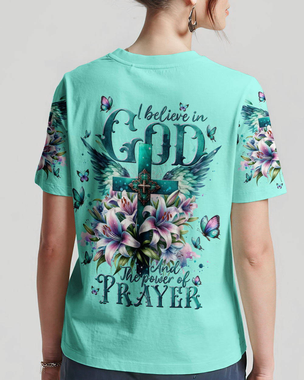 This graceful all-over print shirt features a stunning design of a cross and lilies, with a meaningful phrase, “I believe in God and the power of prayer.” Its expression of faith is sure to add a beautiful and uplifting touch to any outfit.