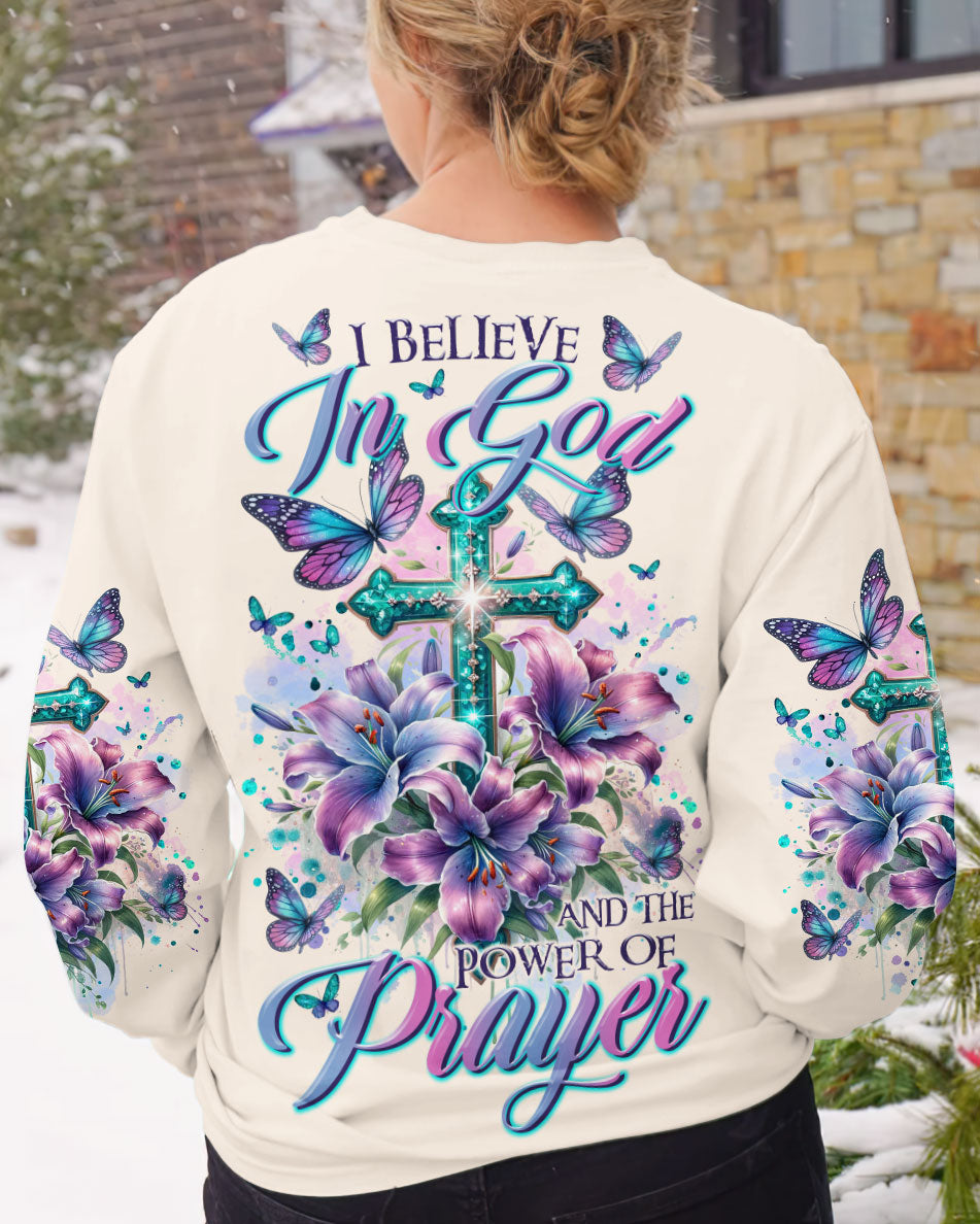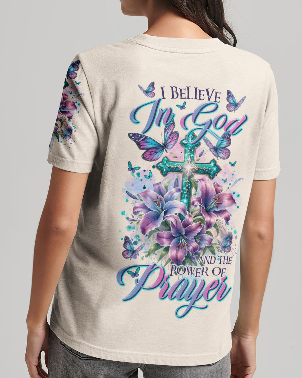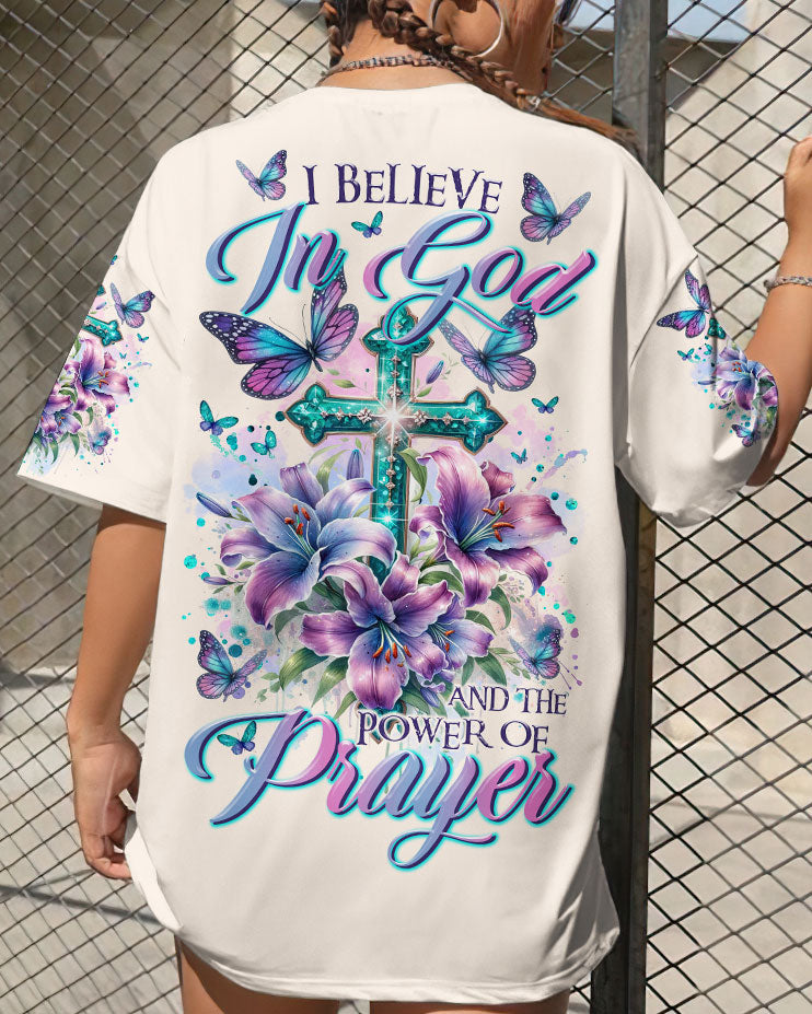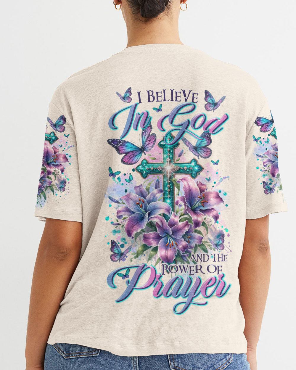 This beautiful I Believe In God Women's All Over Print Shirt is crafted with a stunning cross design, featuring elegant lilies and a powerful message of faith. With the saying, "I believe in God and the power of prayer," this shirt serves as an inspiring reminder of hope and comfort to find in communion with God. Let your faith be known with this one-of-a-kind design!