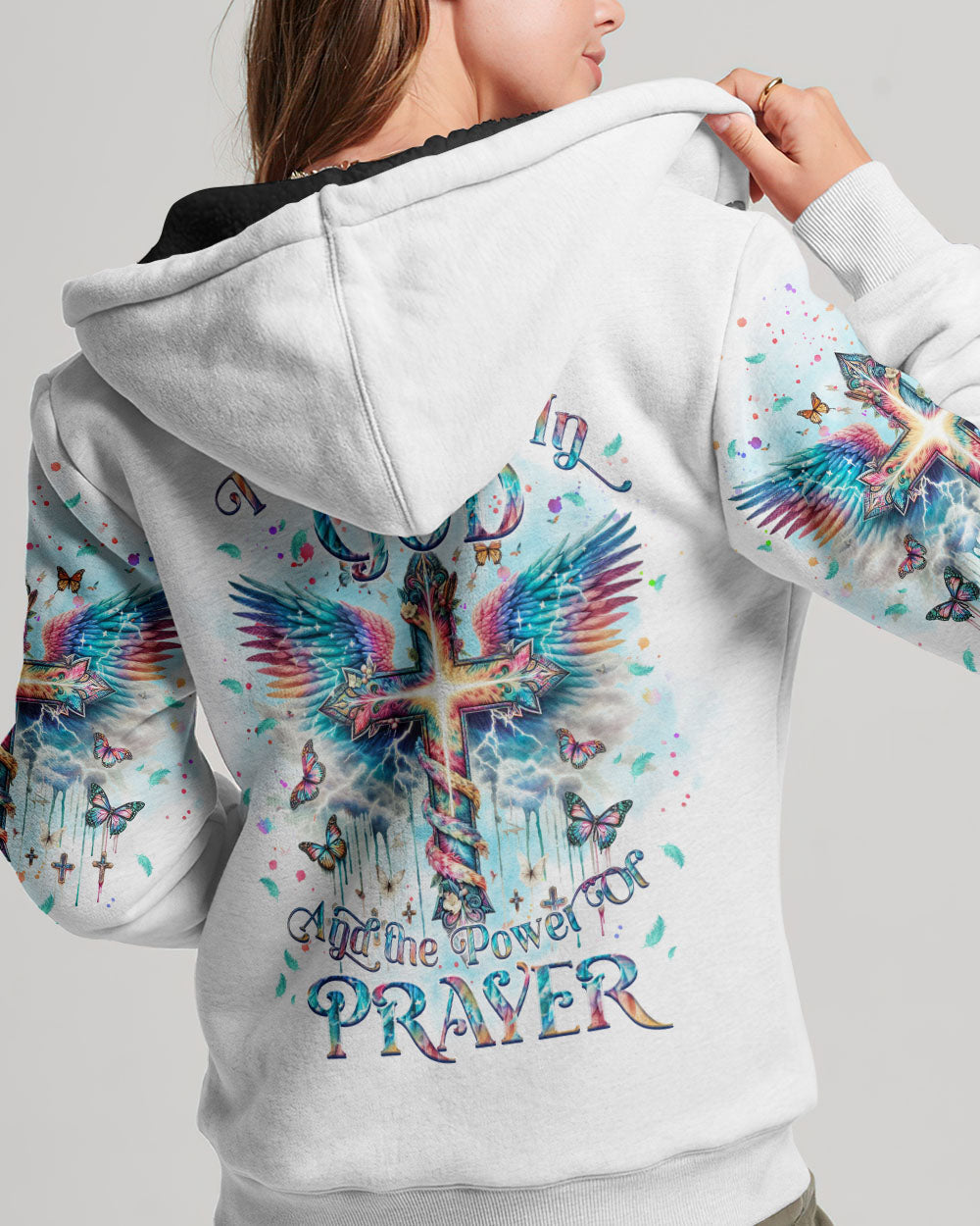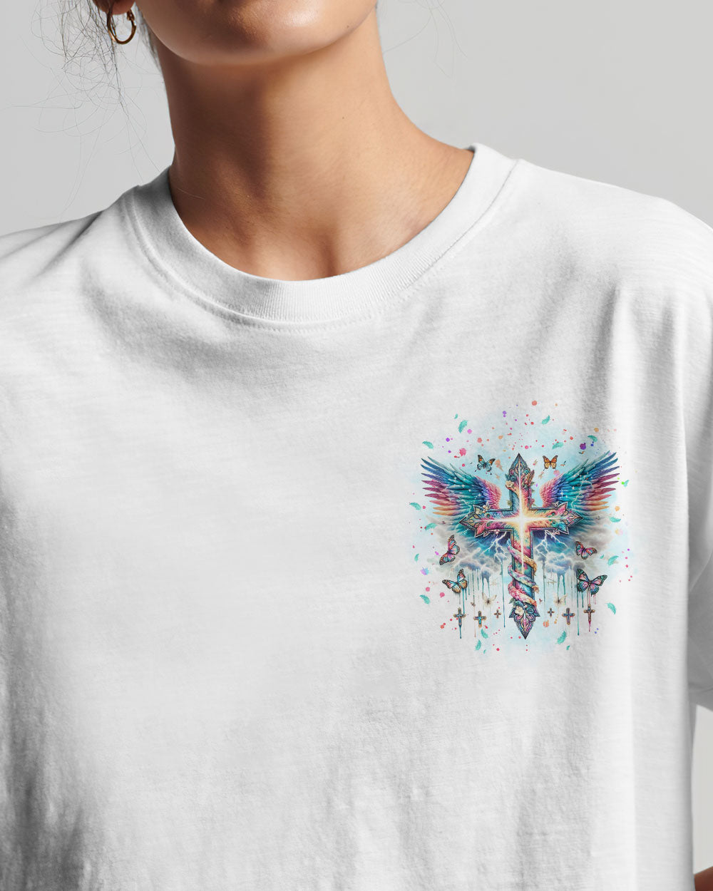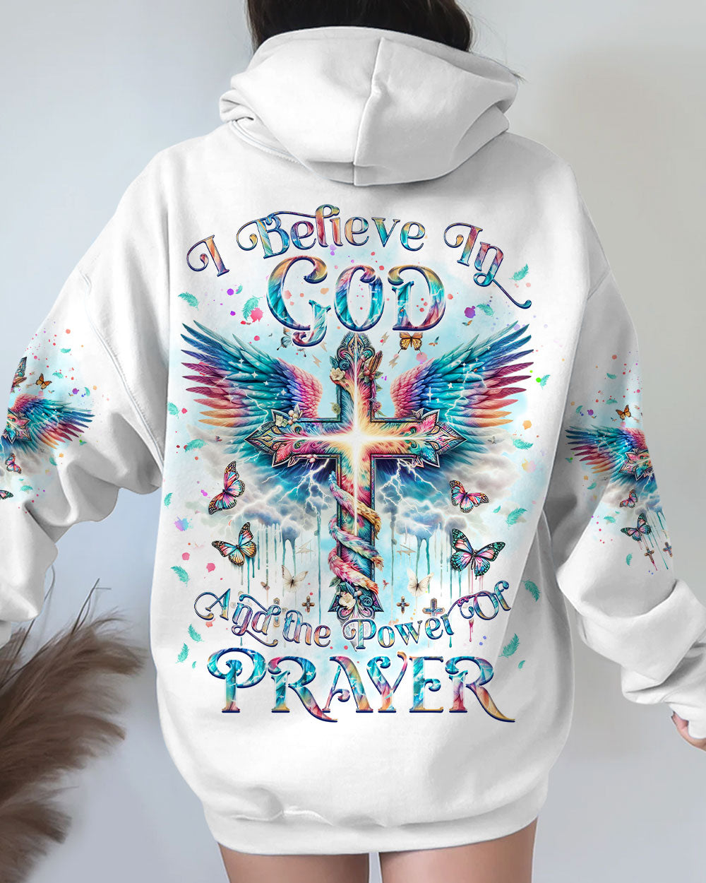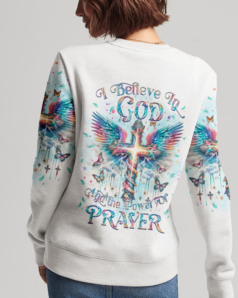 Celebrate your faith with our Faith Christ Design shirt. This luminous design features a majestic winged cross, the symphony of thunders and delicate butterflies, and the powerful quote, "I believe in God and the power of prayer." Embrace the divine and make a statement of unwavering belief with this wearable prayer. Order now and let your fashion become a testament to your faith!