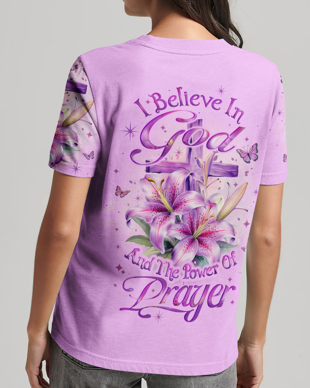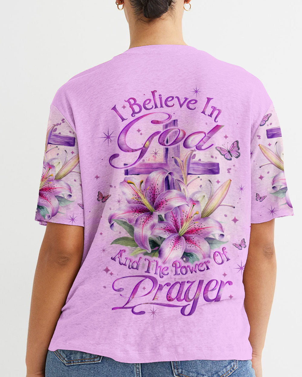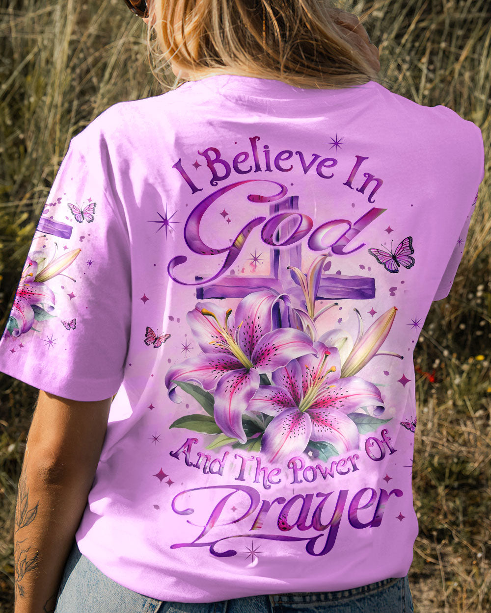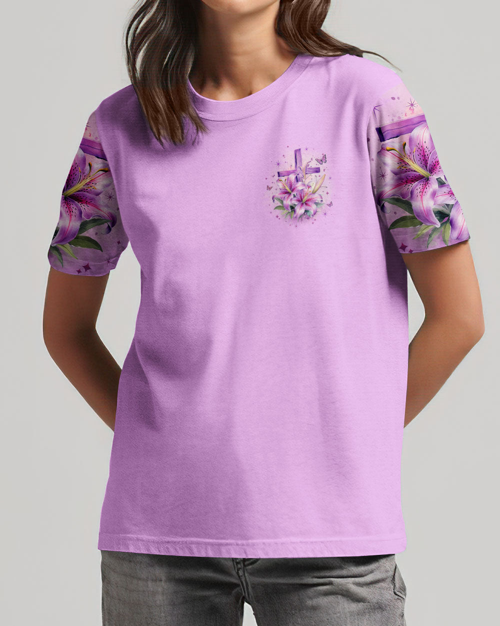 Feel the power of faith with our I Believe In God Women's All Over Print Shirt. The radiant Faith Christ design on this shirt is adorned with lily flowers, butterflies, and a cross, creating a symbol of divine beauty. Express your spiritual journey and let your faith light the way.